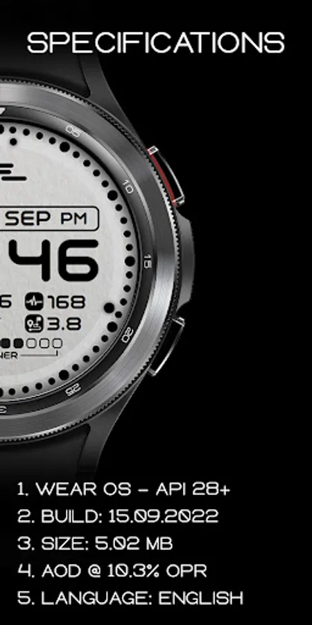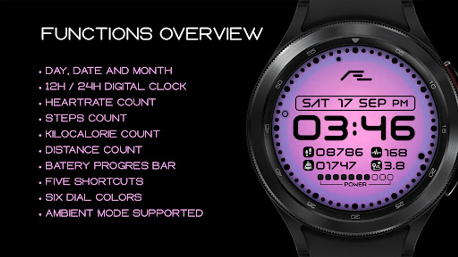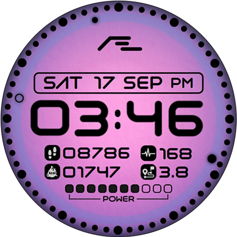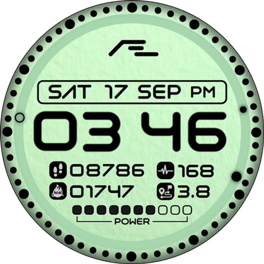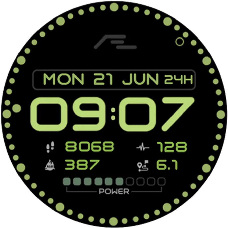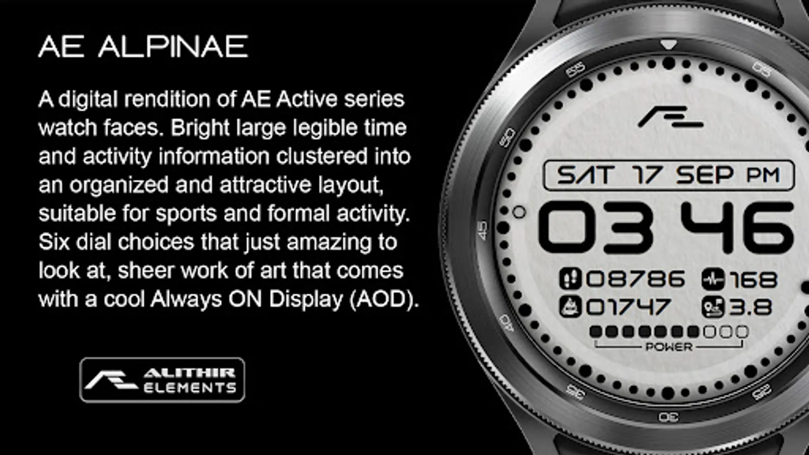 A digital rendition of AE Active series watch faces. Bright large legible time and activity information clustered into an organized and attractive layout, suitable for sports and formal activity. Six dial choices that just amazing to look at, sheer work of art that comes with a cool Always ON Display (AOD).
