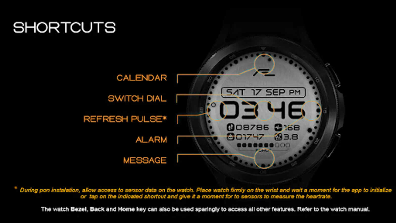 During installation, allow access to sensor data on the watch. Paired with phone app, place watch firmly on the wrist and wait a moment for the app to initialize the Heartrate or double tap the shortcut and give it a moment for the watch to measure. Refer to store listings screenshots to identify the shortcut locations