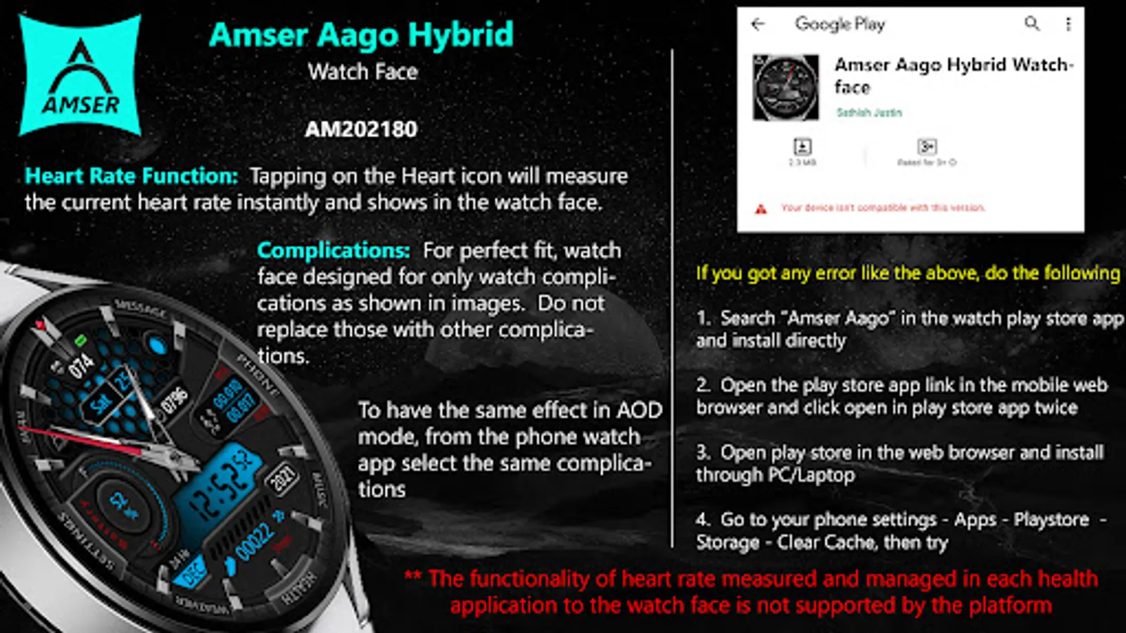 - If you are having synchronization problems between your phone and Play Store, install the app directly from watch: search "Amser" from Play Store on watch and hit on install button