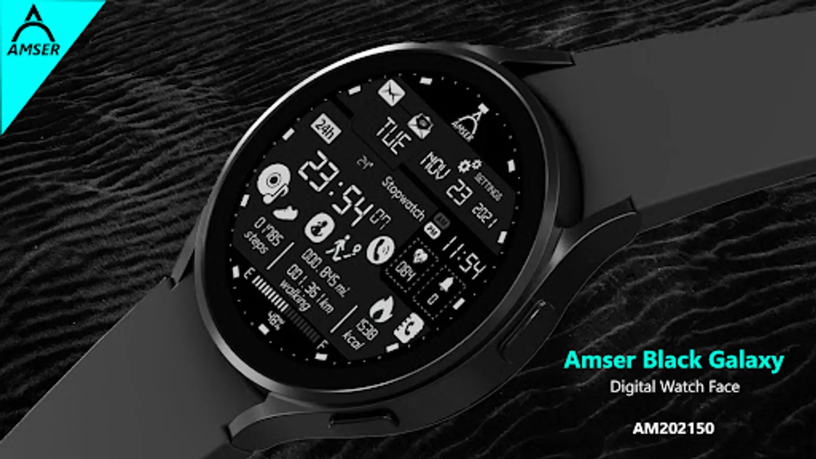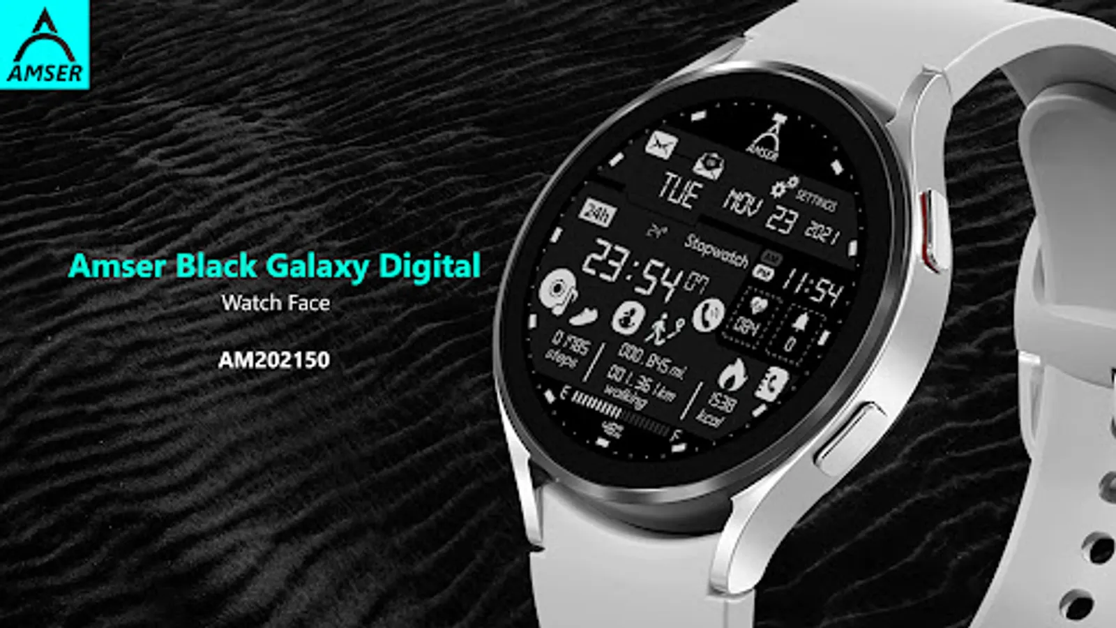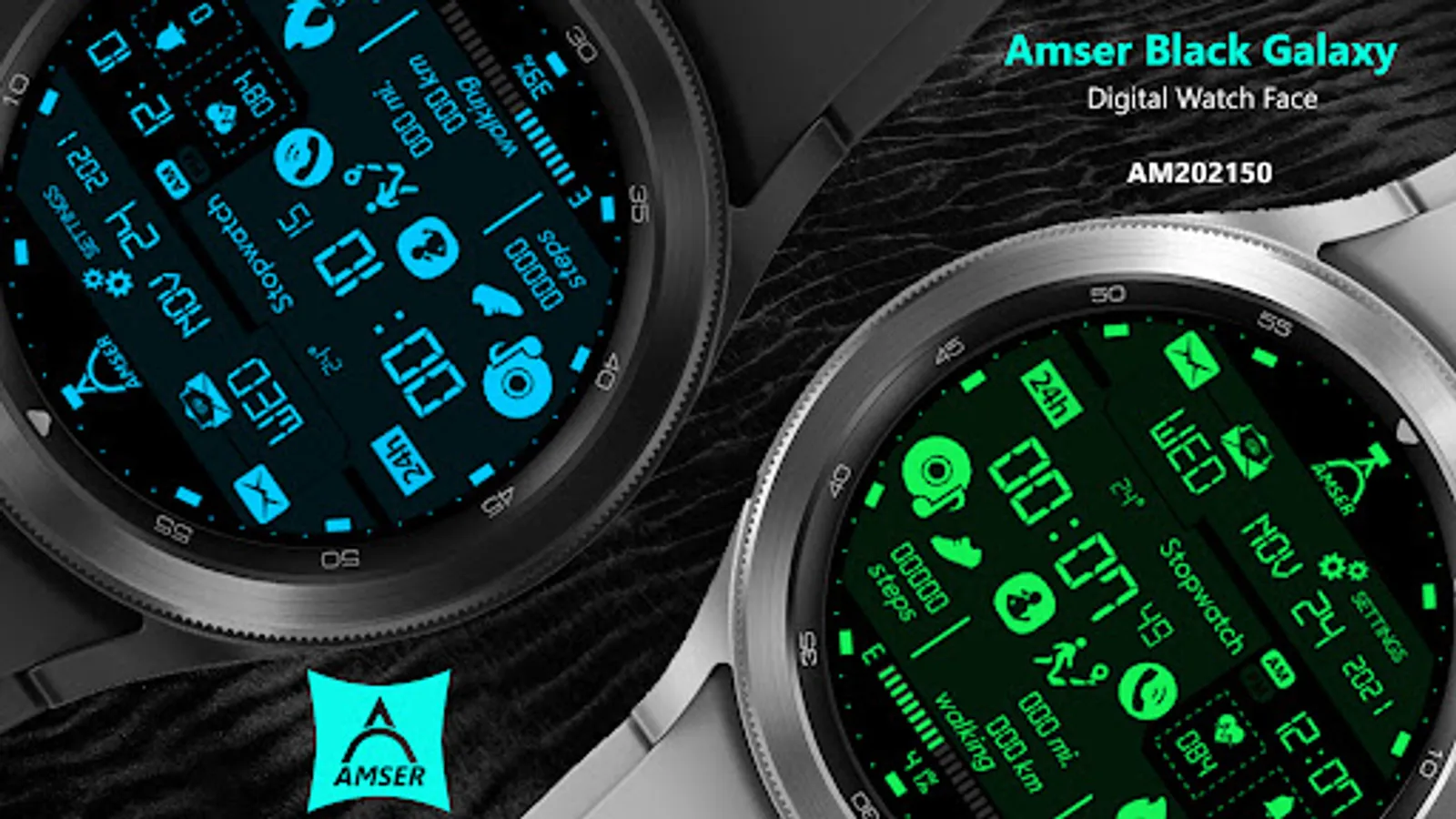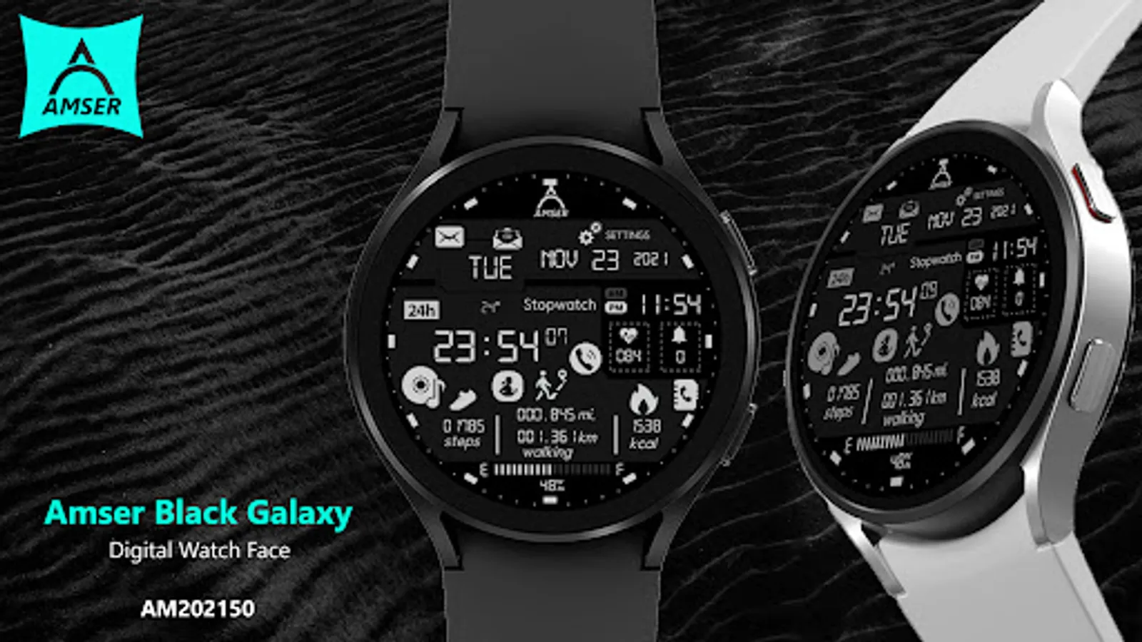 Amser Black Galaxy Digital Watch Face for Wear OS which supports Samsung Galaxy Watch 4 + Watch Faces for other Wear OS device manufacturers