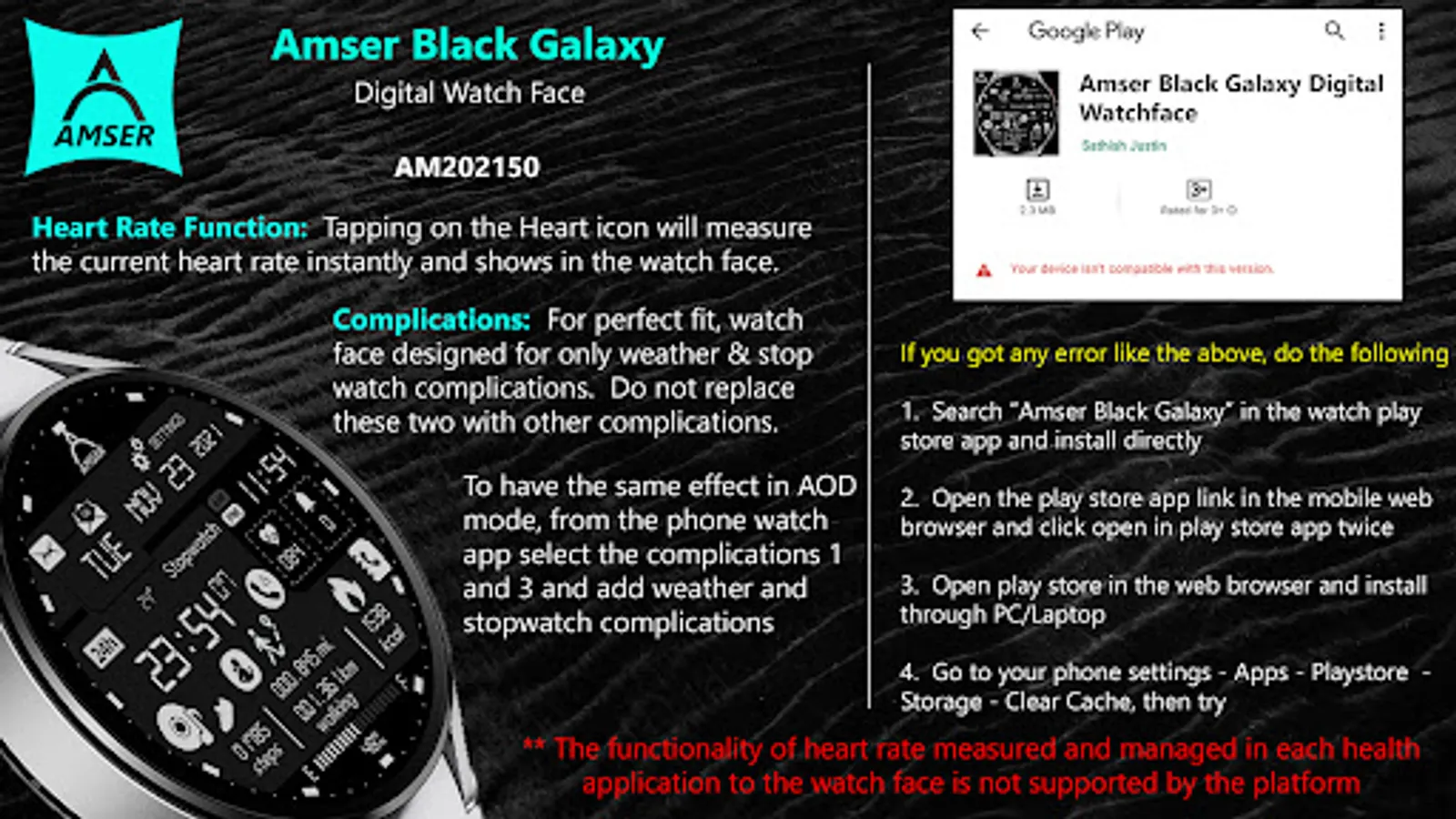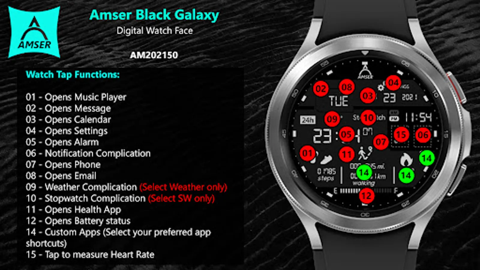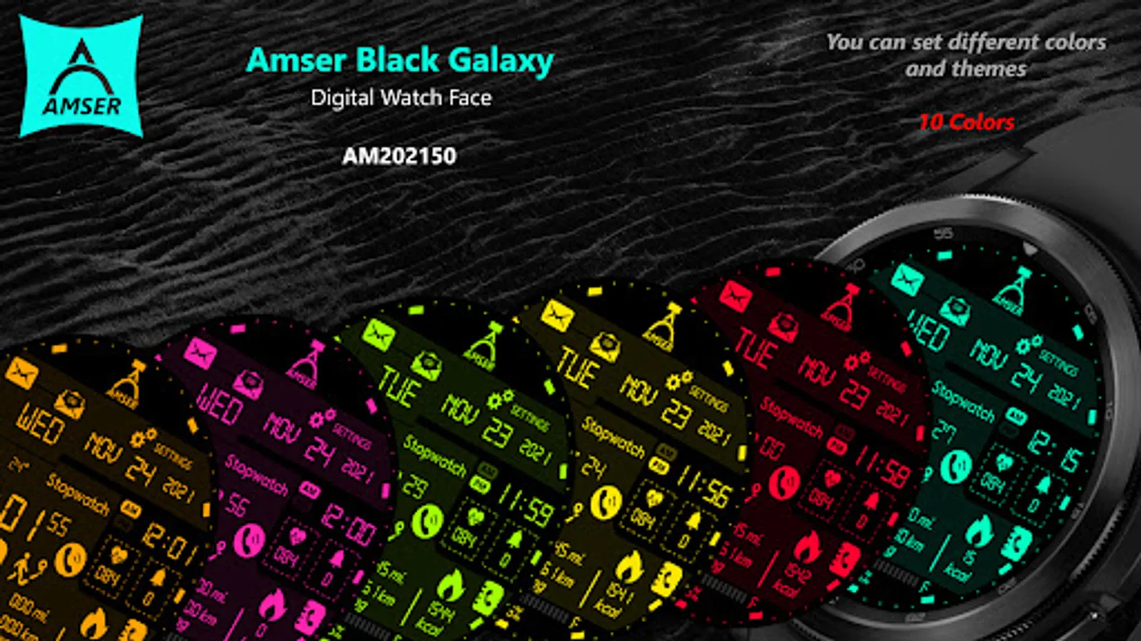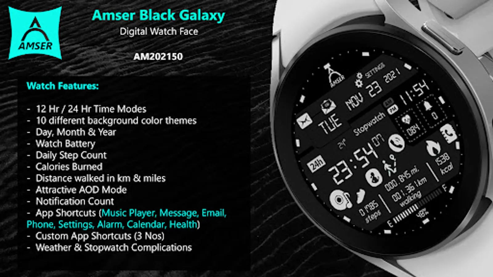 Amser Black Galaxy Digital Watch Face for Wear OS which supports Samsung Galaxy Watch 4 + Watch Faces for other Wear OS device manufacturers