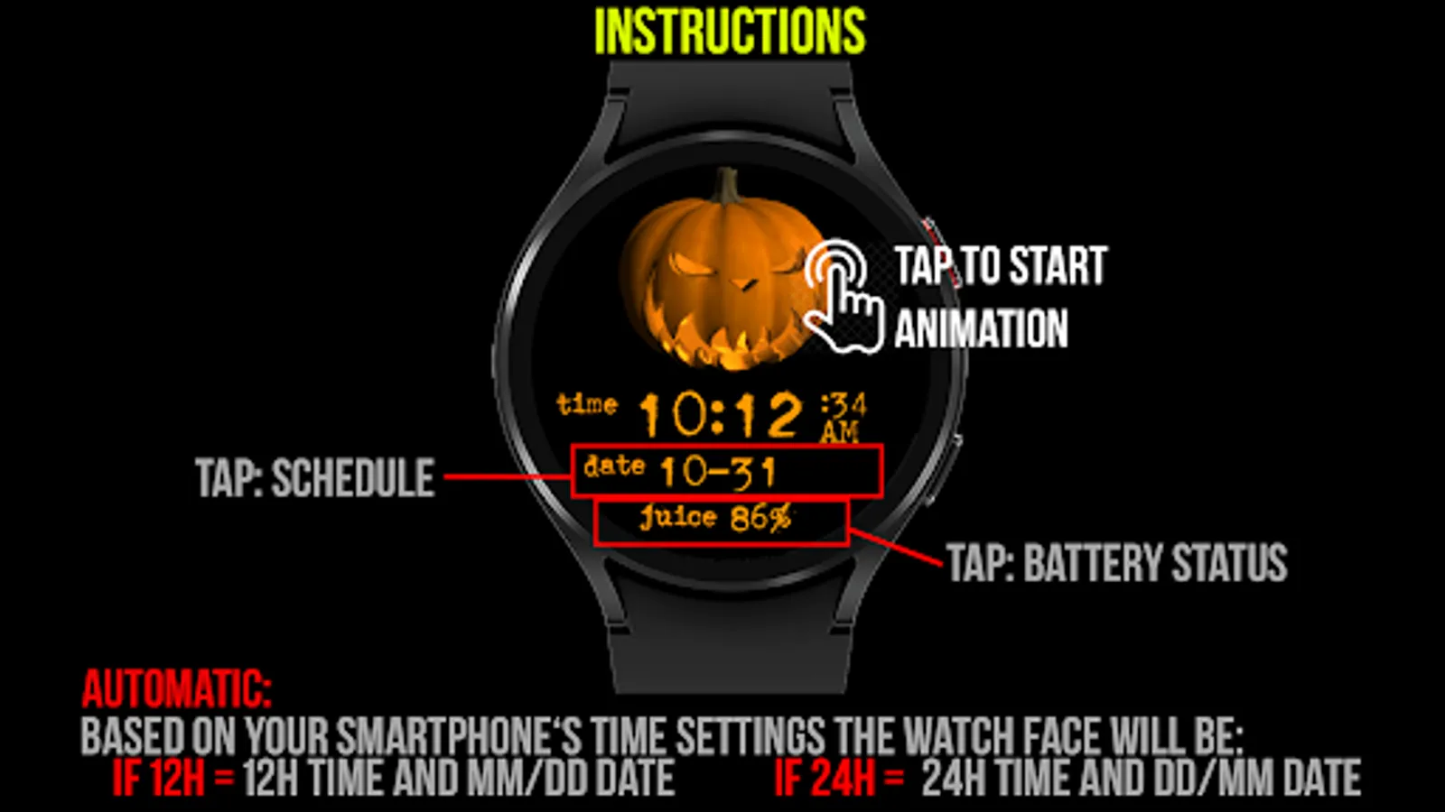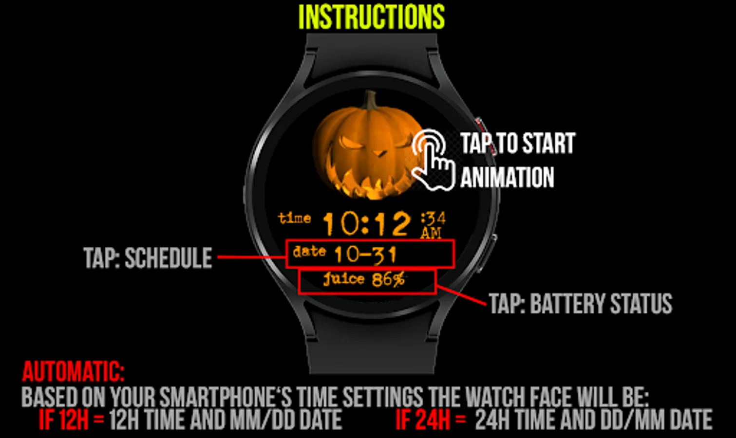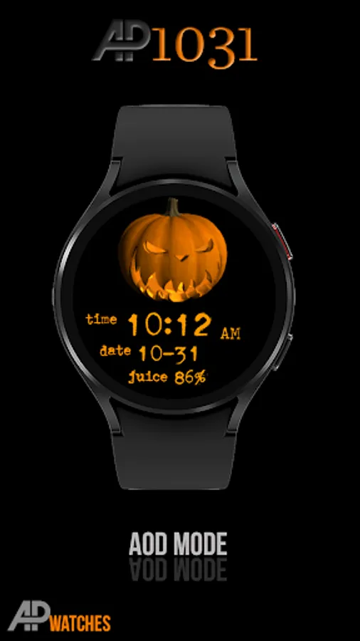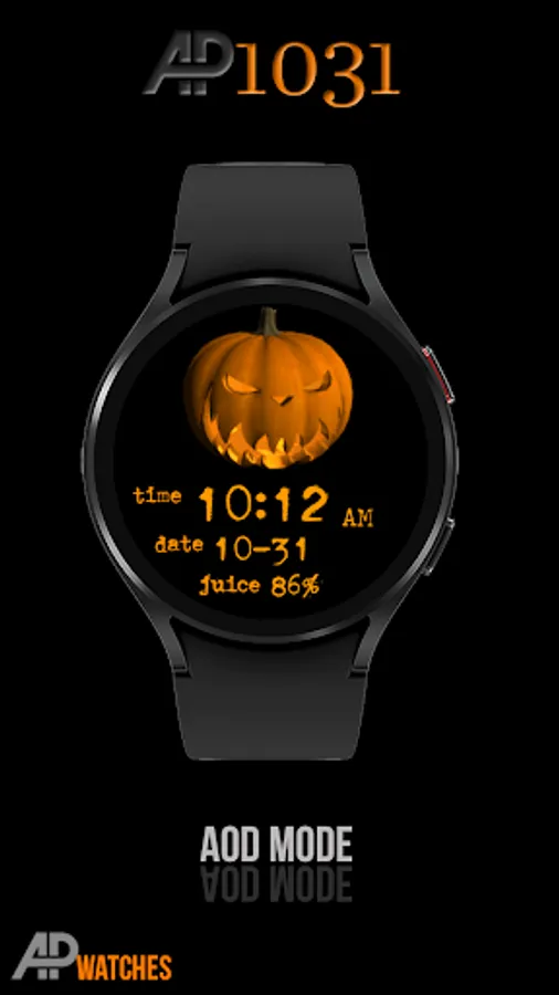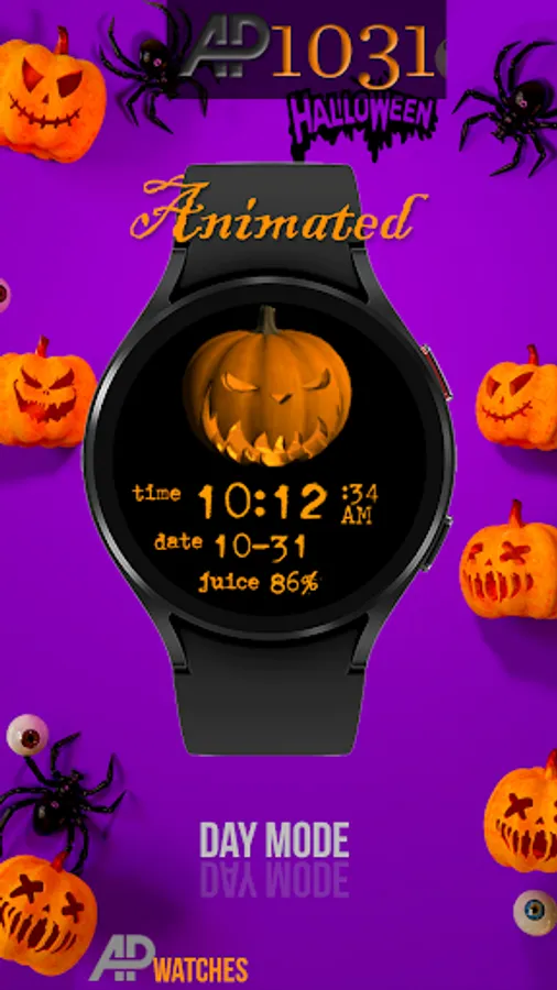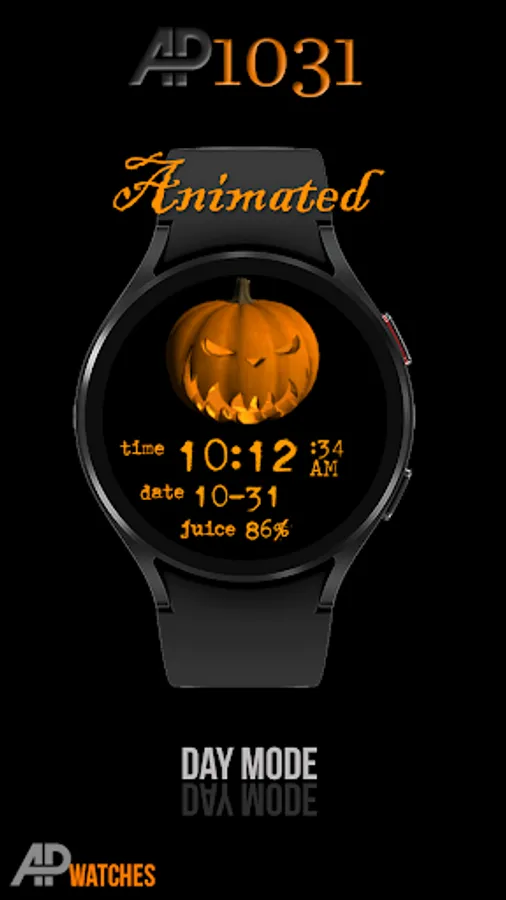 AP1031 Halloween is a spectacular watch face especially made for Halloween. Tap on the pumpking to animate it!