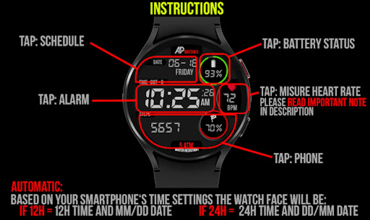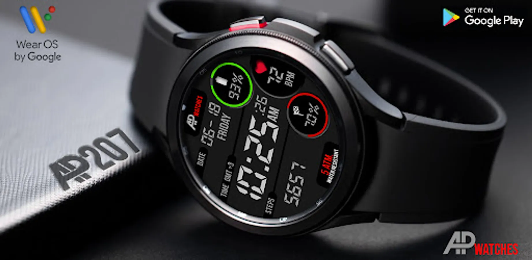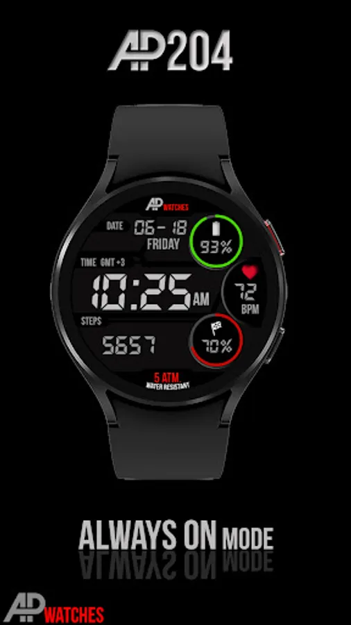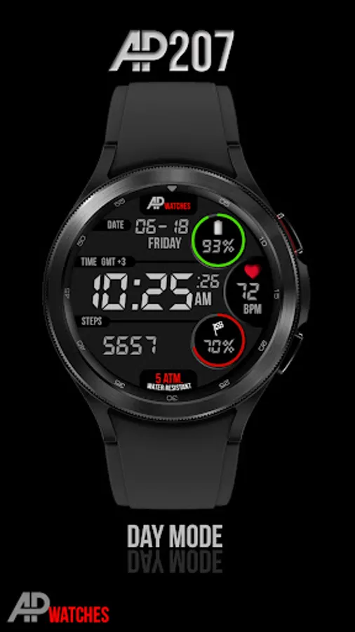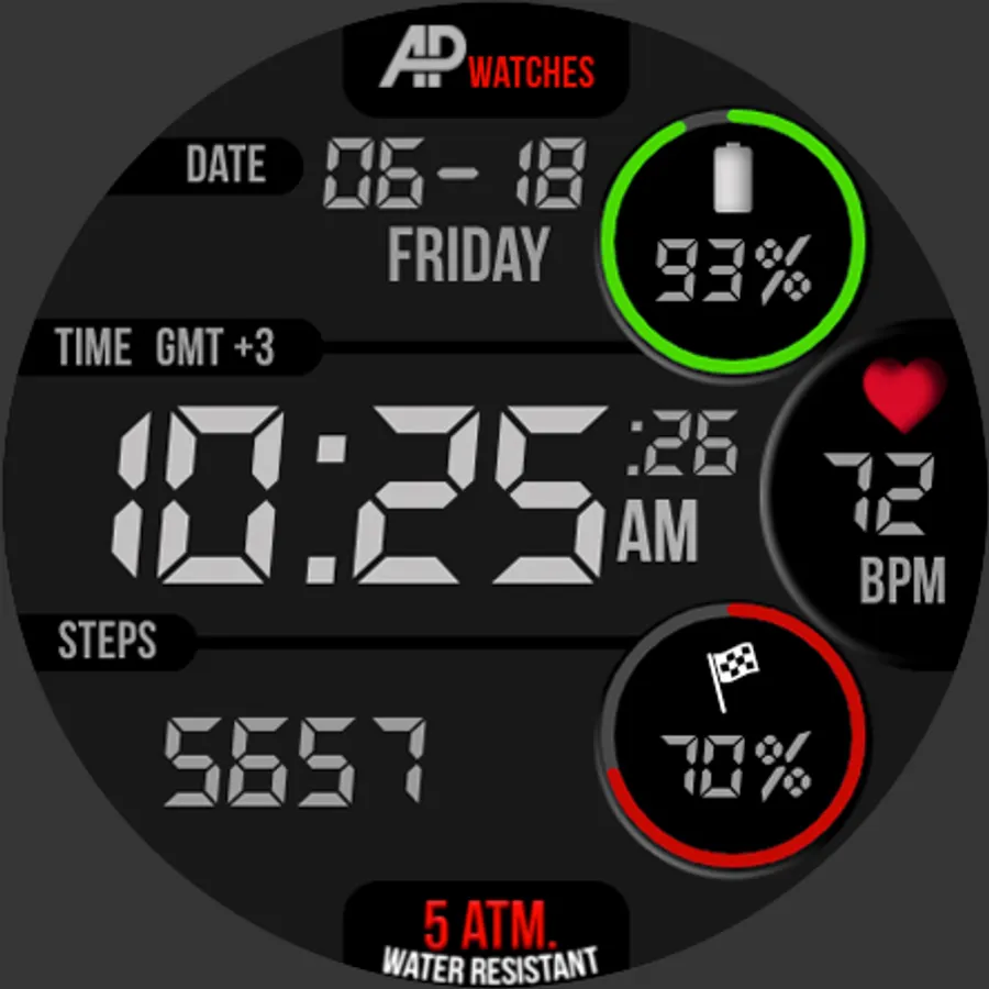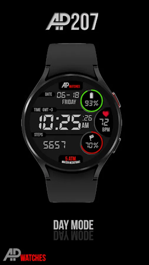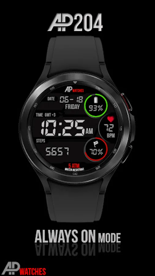 AP207 is a stunning digital watch face with both progress barsa and numerical data for battery steps/goal %. Please see instructions picture for shortcuts.