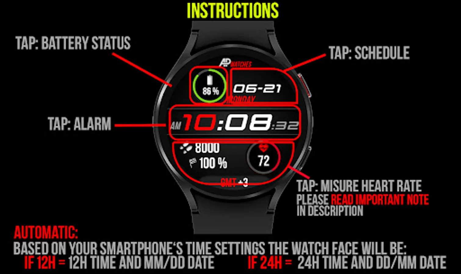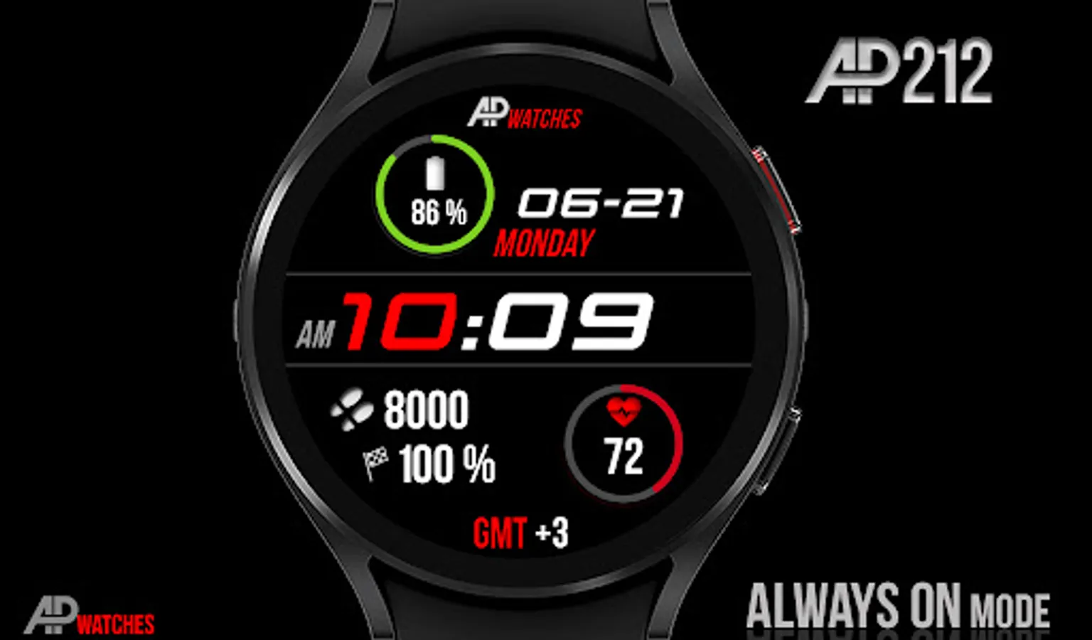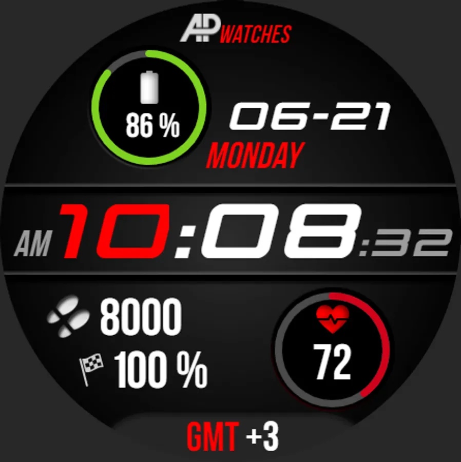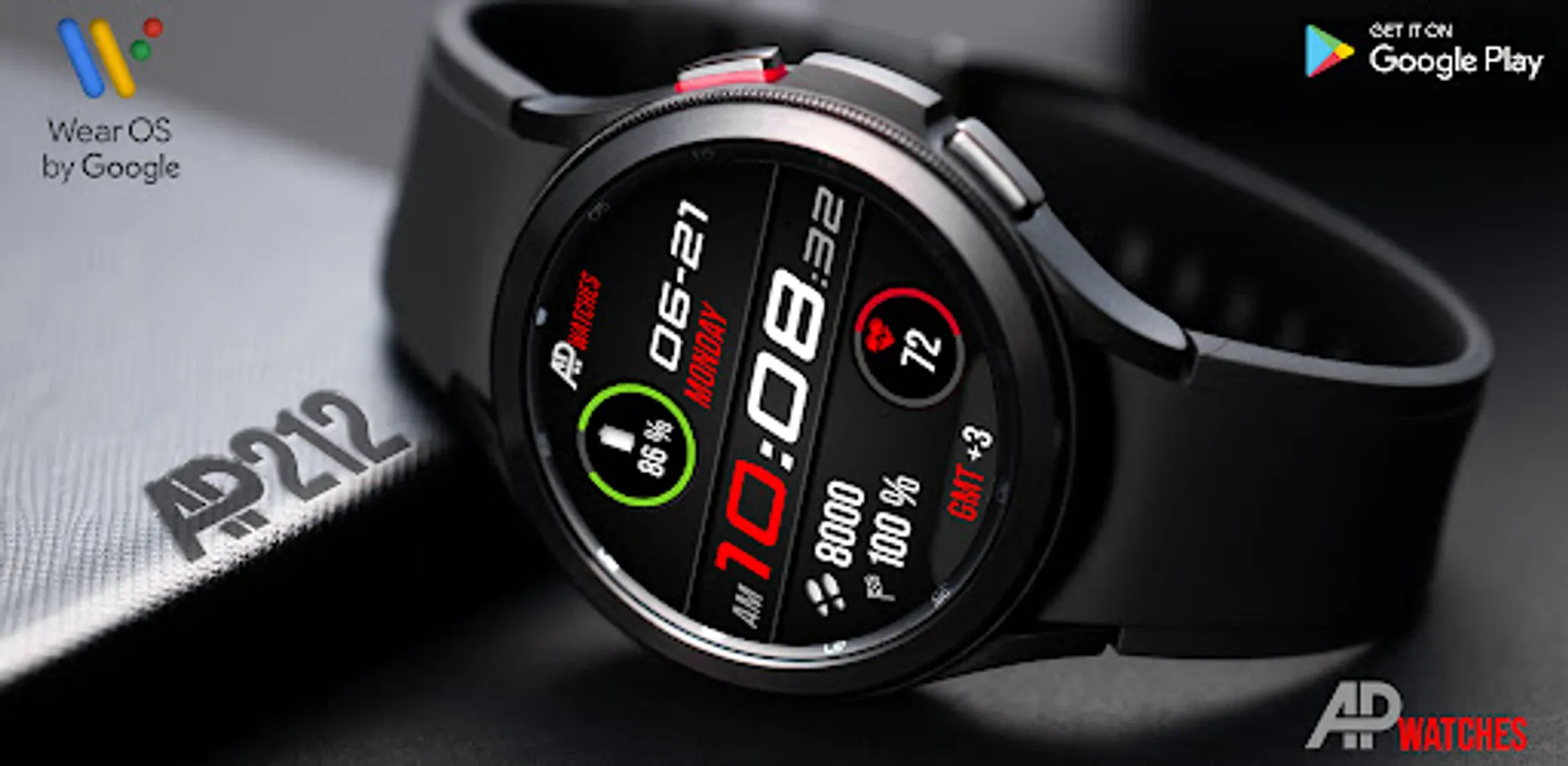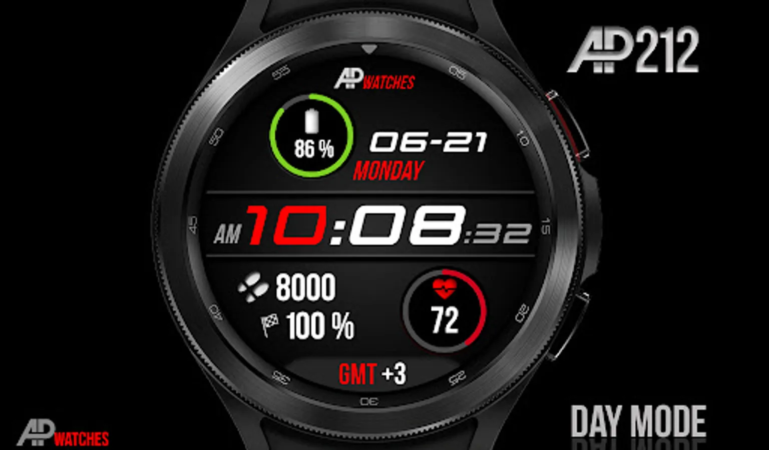 AP212 is a great dark digital watch face for Wear OS based smartwatches (only round smartwatches)