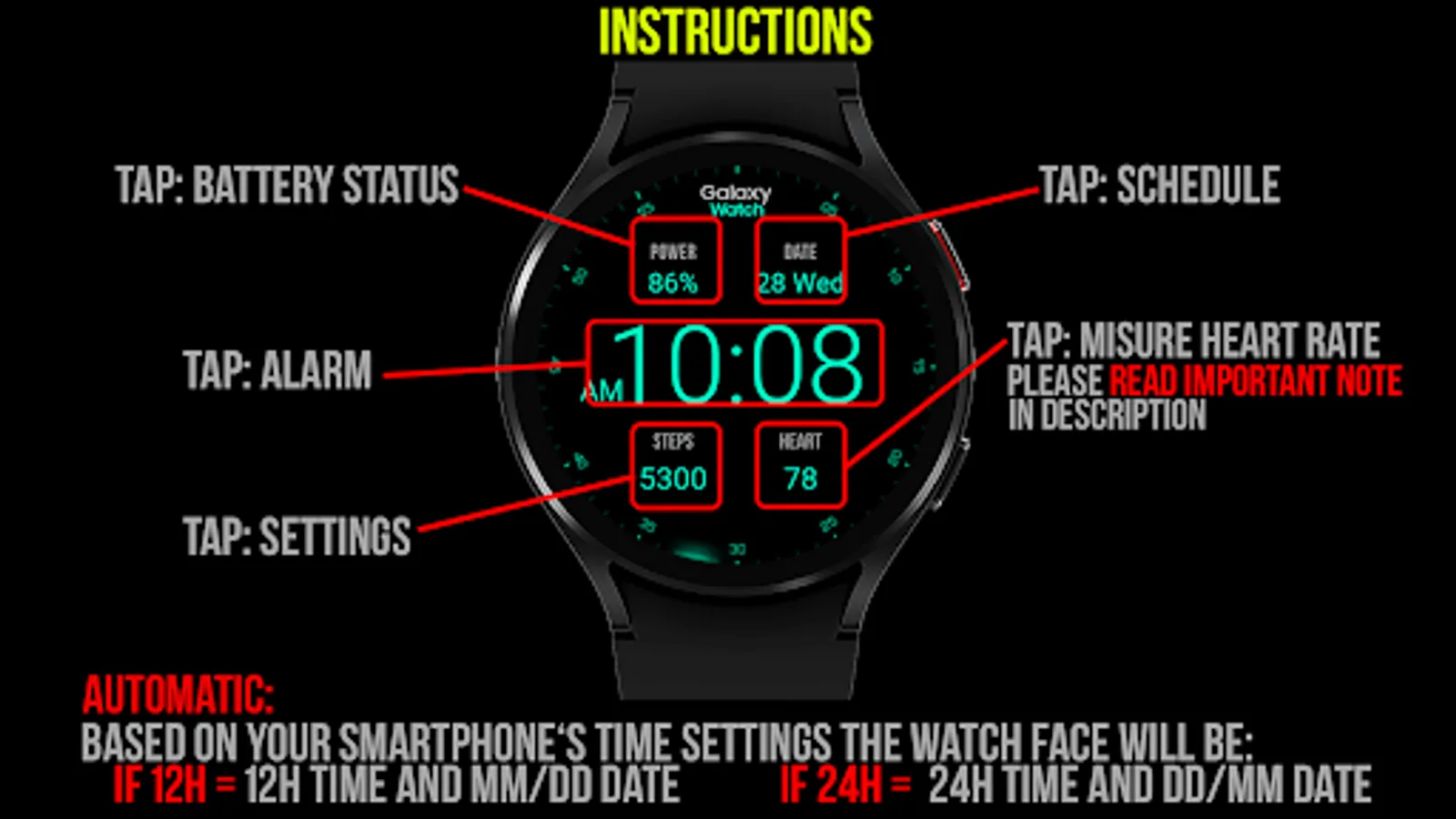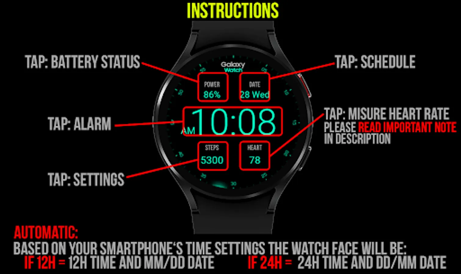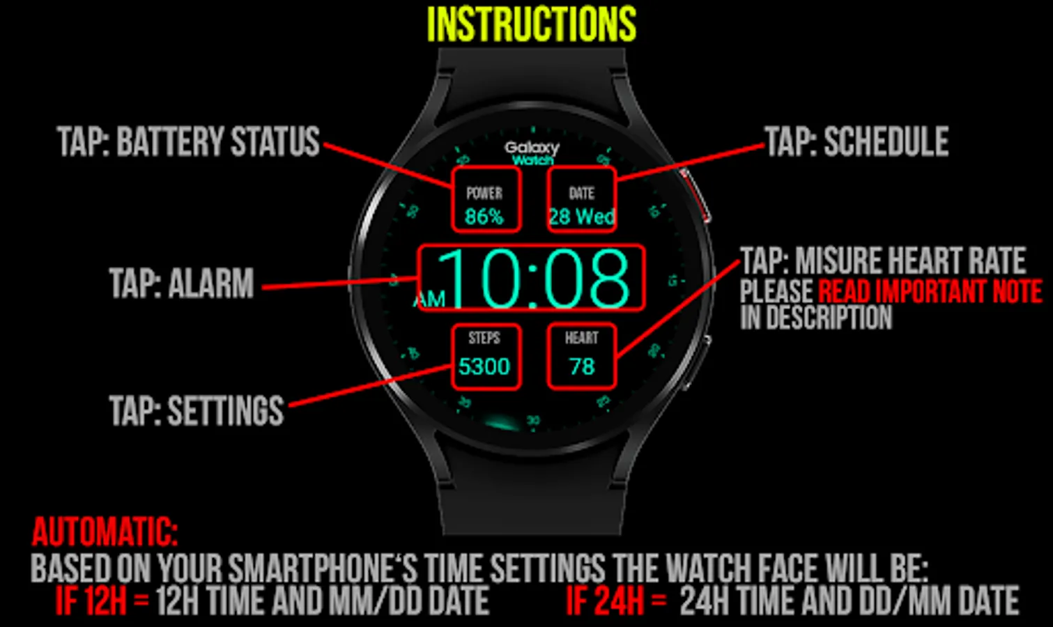 *Heart rate measurement is independent from the Wear OS heart rate application and is taken by the watch face itself. The watch face shows your heart rate at the time of measurement and does not update the Wear OS heart rate app. The heart rate measurement will be different than the measurement taken by stock Wear OS app