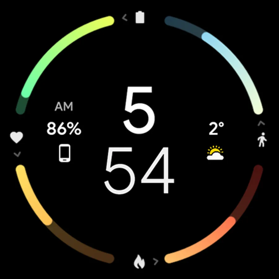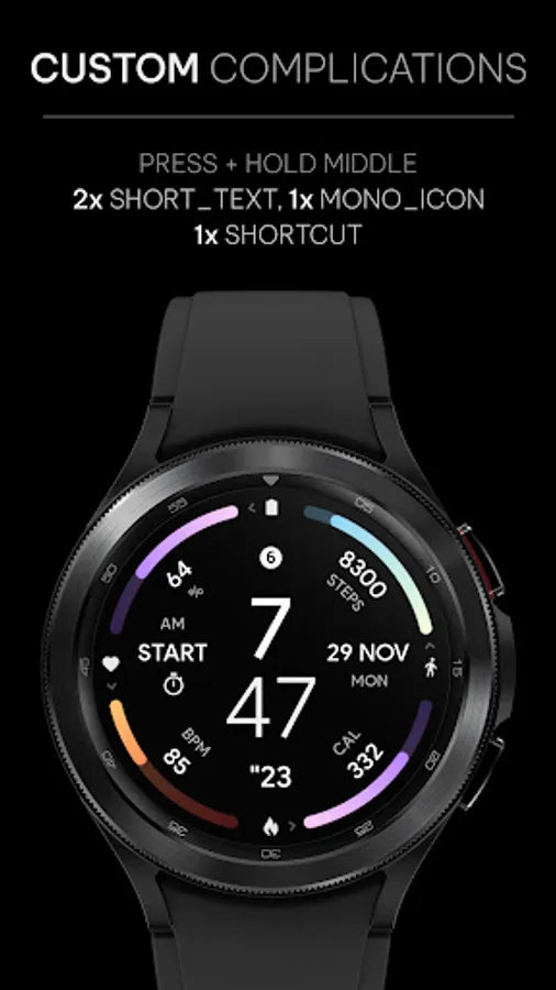 • calories > tap to set custom app (Google Fit, Samsung Health etc.) - editable in watch face settings as complication