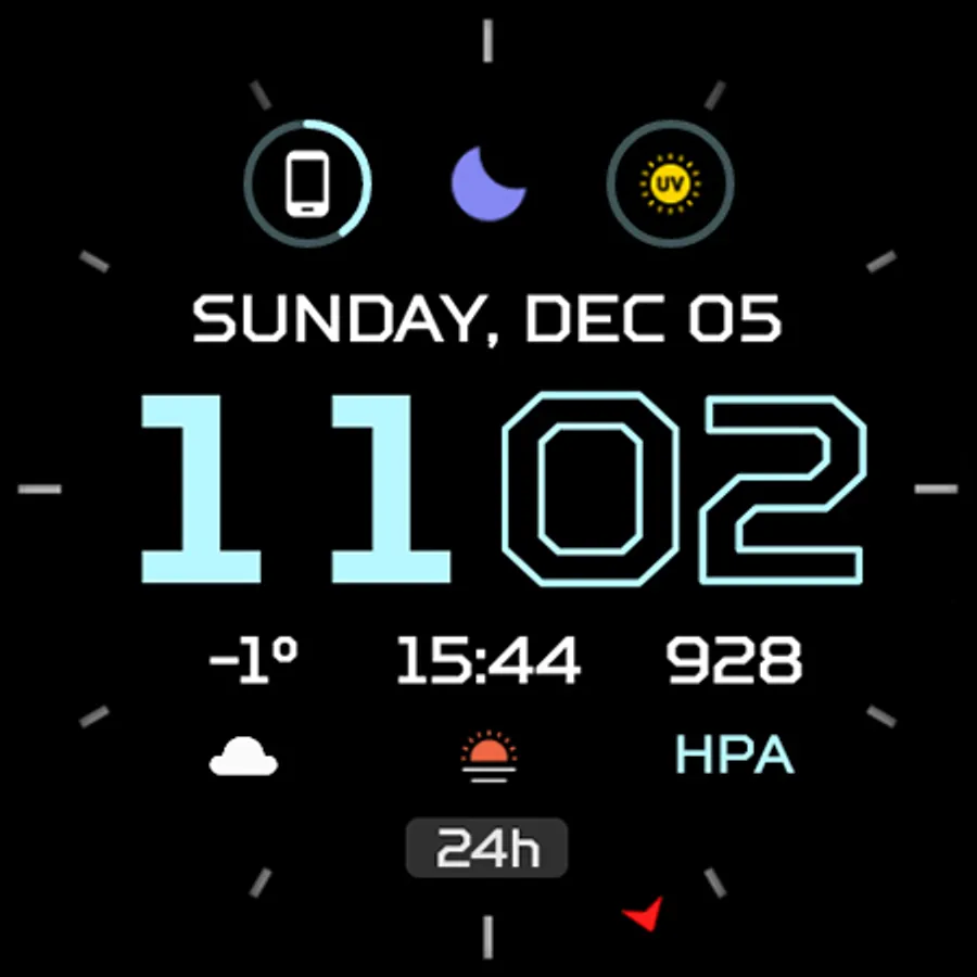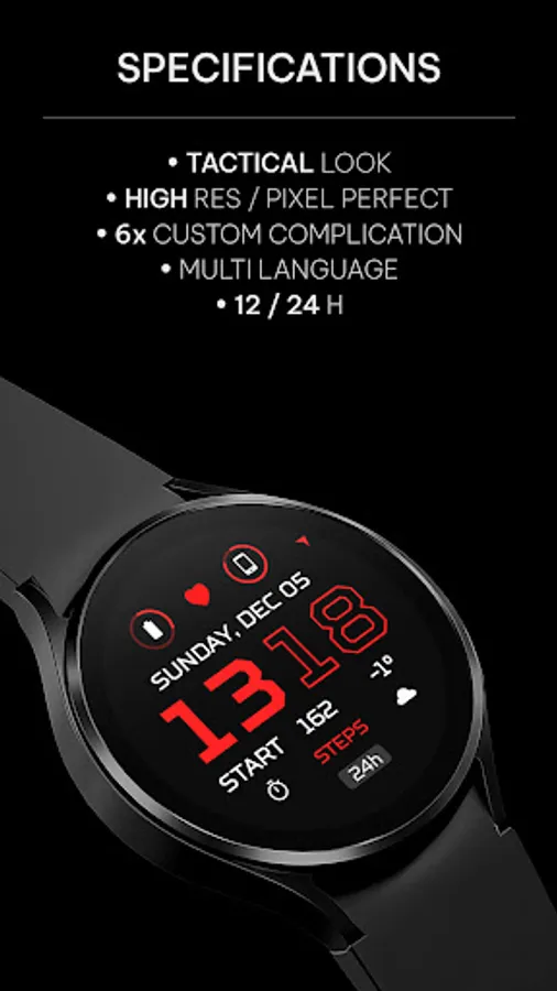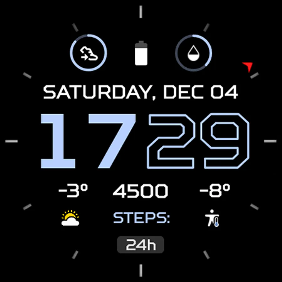 • 6x custom complications (SHORT_TEXT, RANGED_VALUE, MONOCHROME_ICON)