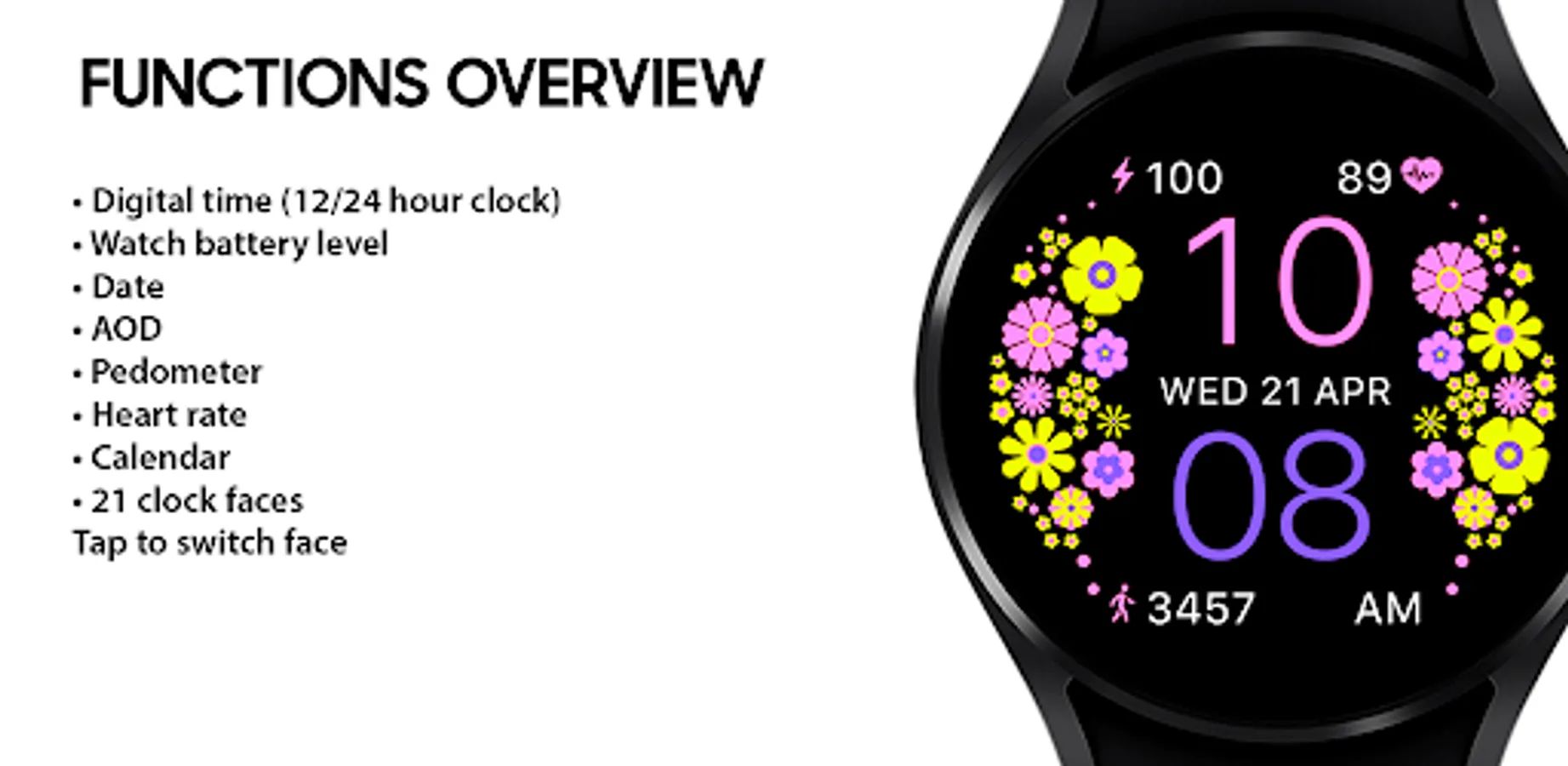 21 color themes (tap to switch), All languages, Digital time (12/24 hour clock), Watch battery level, Date, AOD, Pedometer, Heart rate, Calendar