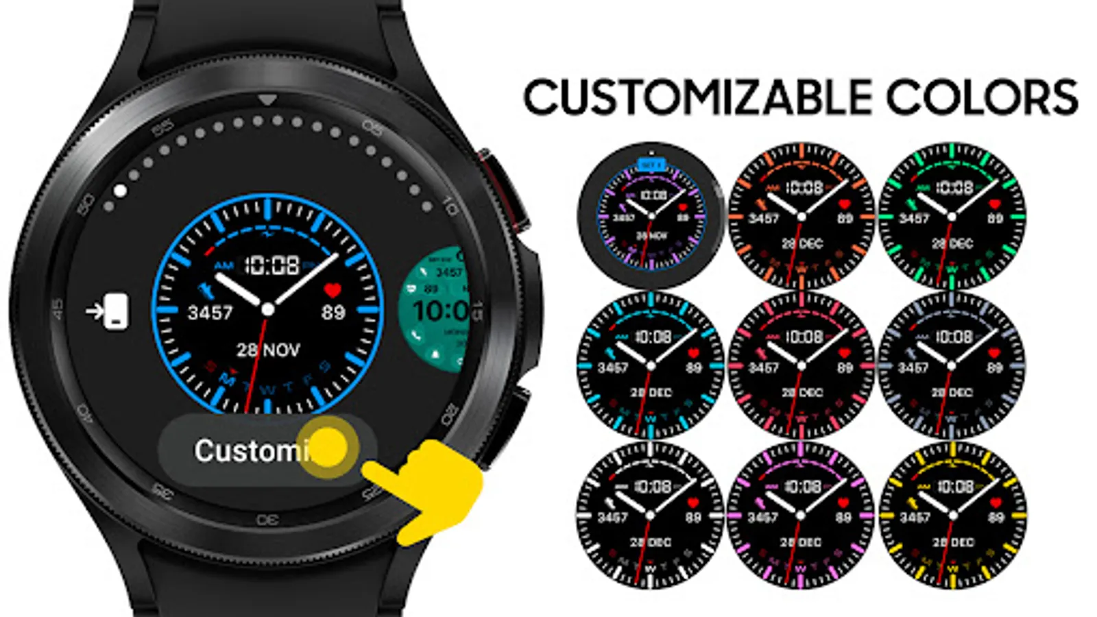 The device that knows you best. That is why I have developed a watch face that will be a great companion on the road to success. Track your fitness progress with a pedometer. New day new color of the dial. The color changes when you touch the screen. Enjoy a wide variety of widgets, from alarm to calendar. Phone and SMS are always at hand.