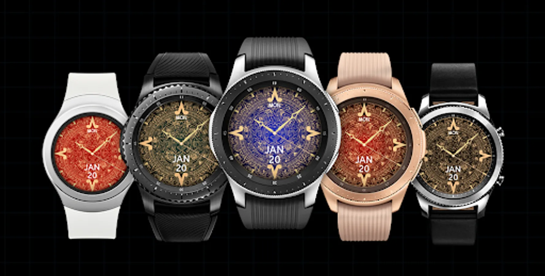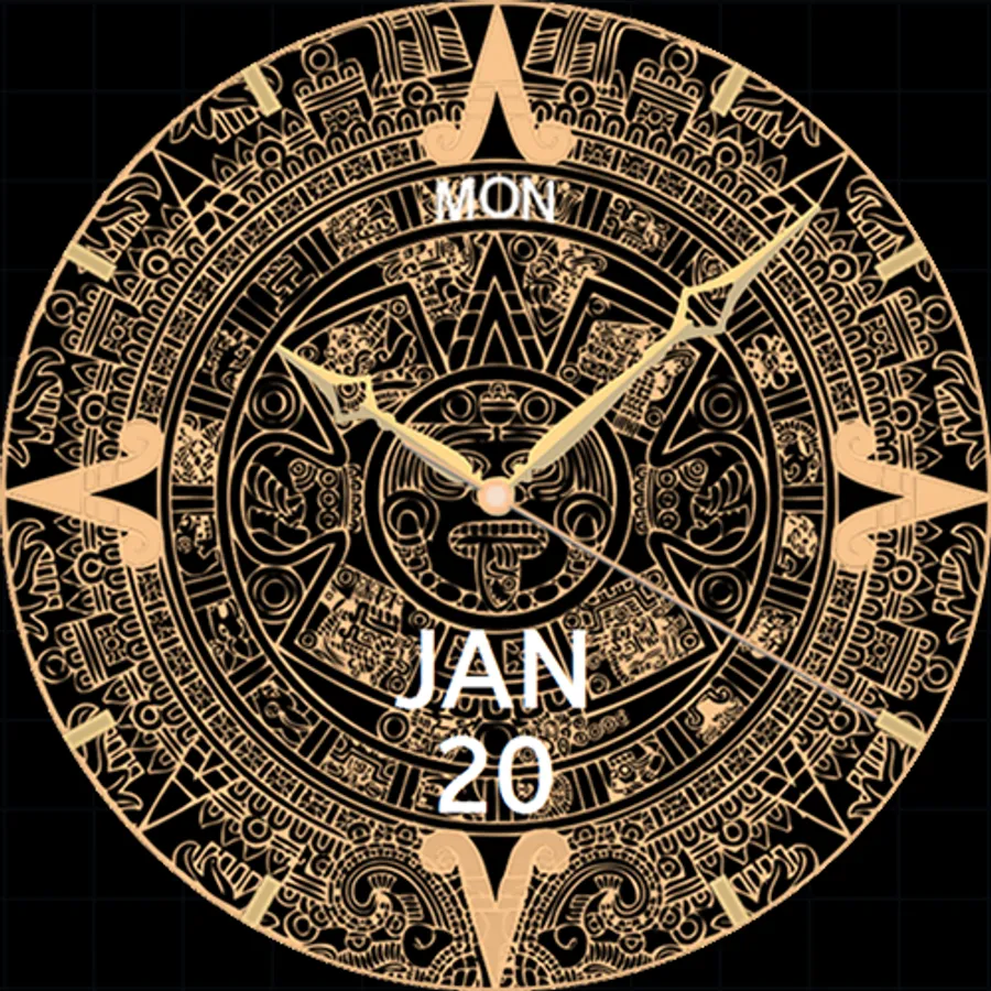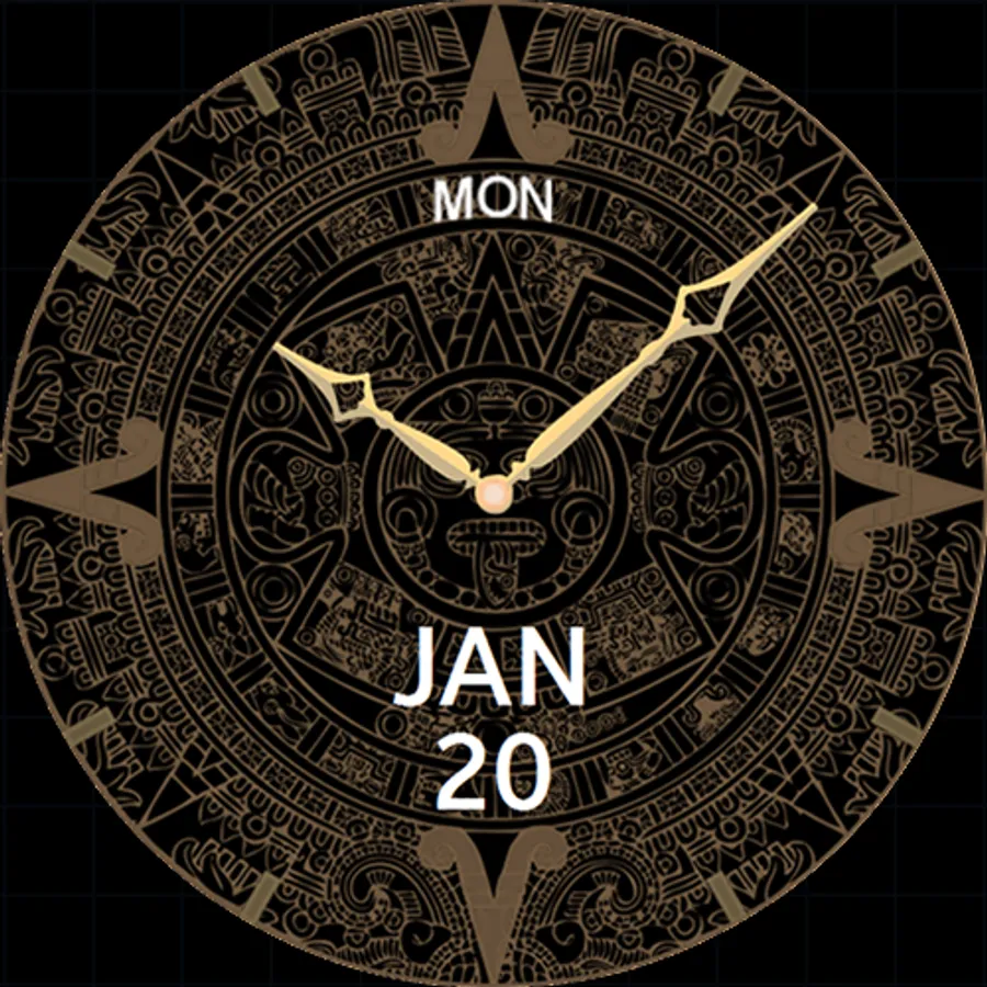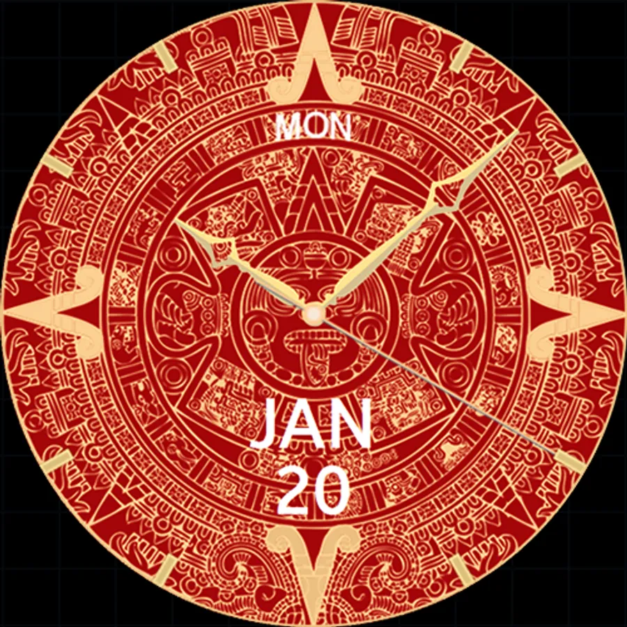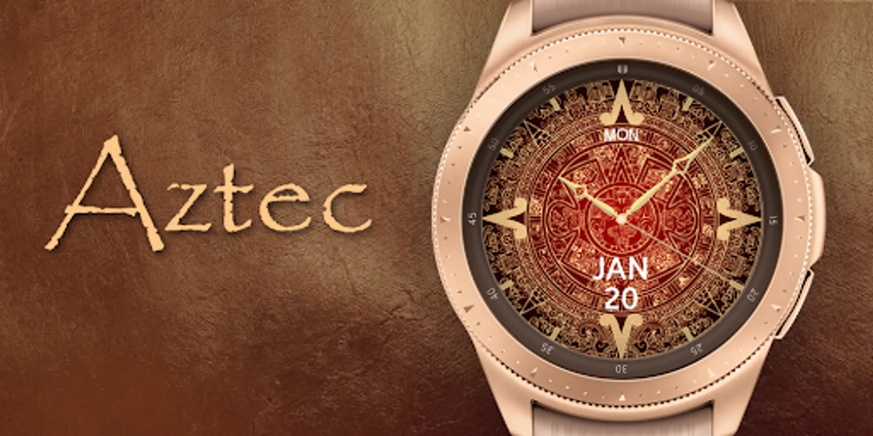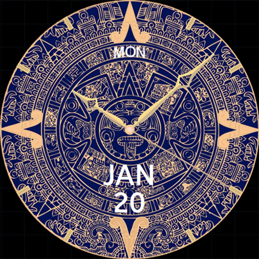 An Aztec calendar watch face for Wear OS with 7 changeable background colors and gyro effects. Compatible with Samsung Galaxy Watch 4 series.