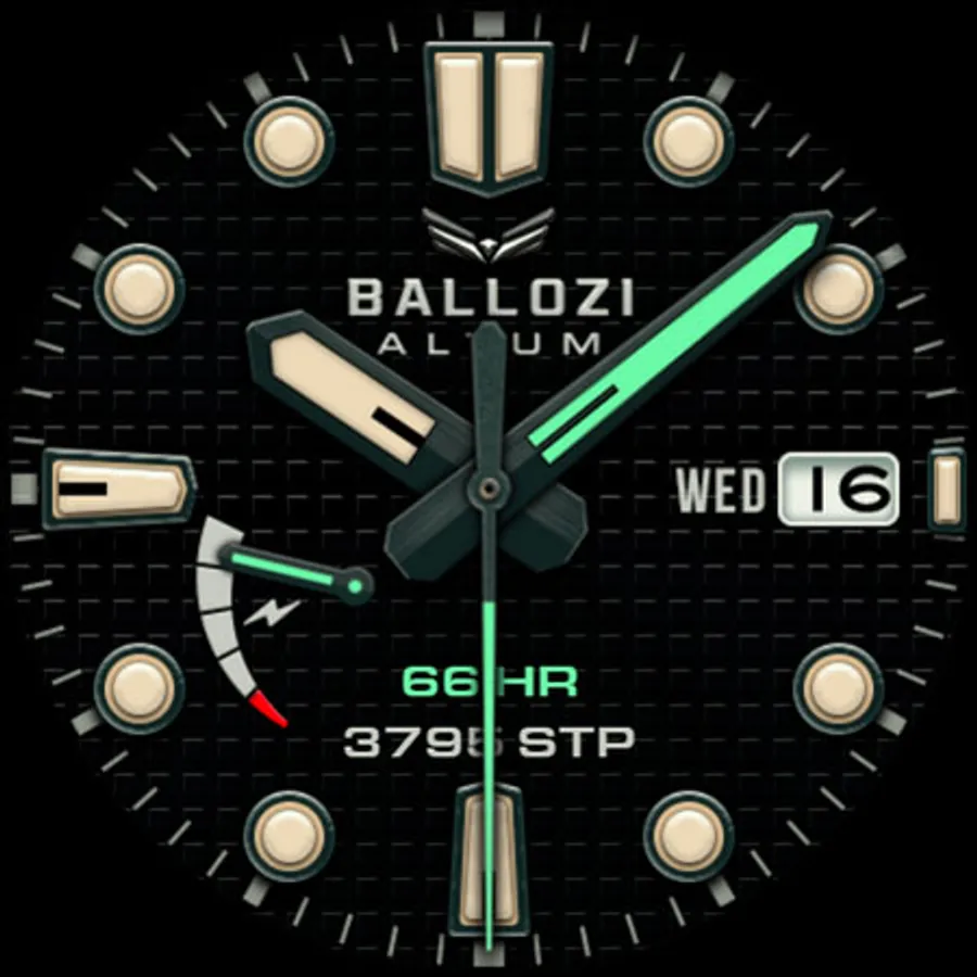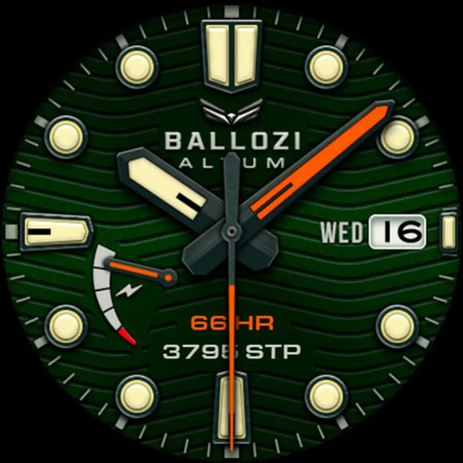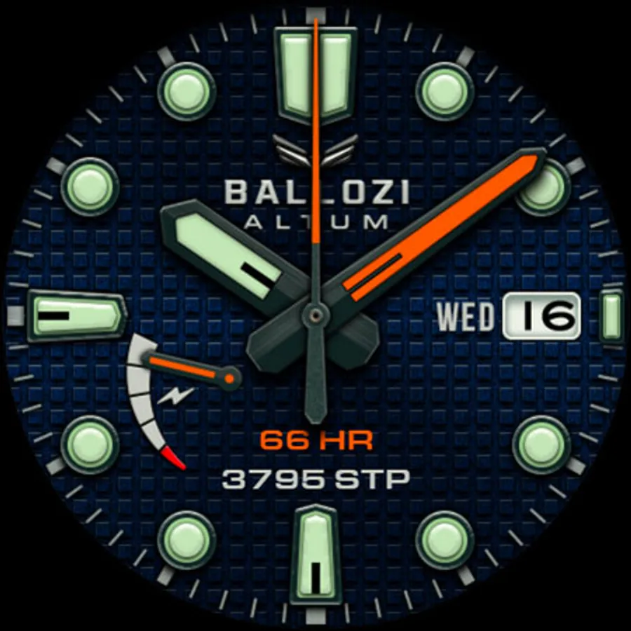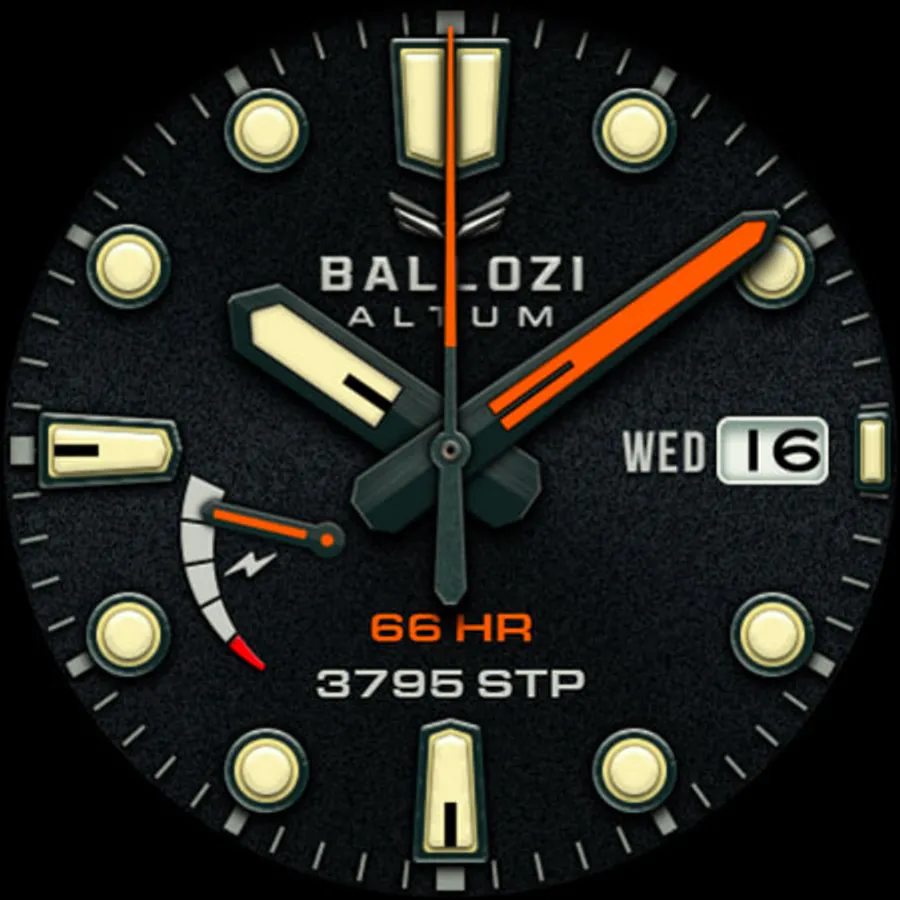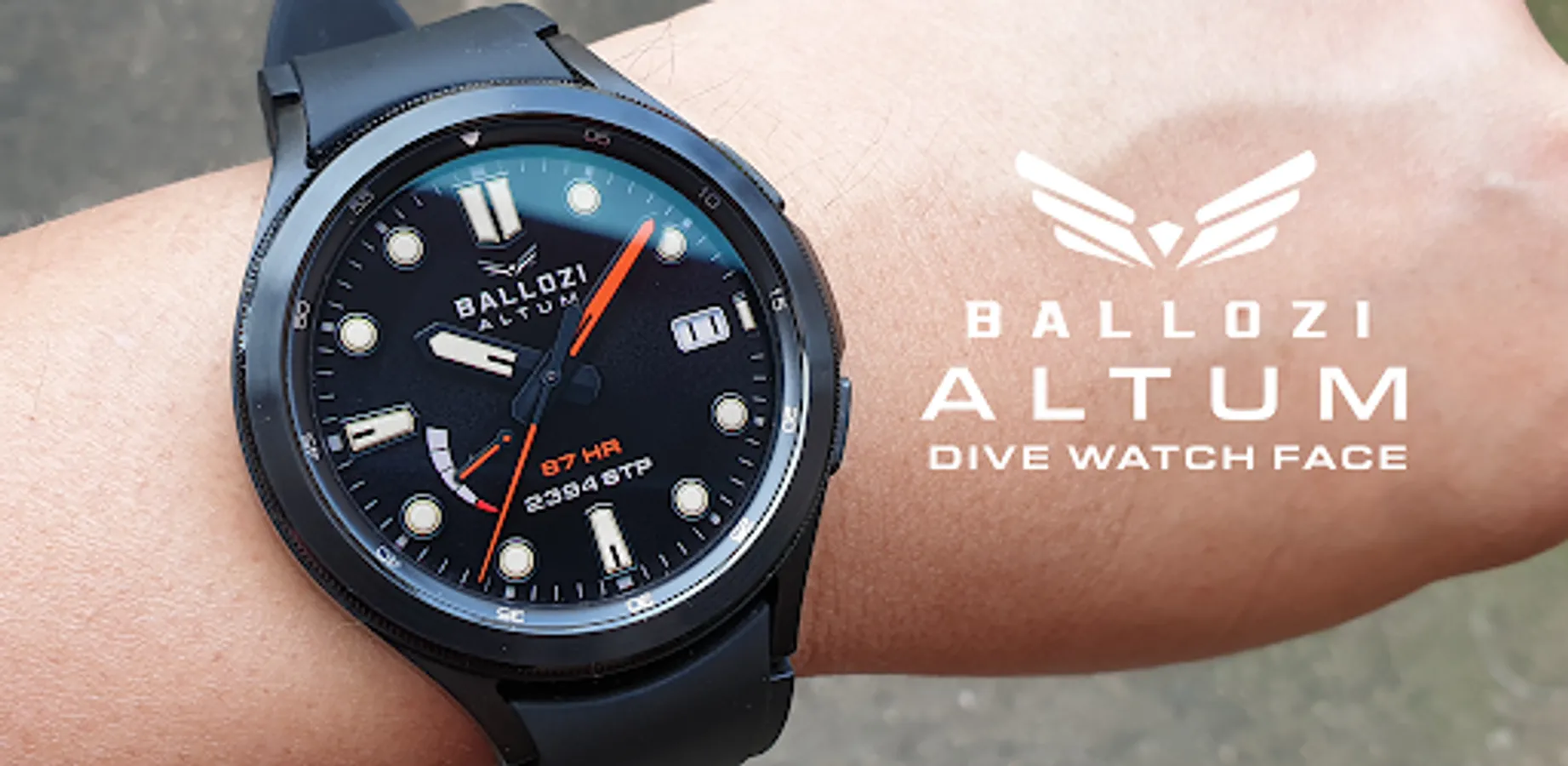 BALLOZI Altum is a modern classic dive inspired watch face for Wear OS. Featured with lume colors, big dials and watch hands with classic background colors. Works great on round smartwatches but not suitable for rectangular and square watches.