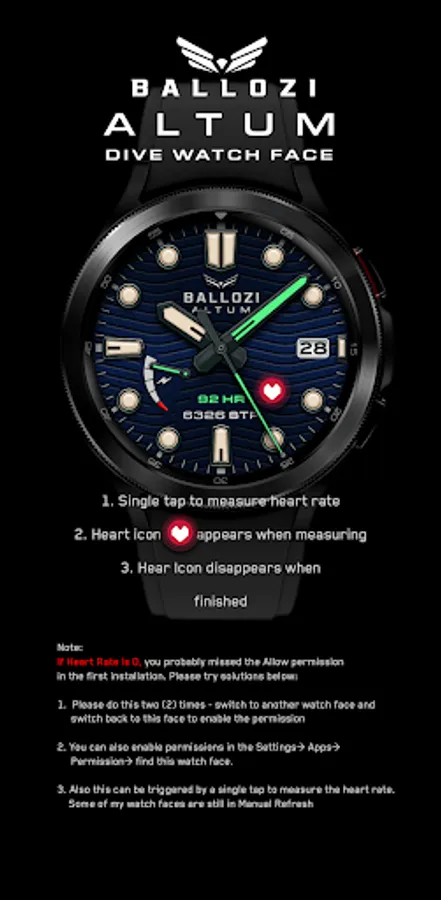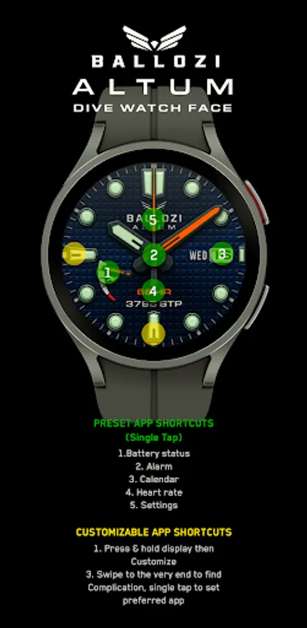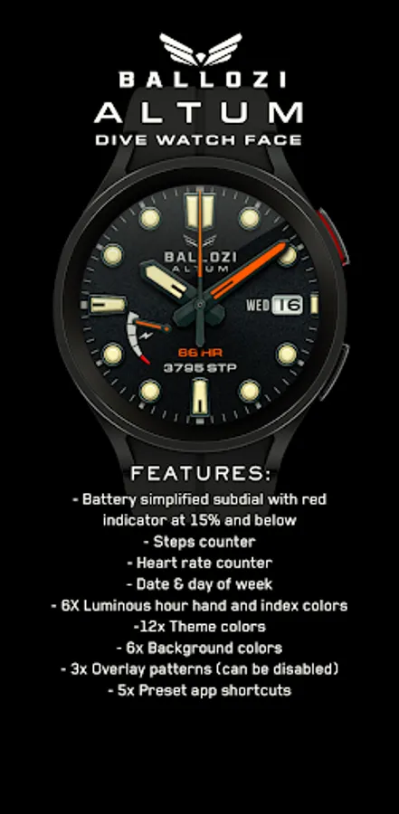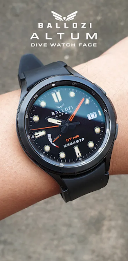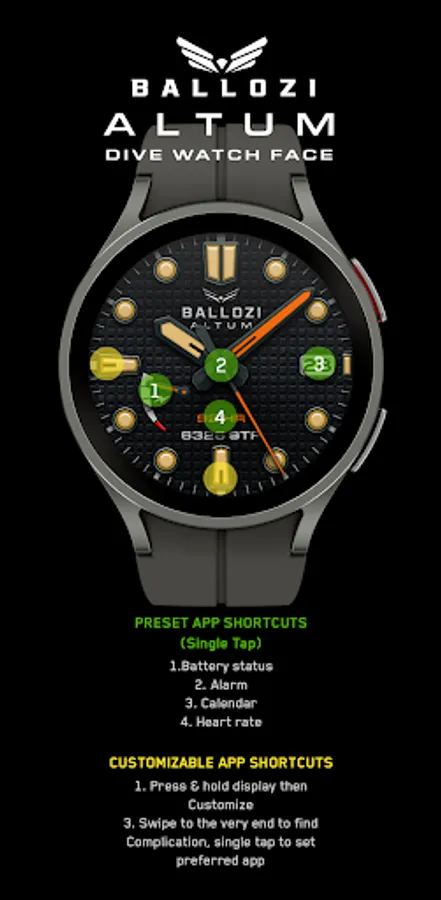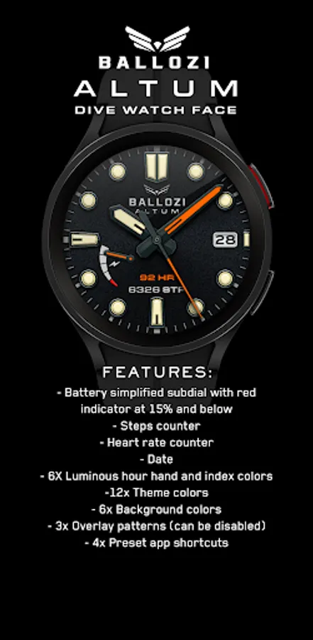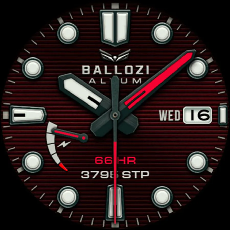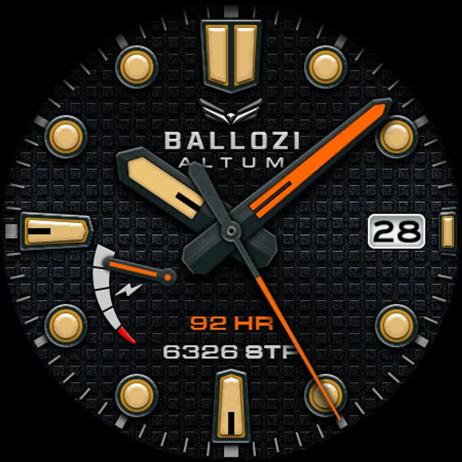BALLOZI Altum is a modern classic dive inspired watch face for Wear OS. Featured with lume colors, big dials and watch hands with classic background colors. Works great on round smartwatches but not suitable for rectangular and square watches.