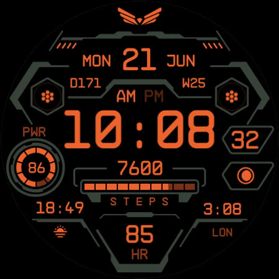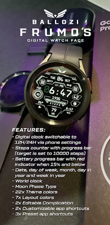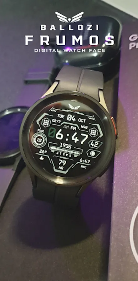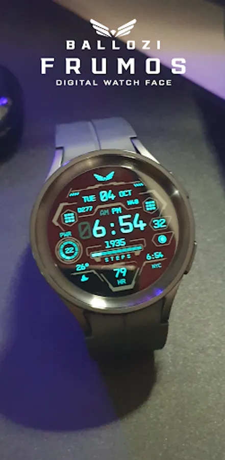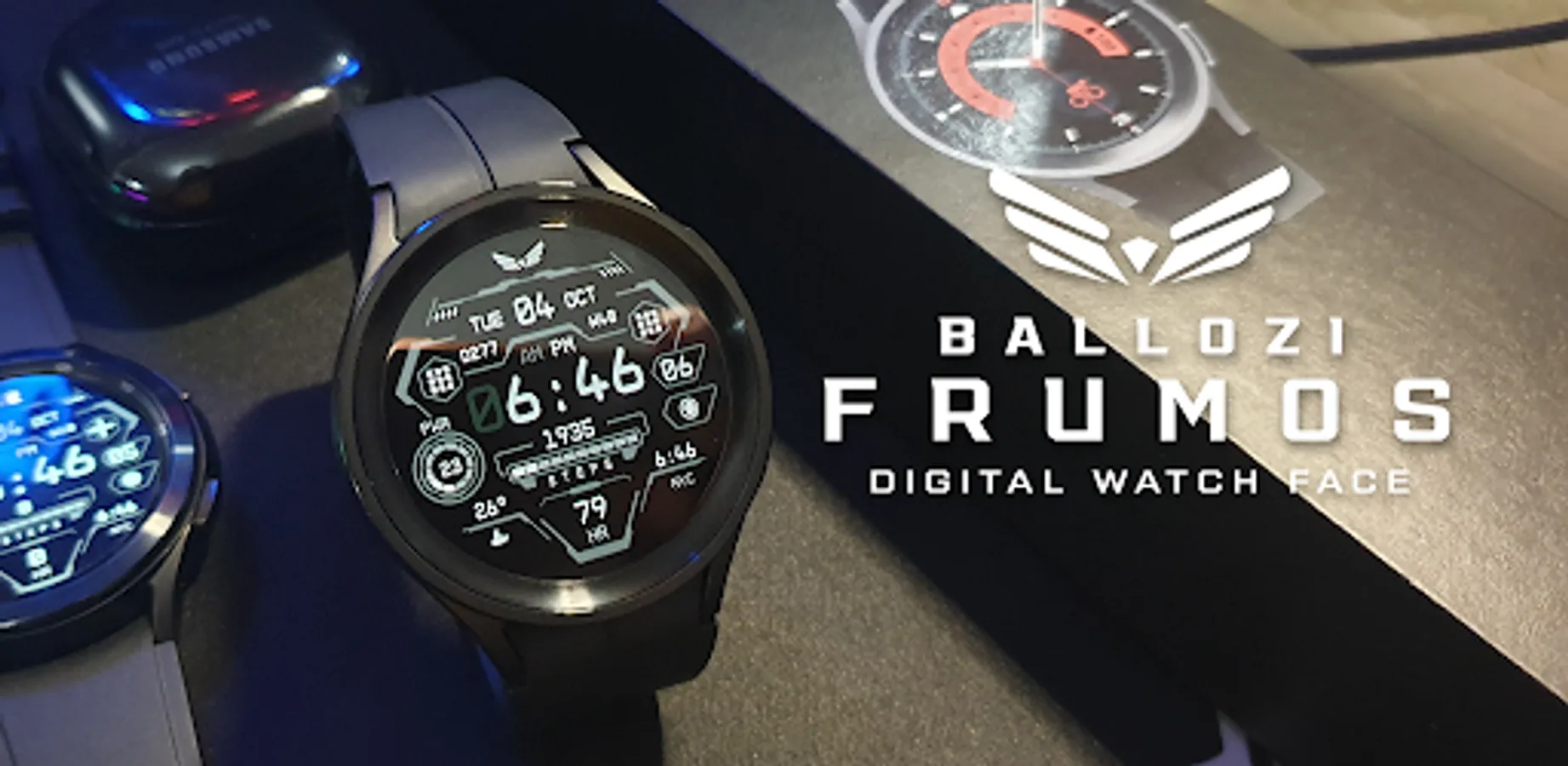BALLOZI FRUMOS is a modern futuristic HUD inspired watch face for Wear OS from Ballozi. Works great on round smartwatches but not suitable for rectangular and square watches.