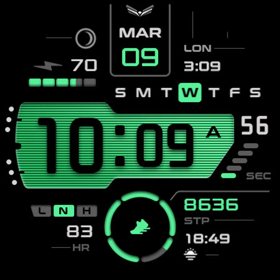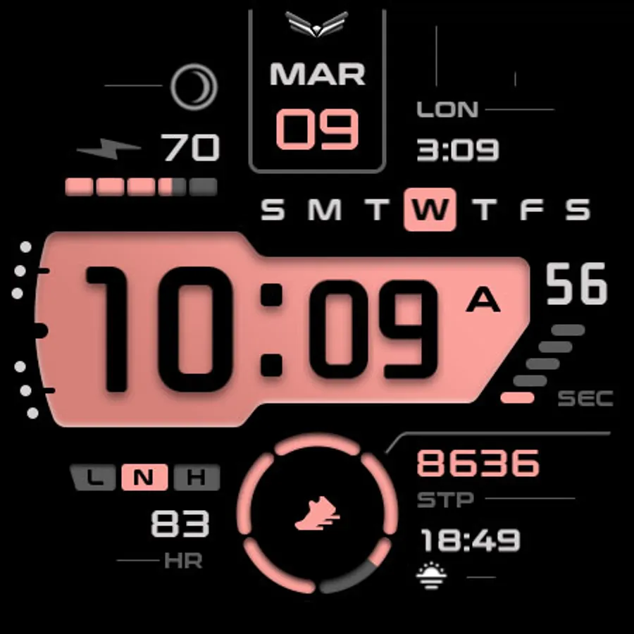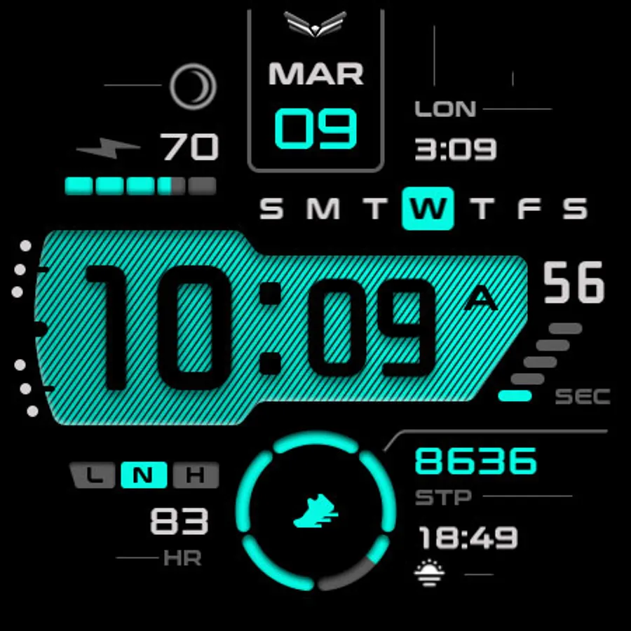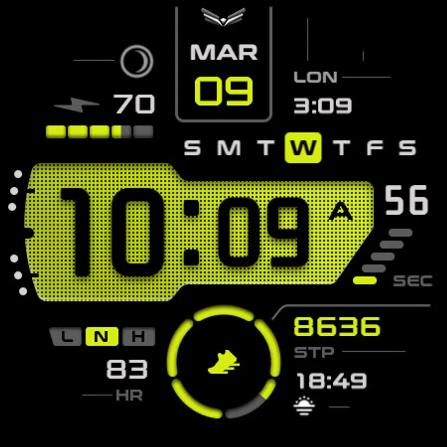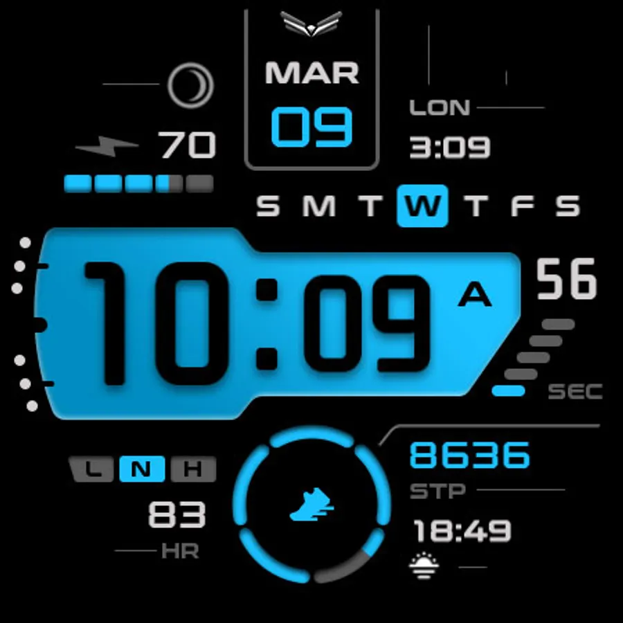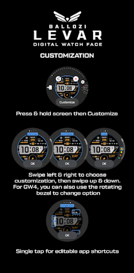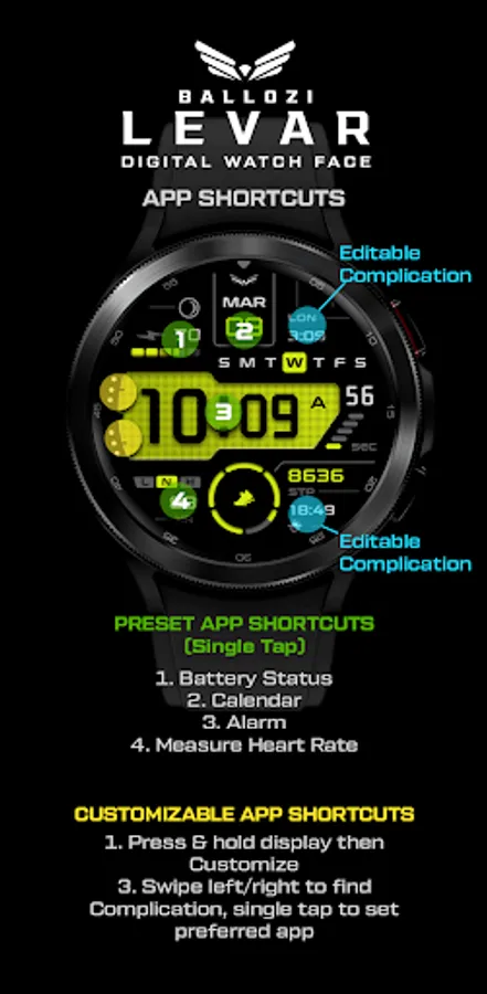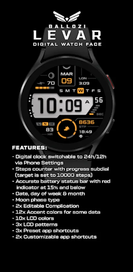 Ballozi Levar is a modern digital watch face for Wear OS with 5 seconds counter loop. Ballozi Levar was first designed in Tizen and now available on Wear OS with lots of customizations.