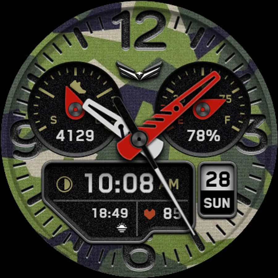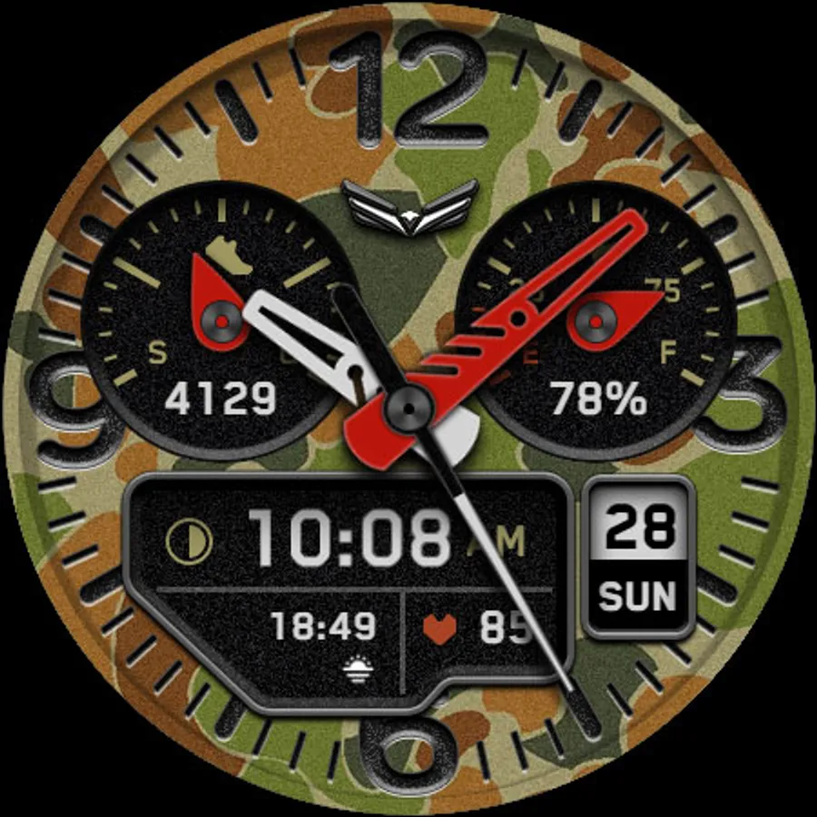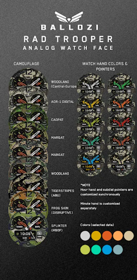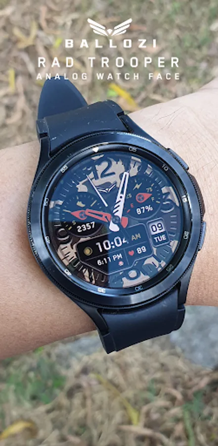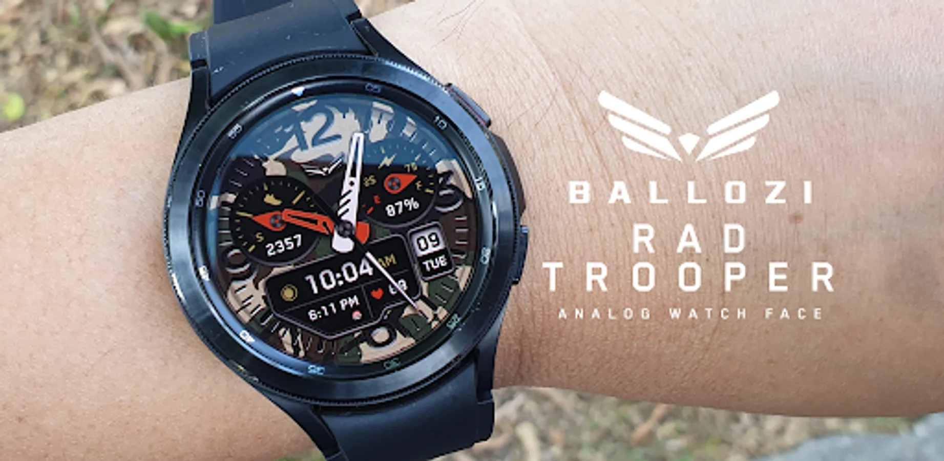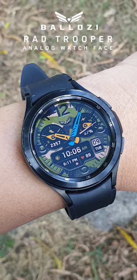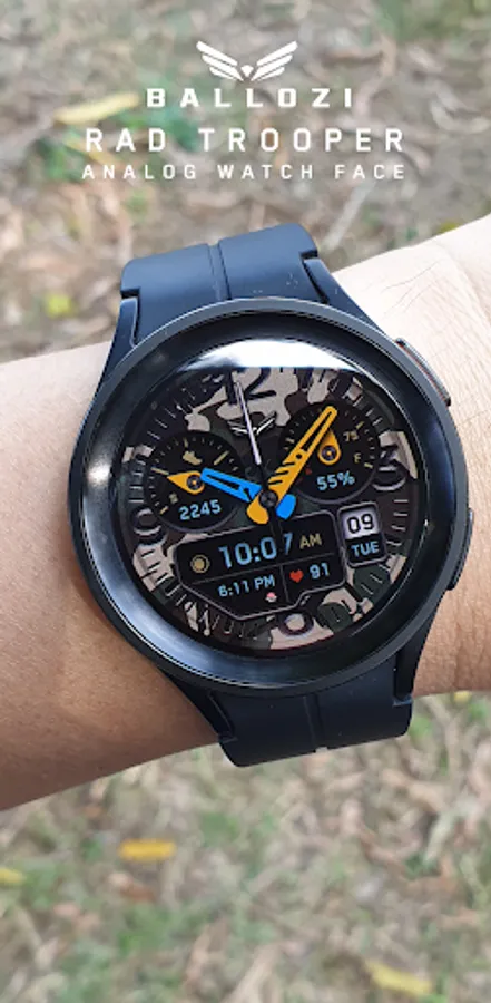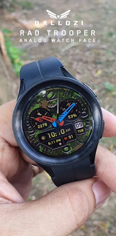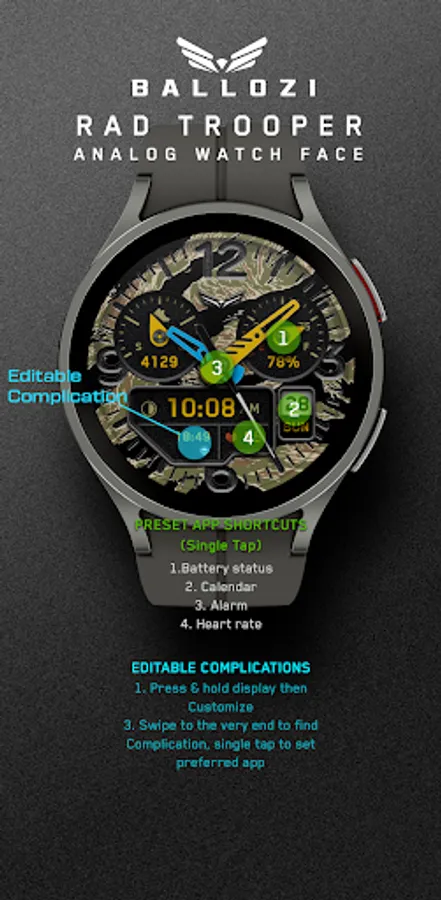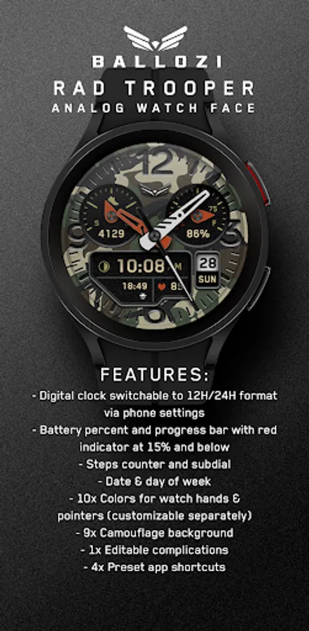 BALLOZI Rad Trooper is an analog camouflage inspired watch face for Wear OS. Works great on round smartwatches but not suitable for rectangular and square watches.