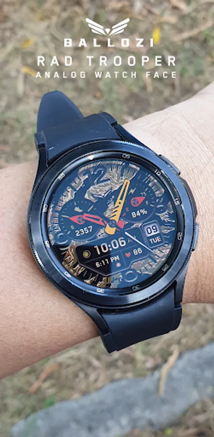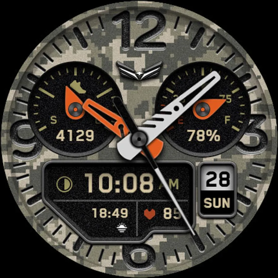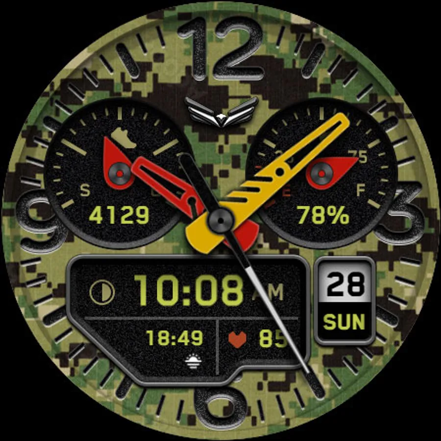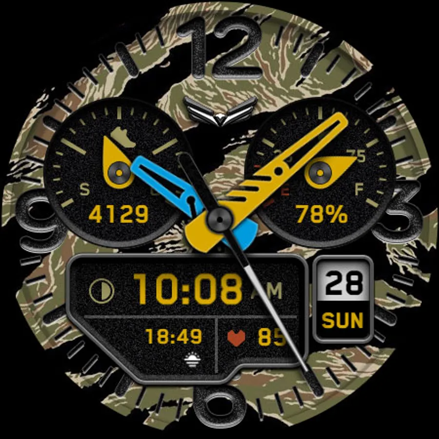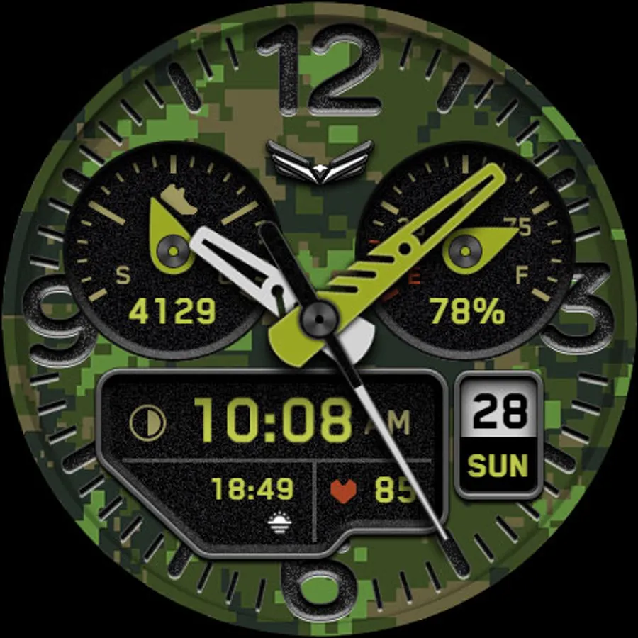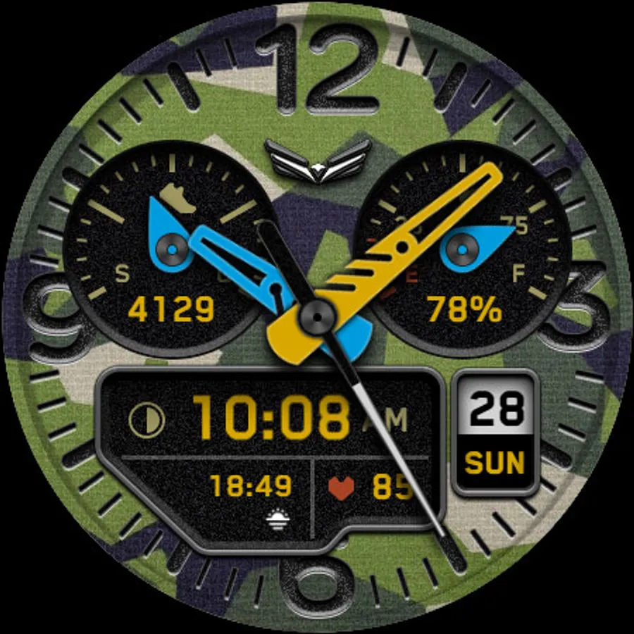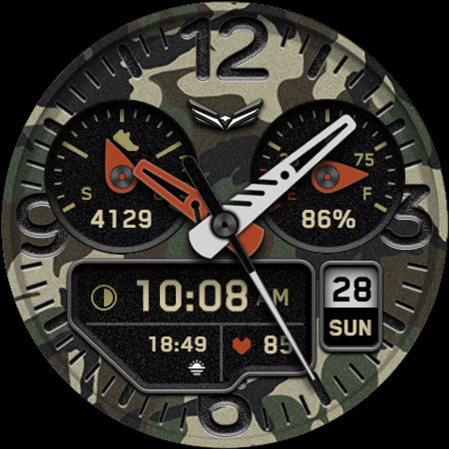 BALLOZI Rad Trooper is an analog camouflage inspired watch face for Wear OS. Works great on round smartwatches but not suitable for rectangular and square watches.