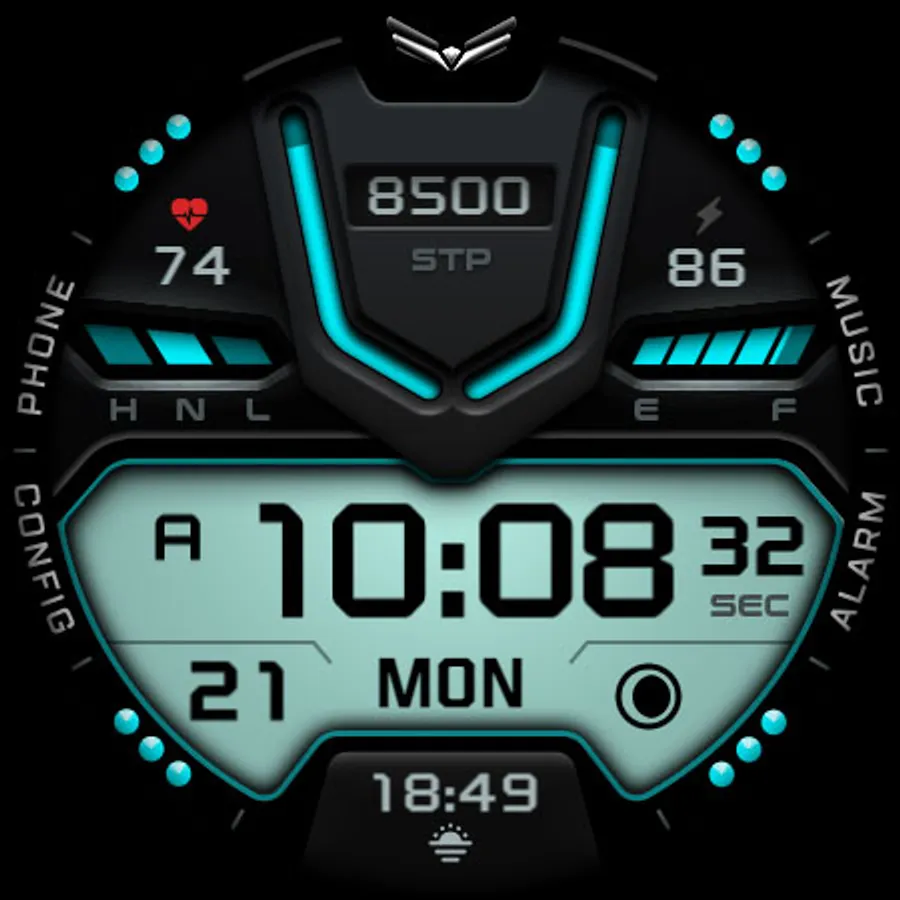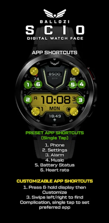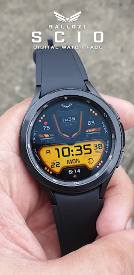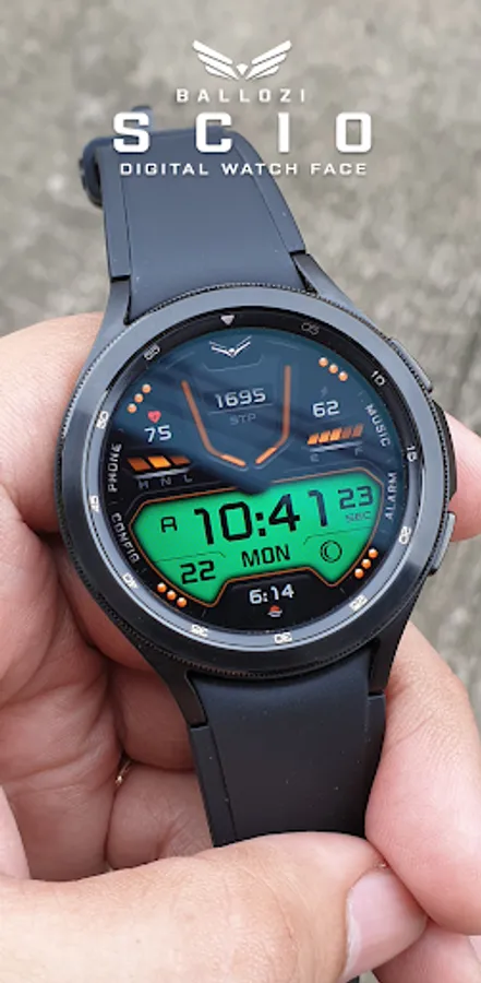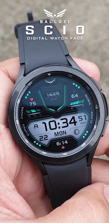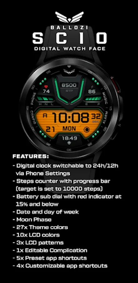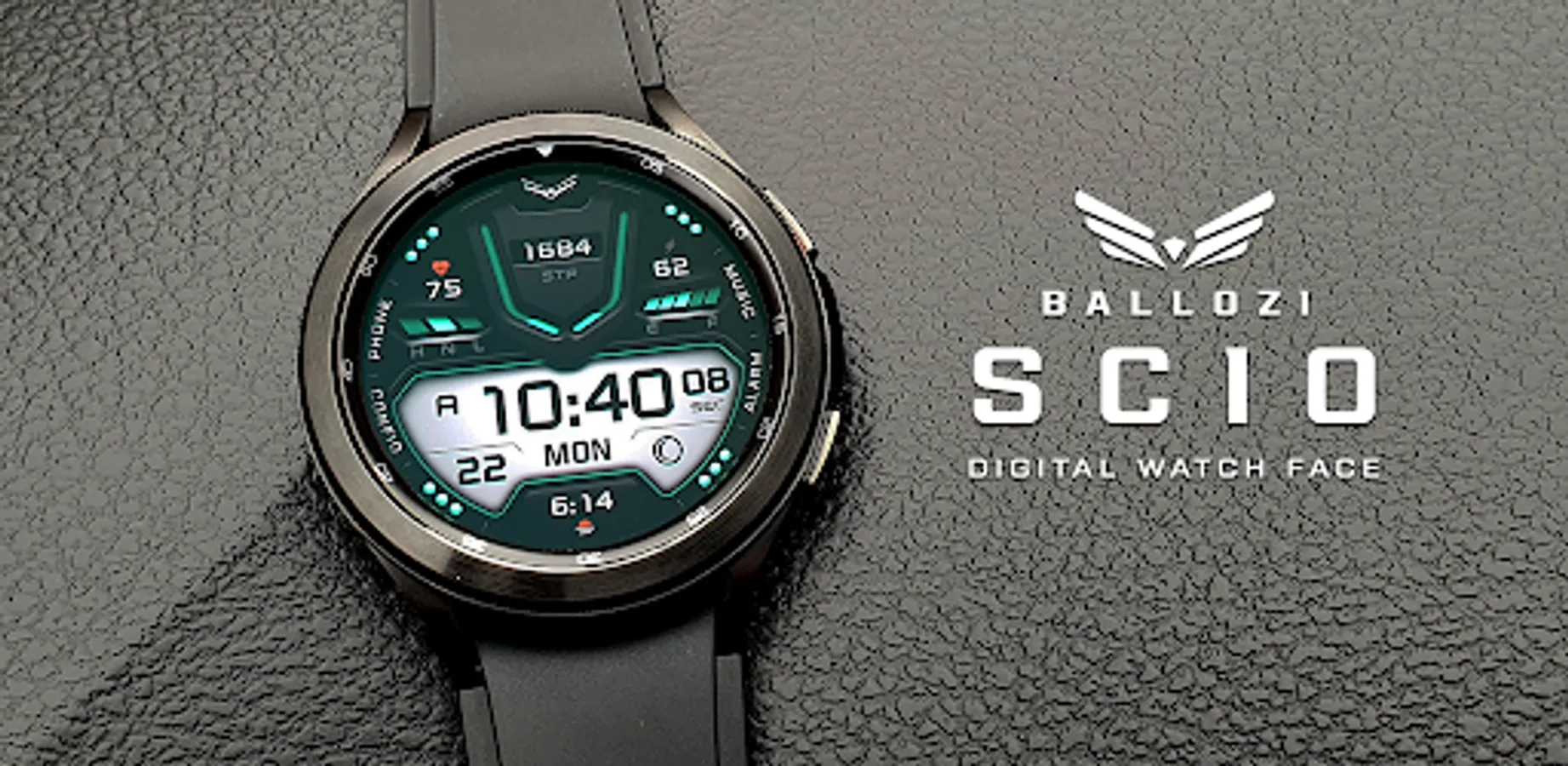 BALLOZI SCIO a modern clean futuristic watch face for Wear OS with a standard LCD colors. Works great on round smartwatches but not suitable for rectangular and square watches.