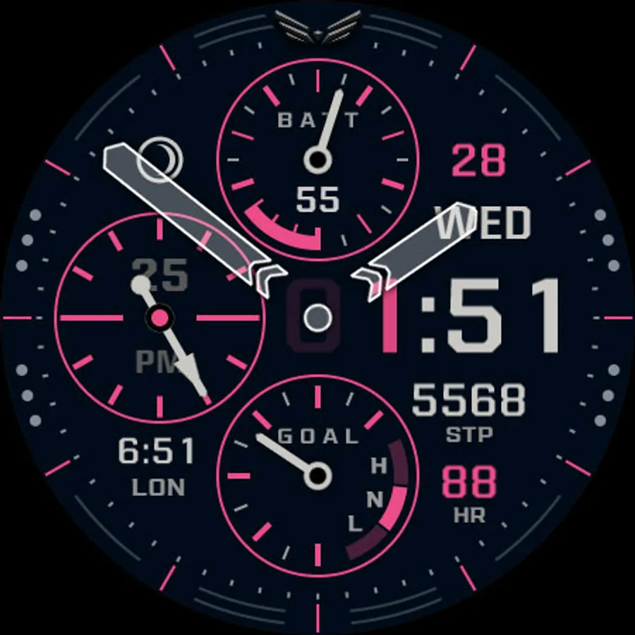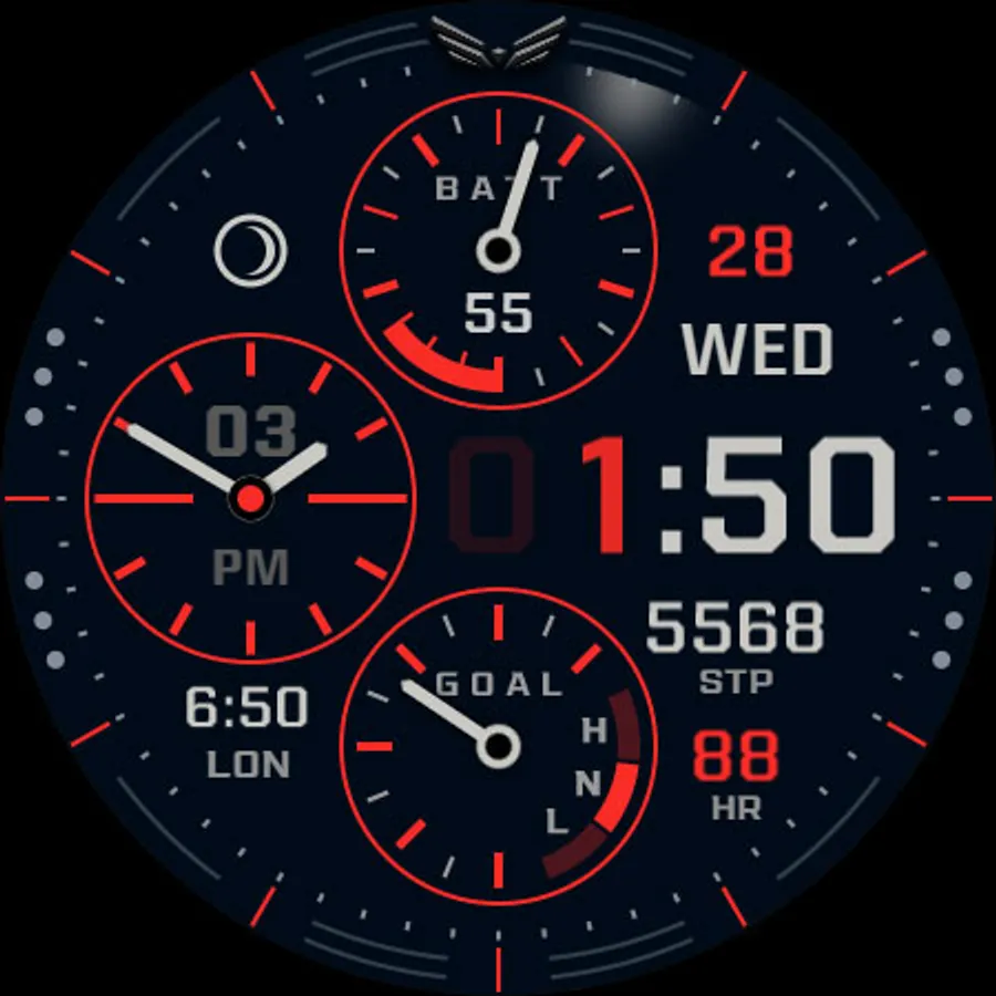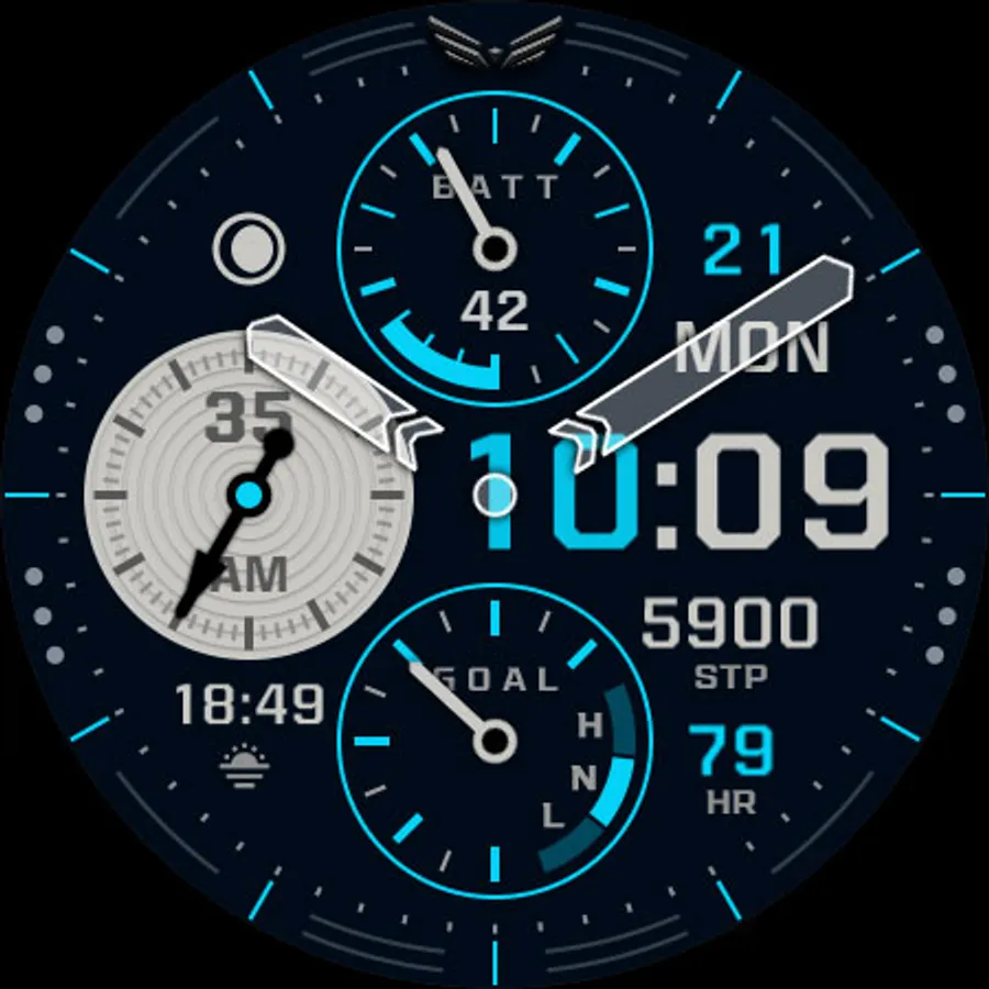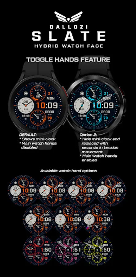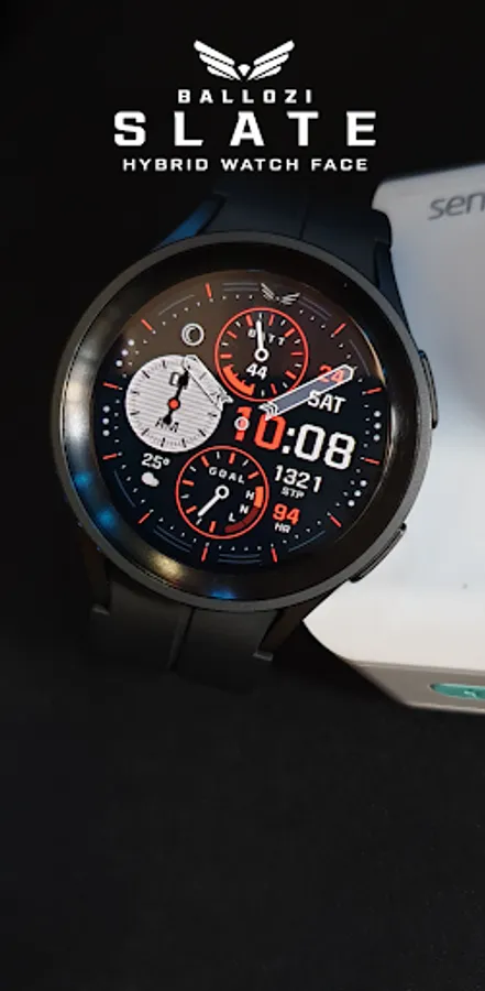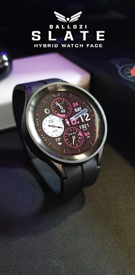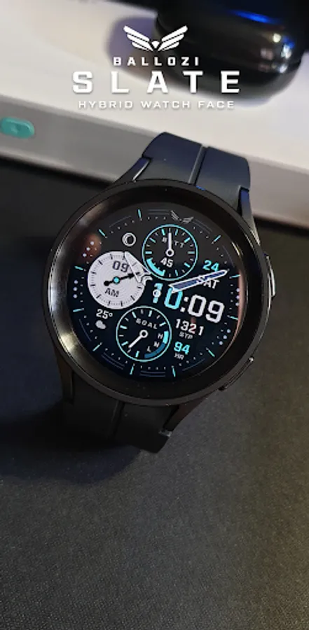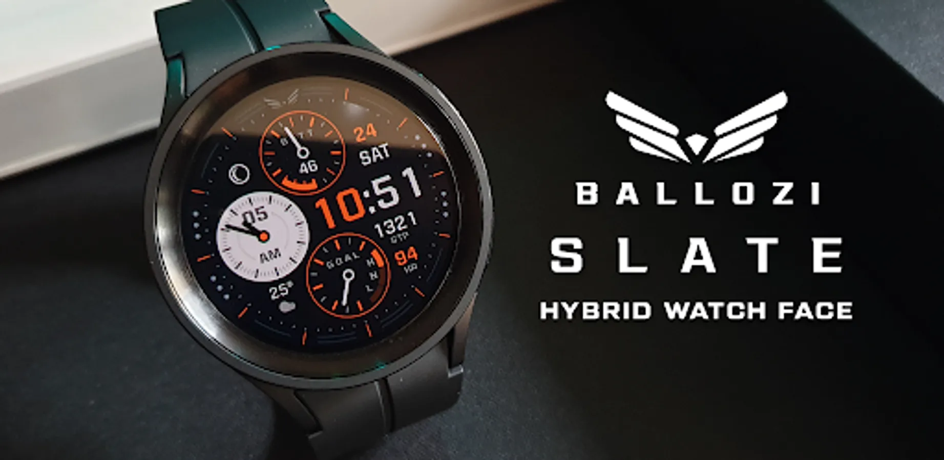 BALLOZI SLATE is bluish modern chronograph styled hybrid digital watch face for Wear OS. Works great on round smartwatches but not suitable for rectangular and square watches.