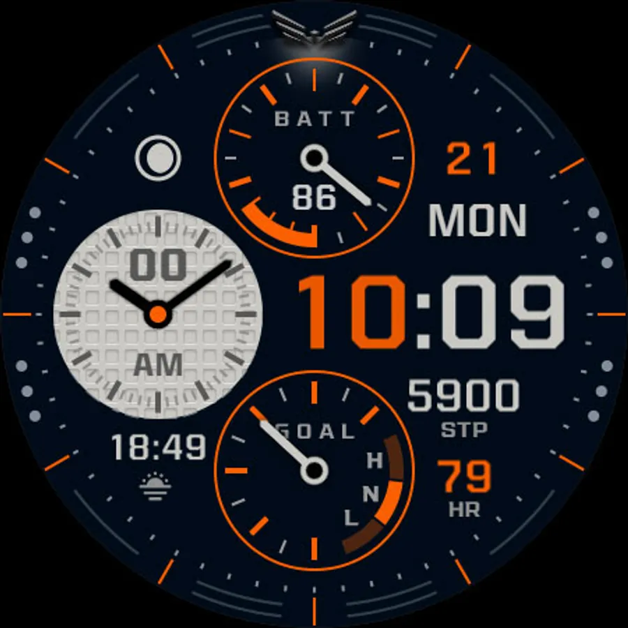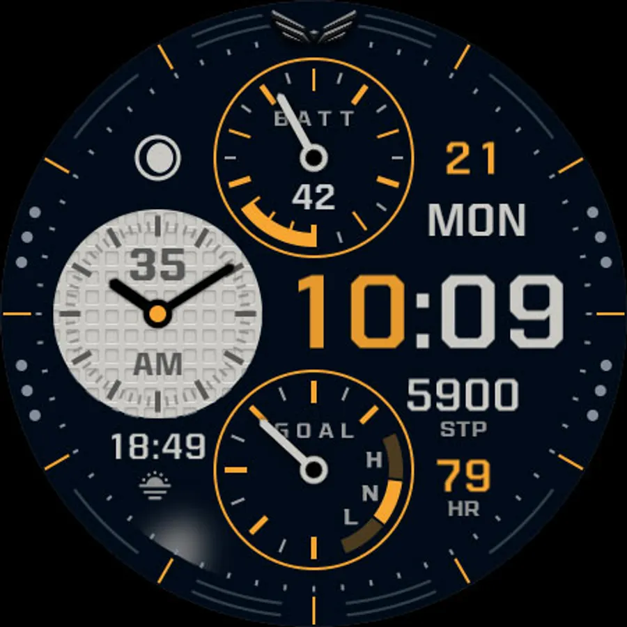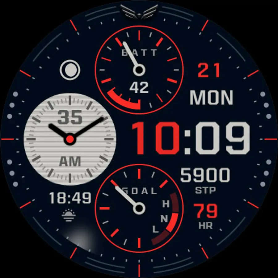 - Steps counter with progress sub dial (target is set to 10000 steps)