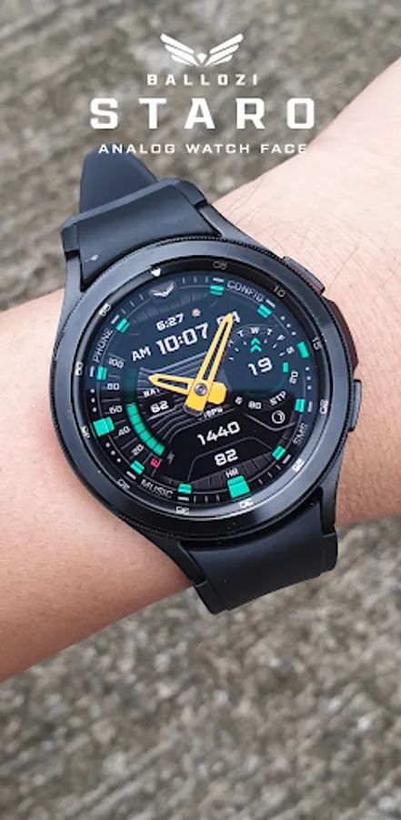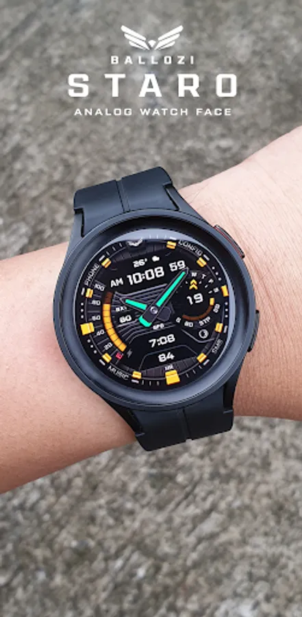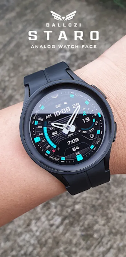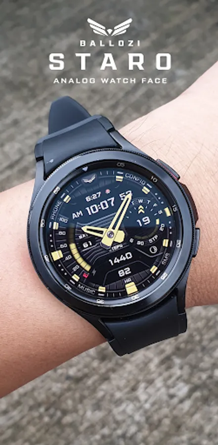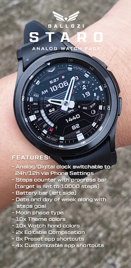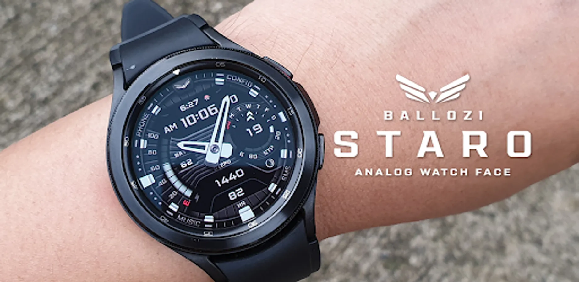 BALLOZI STARO is a modern stealth analog/hybrid watch face for Wear OS. It was first published in the Galaxy Store back in November 2020 and made even better in Wear OS. Works great on round smartwatches but not suitable for rectangular and square watches.