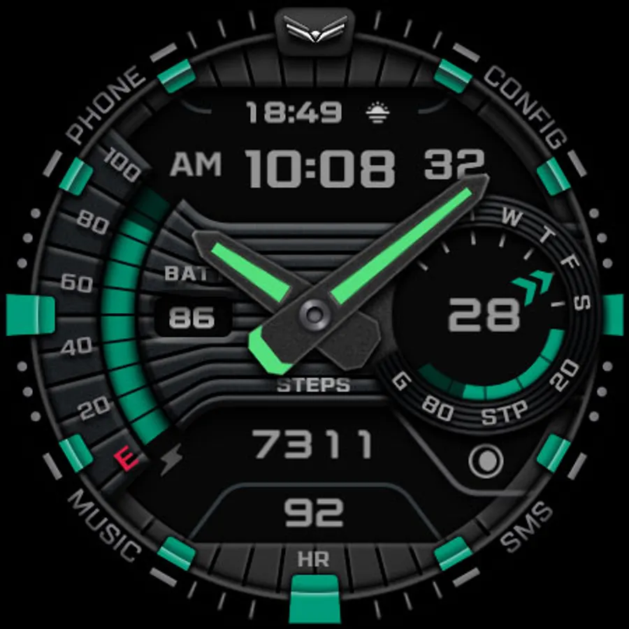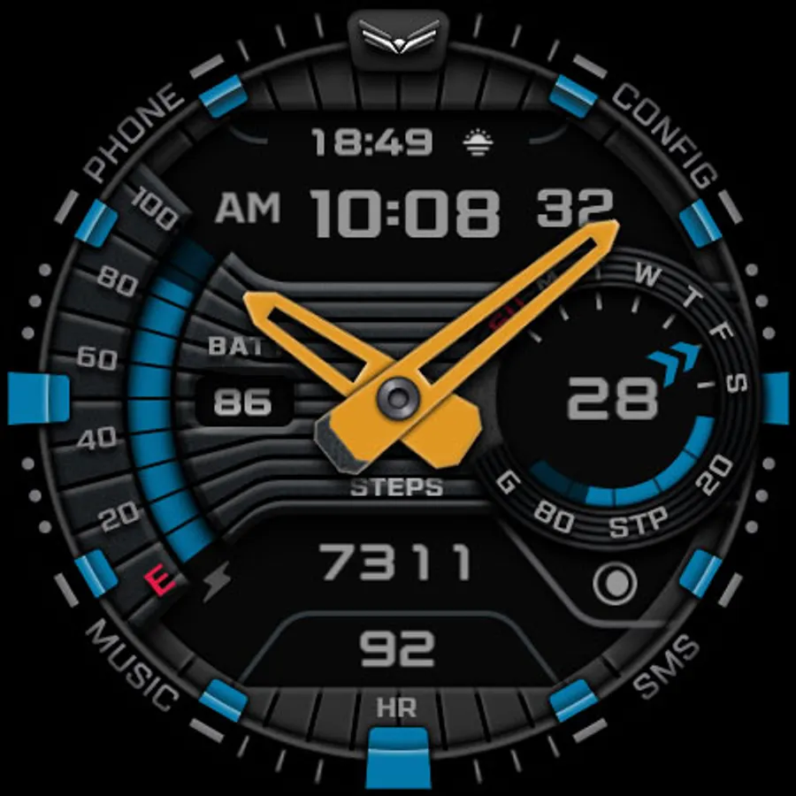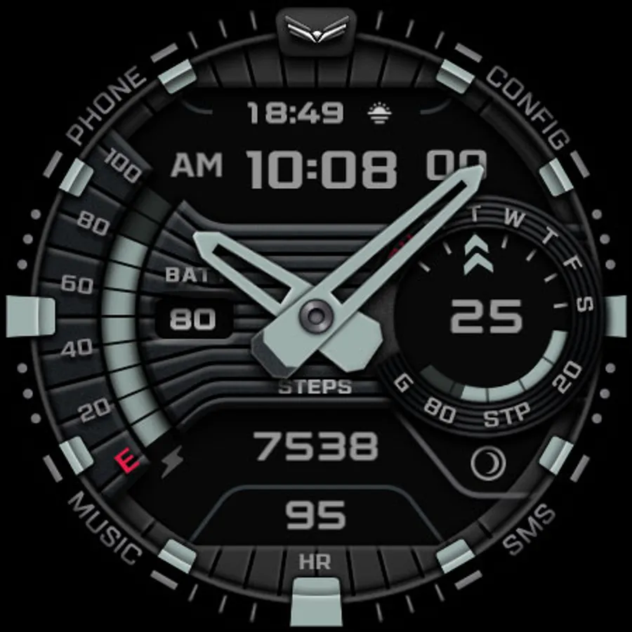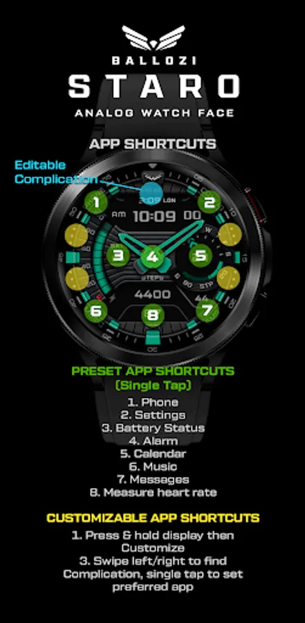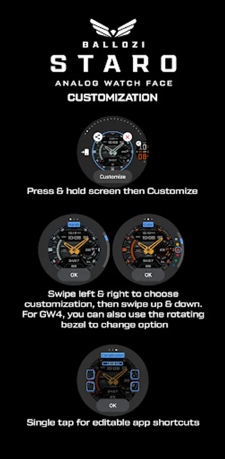 BALLOZI STARO is a modern stealth analog/hybrid watch face for Wear OS. It was first published in the Galaxy Store back in November 2020 and made even better in Wear OS. Works great on round smartwatches but not suitable for rectangular and square watches.