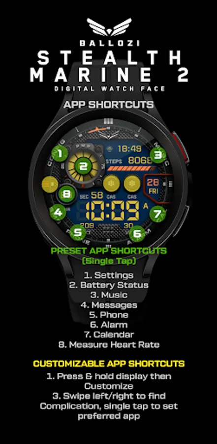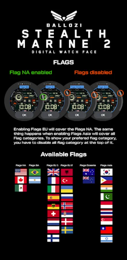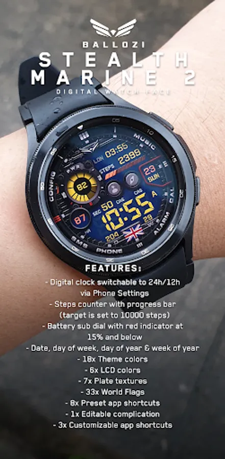 BALLOZI Stealth Marine 2 is digital watch face inspired with the deep marine nature and yet classic retro and informative. It was first released in Tizen OS back in March 2019 and now landed on Wear OS. This watch face features world flags as part of customization to personalize the watch face.
