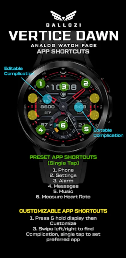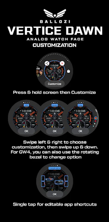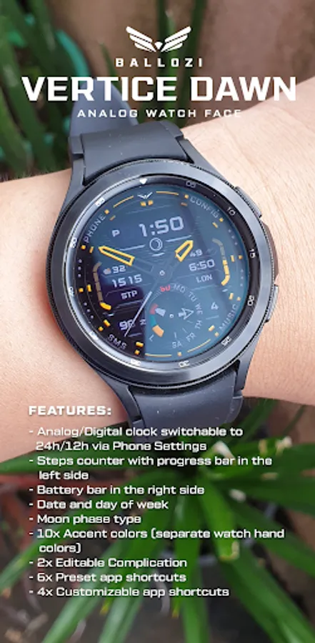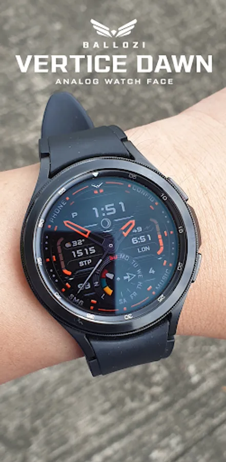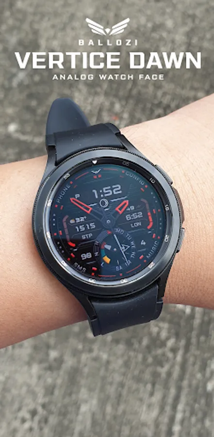 Ballozi Vertice Dawn is an analog watch face for Wear OS. This was first design is Tizen from the version of Ballozi Dawn with bright LCD. Works great on round smartwatches but not suitable for rectangular and square watches.