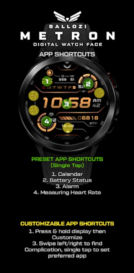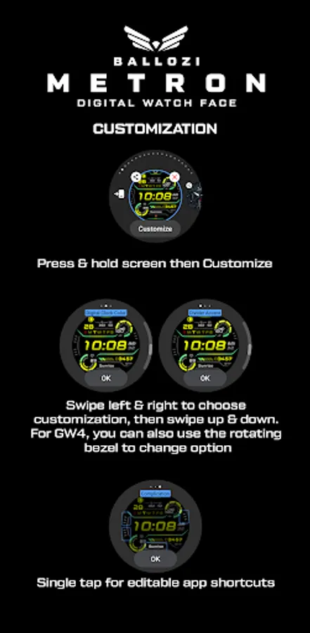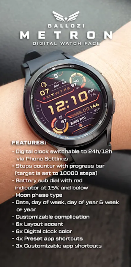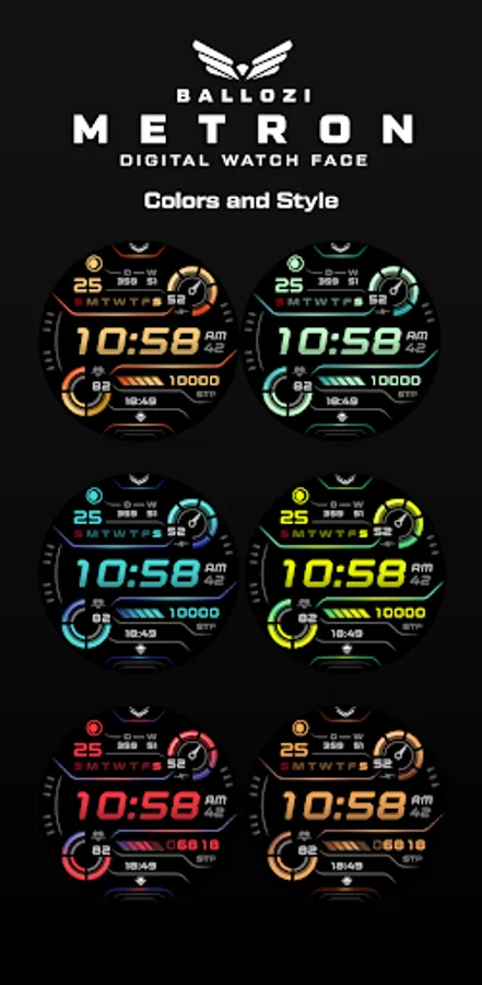 BALLOZI METRON is a futuristic style digital watch face for Wear OS devices. Most viewed in my YouTube Channel and Pinterest with Tizen version. Works great on round smartwatches but not suitable for rectangular and square watches.