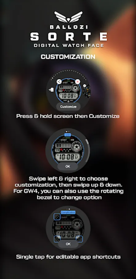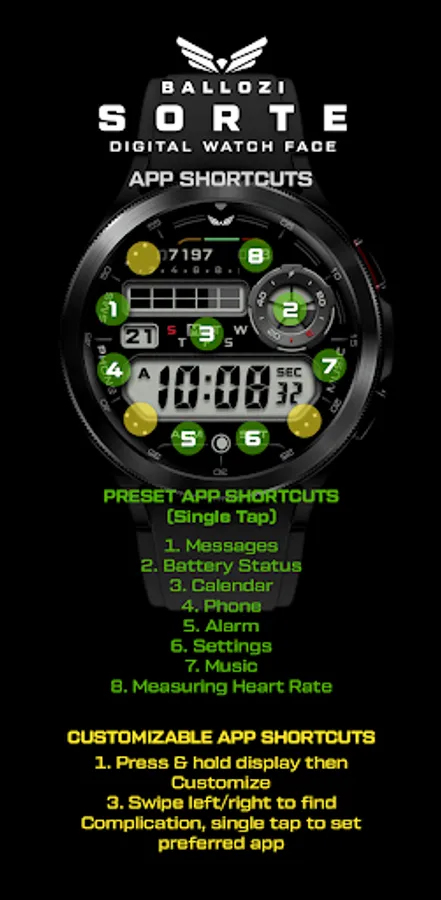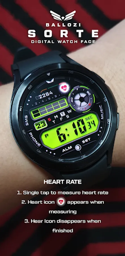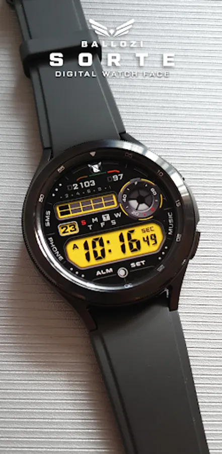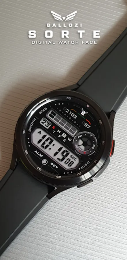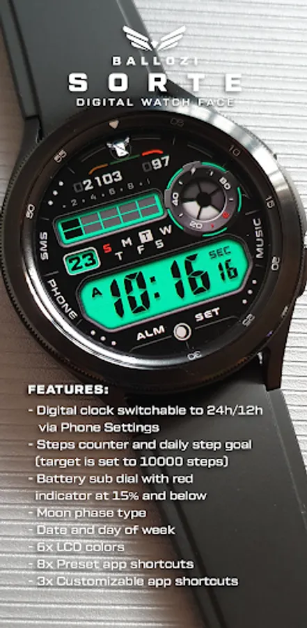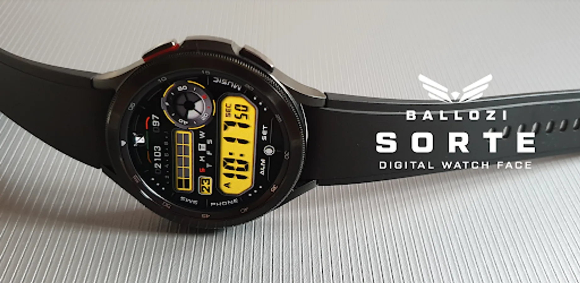 BALLOZI Sorte is a digital retro inspired watch face for Wear OS. This watch face was designed using Watch Face Studio tool and with Galaxy Watch 4 Wear OS as a test device.