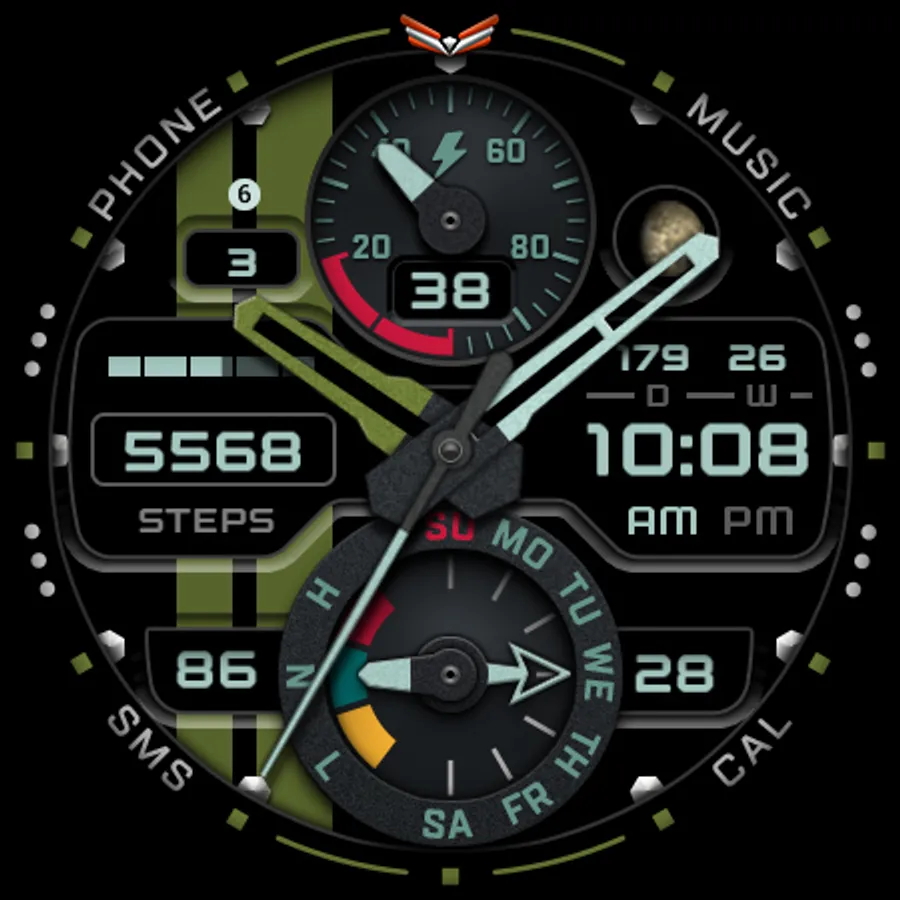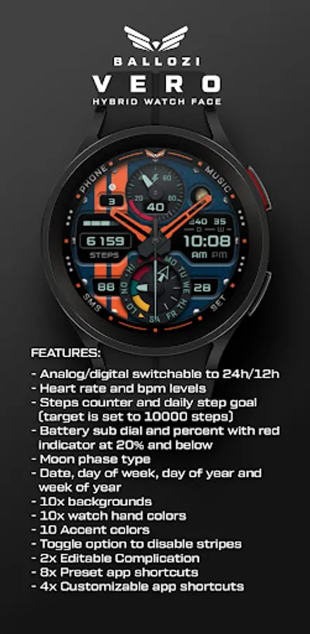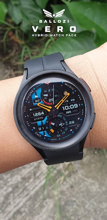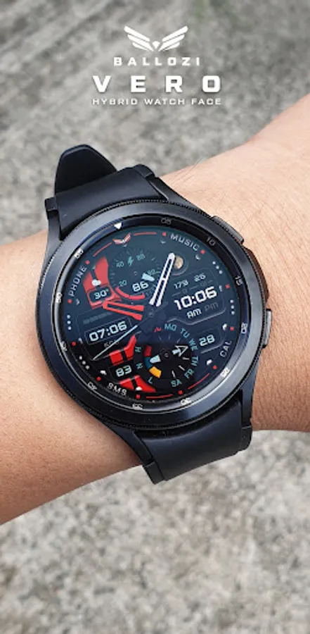 BALLOZI VERO is a sporty analog, military, hybrid watch face for Wear OS devices. This watch face was designed using Watch Face Studio tool and with Galaxy Watch 4 and Galaxy Watch 5 Pro as a test device. Great watch face for round watches and not suitable for rectangular or square watches.