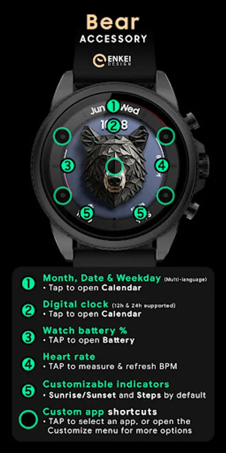 - 5 Custom app shortcuts - Bear head and 4 icons at 2, 4, 8 and 10 o’clock