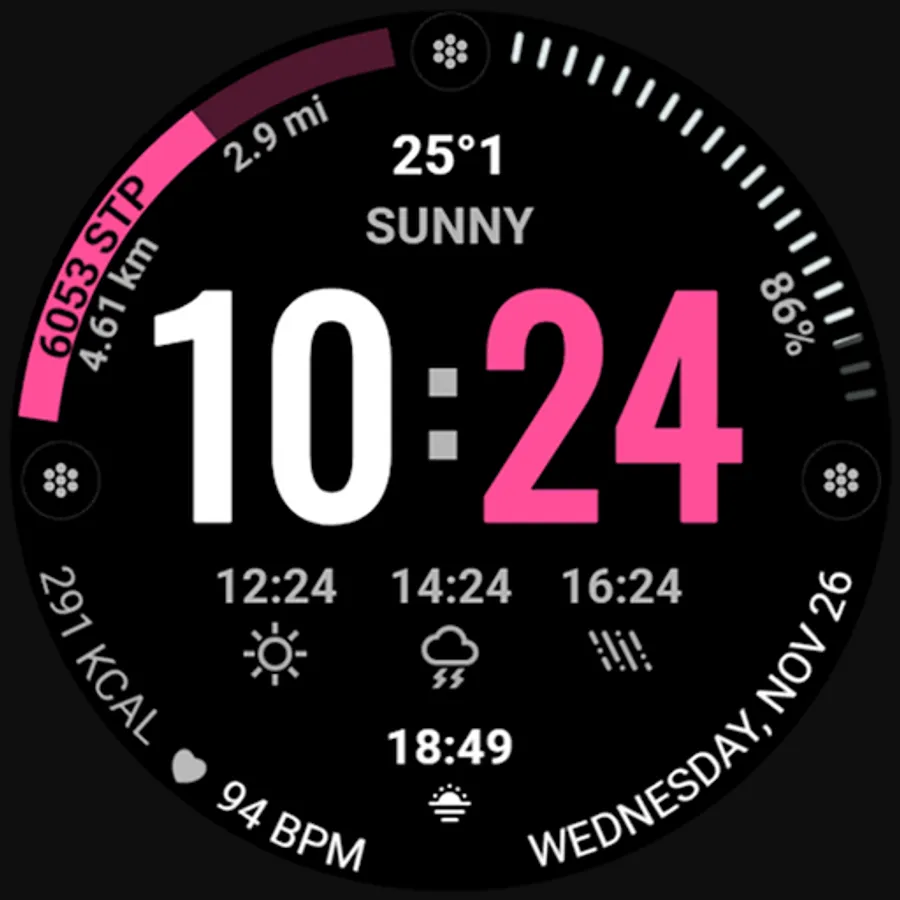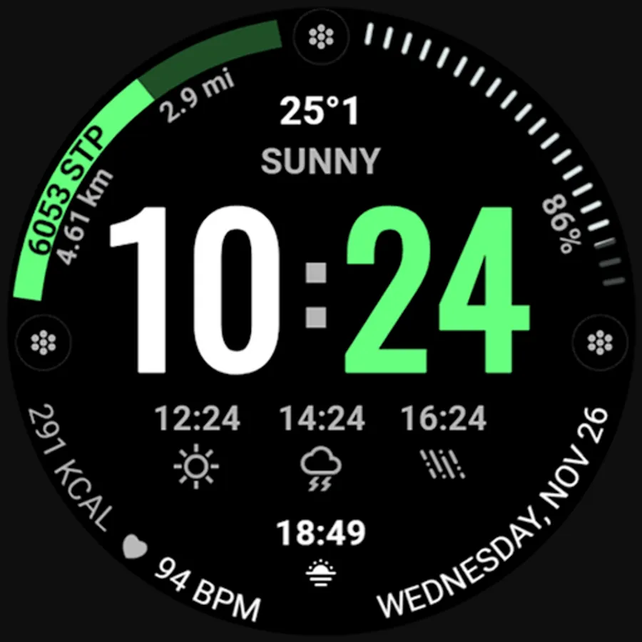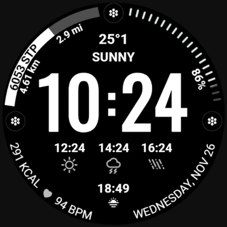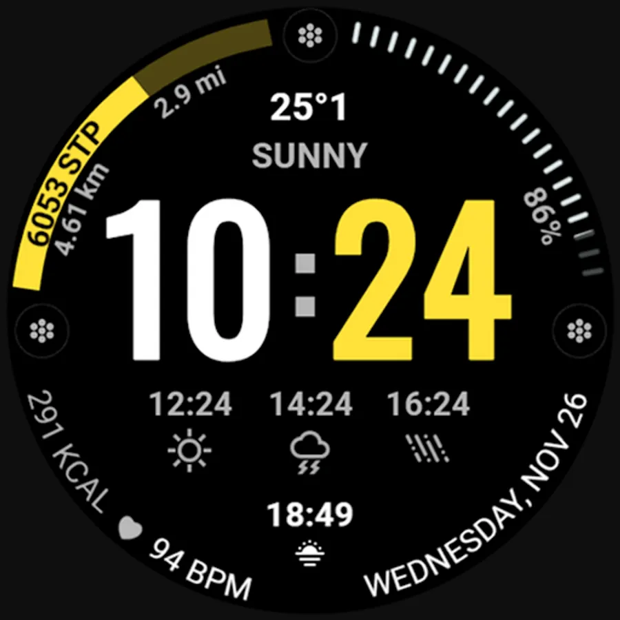 For example, you can select Date, weather, steps, world clock, sunset/sunrise, next appointment, distance walked and more.