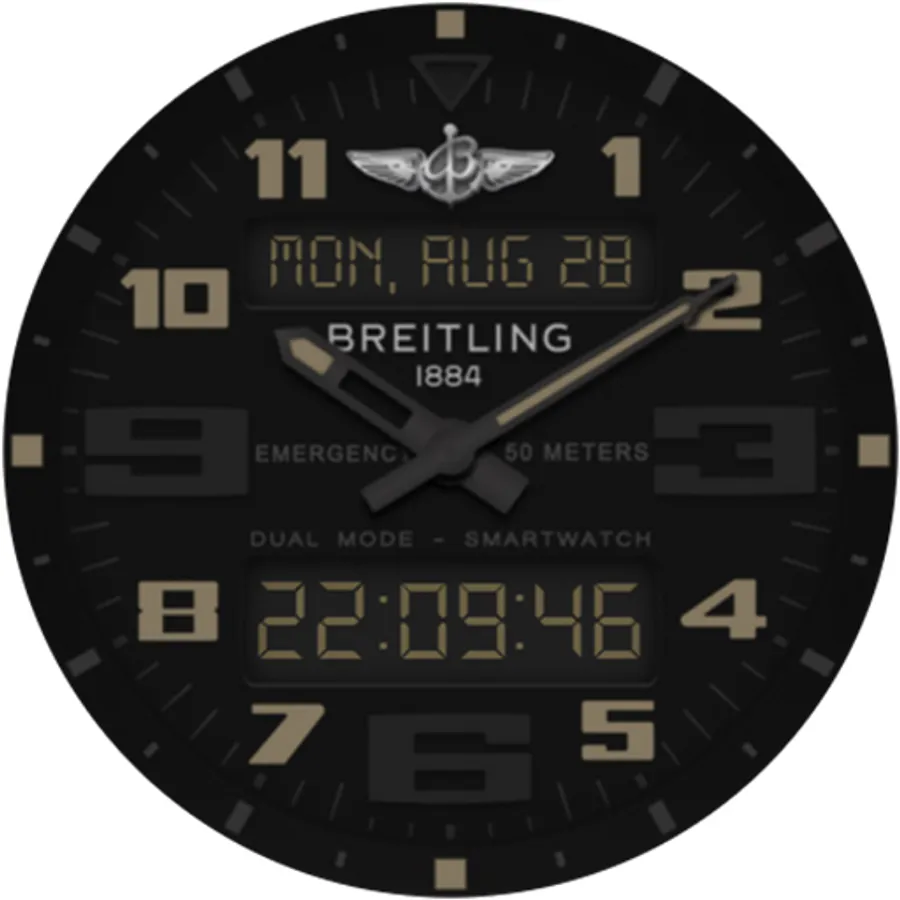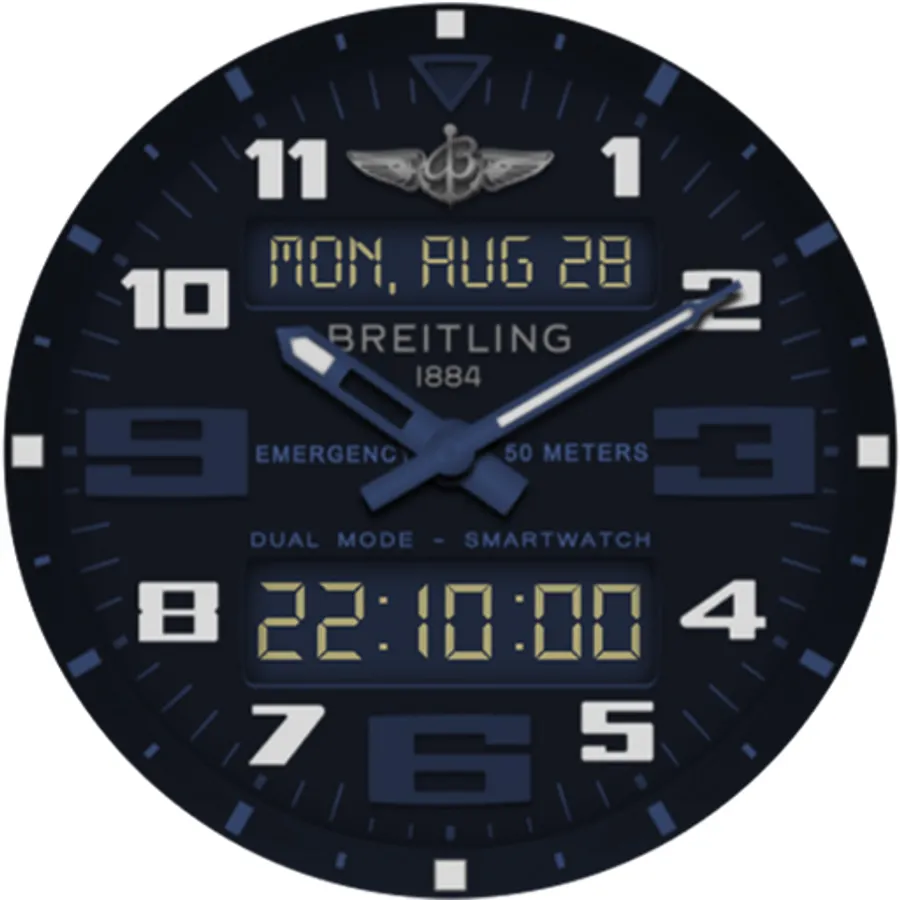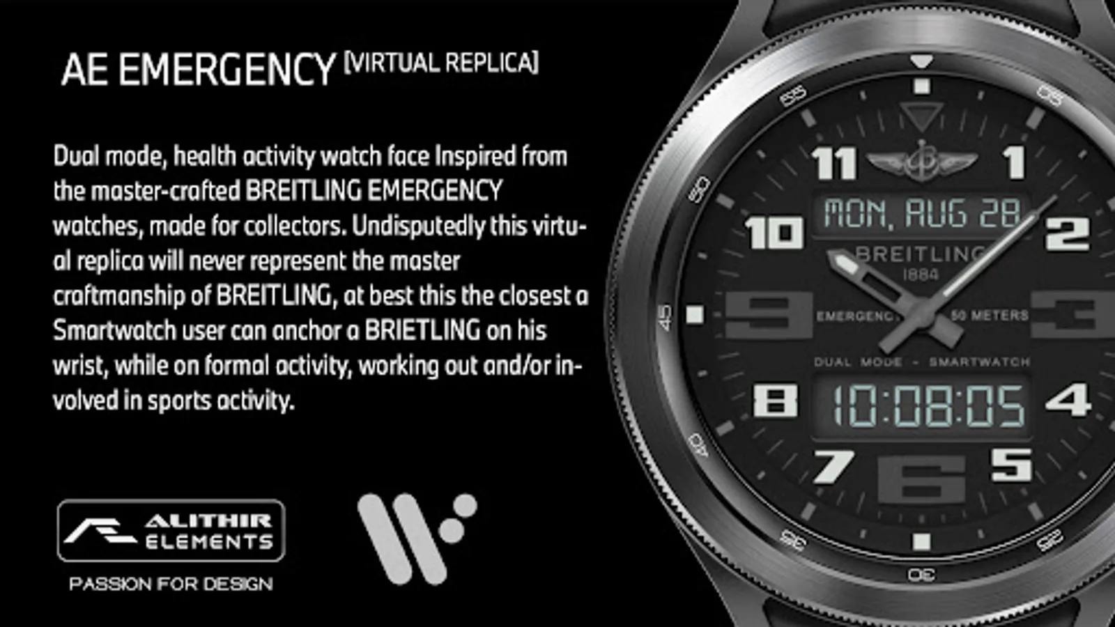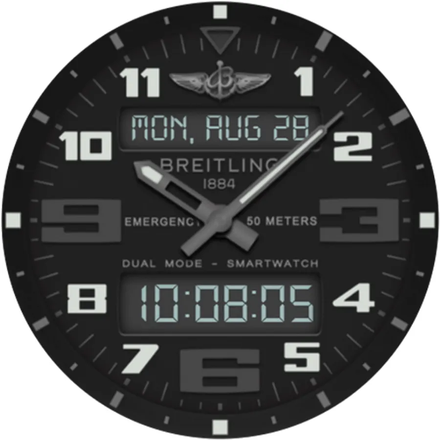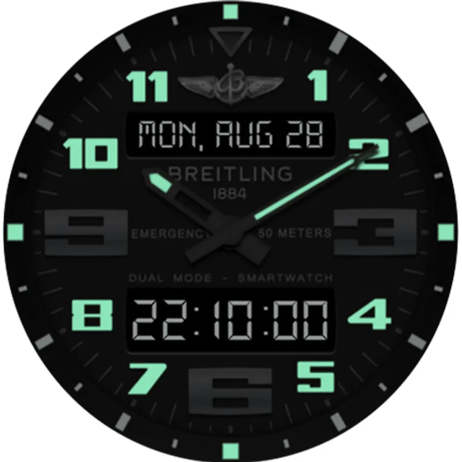 Dual mode, health activity watch face Inspired by the master-crafted BREITLING EMERGENCY watches, made for collectors. Undisputedly this virtual replica will never represent the master craftmanship of BREITLING, at best this is the closest a Smartwatch user can anchor a BREITLING on his wrist, while in formal activity, working out, and/or involved in sports activity.