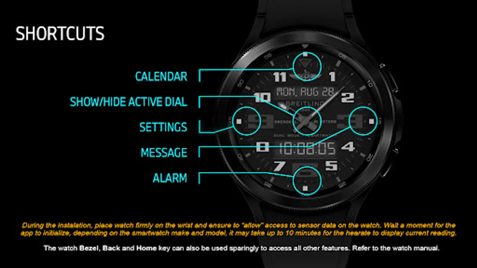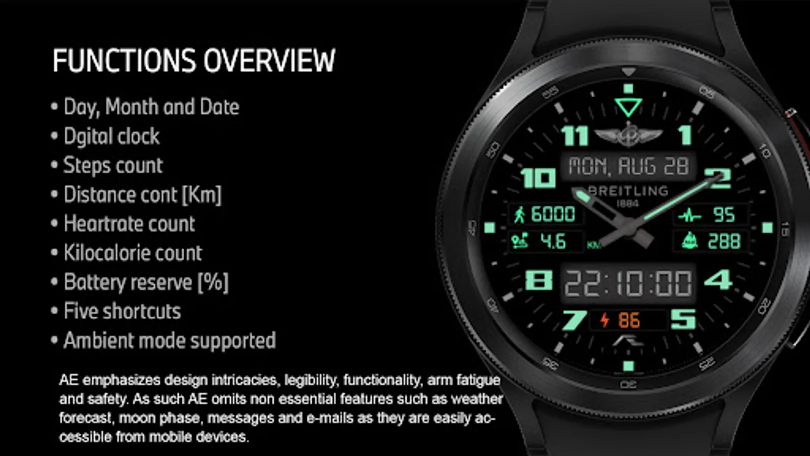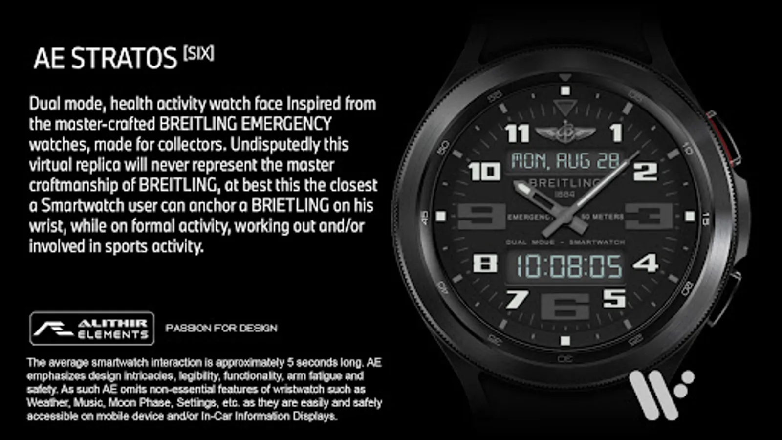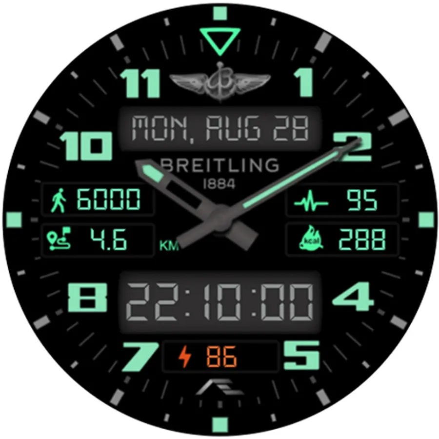 Dual mode, health activity watch face Inspired by the master-crafted BREITLING EMERGENCY watches, made for collectors. Undisputedly this virtual replica will never represent the master craftmanship of BREITLING, at best this is the closest a Smartwatch user can anchor a BREITLING on his wrist, while in formal activity, working out, and/or involved in sports activity.