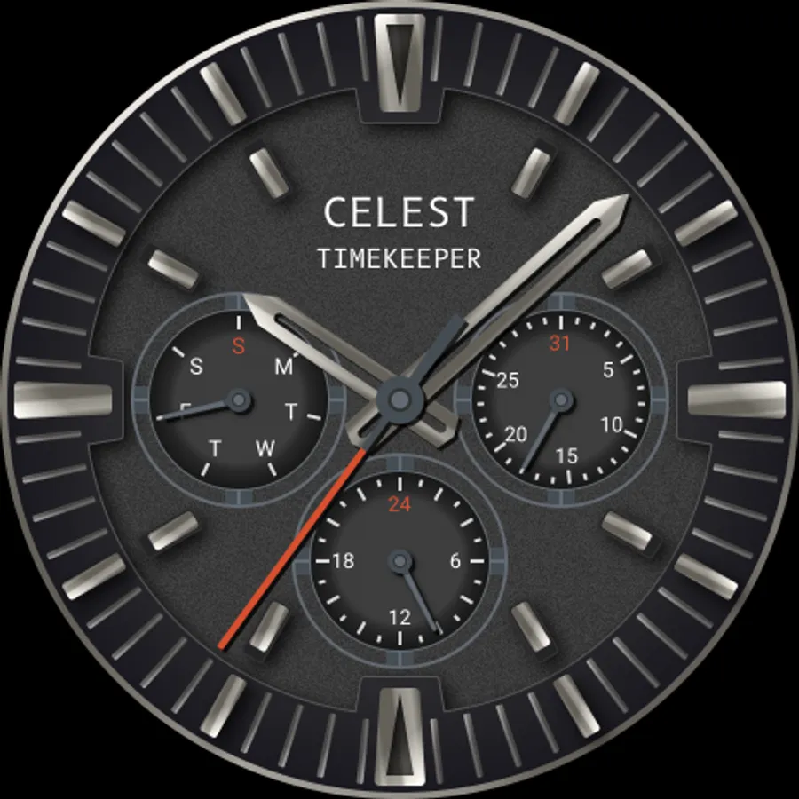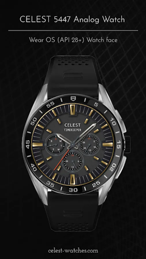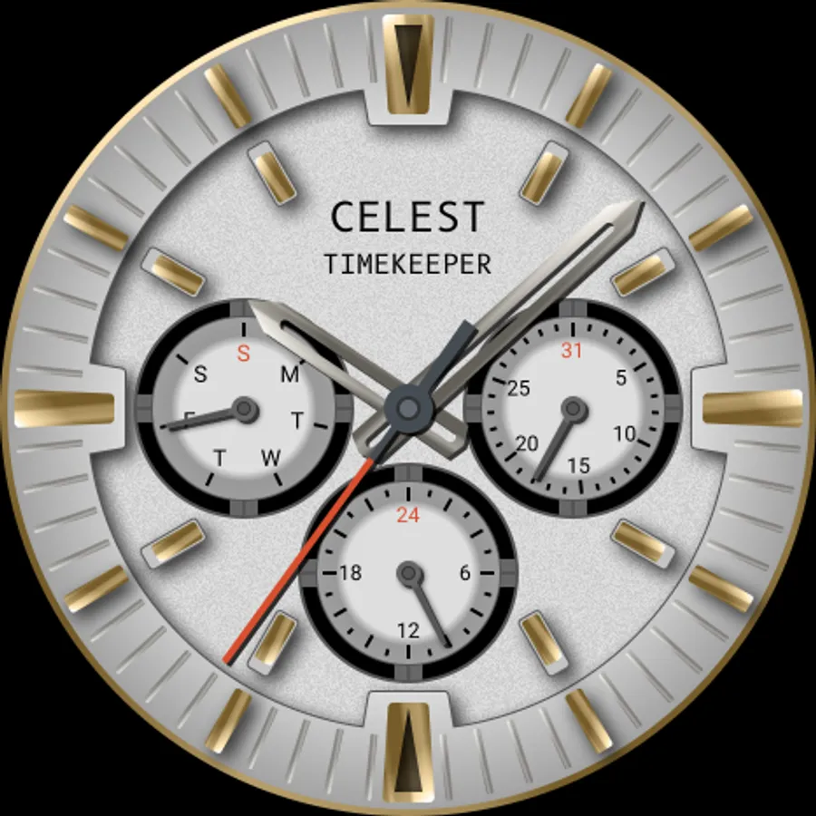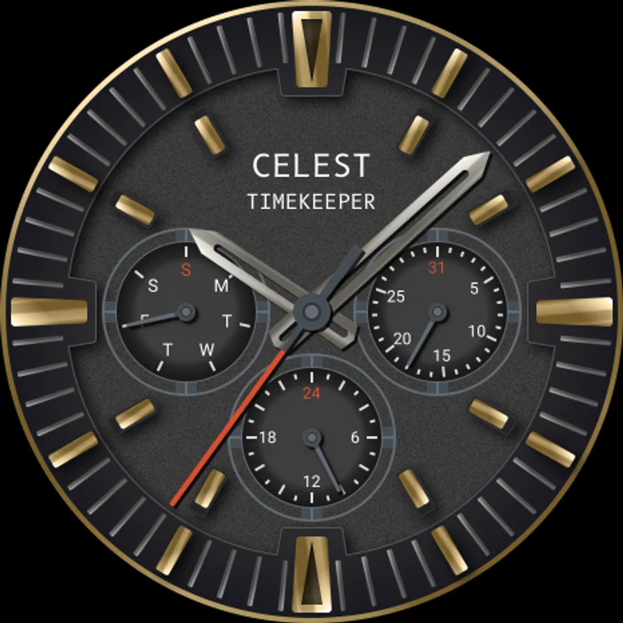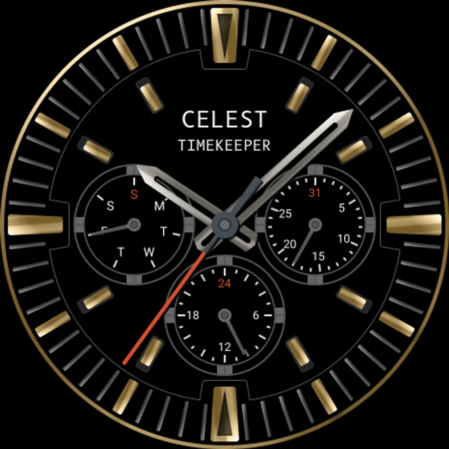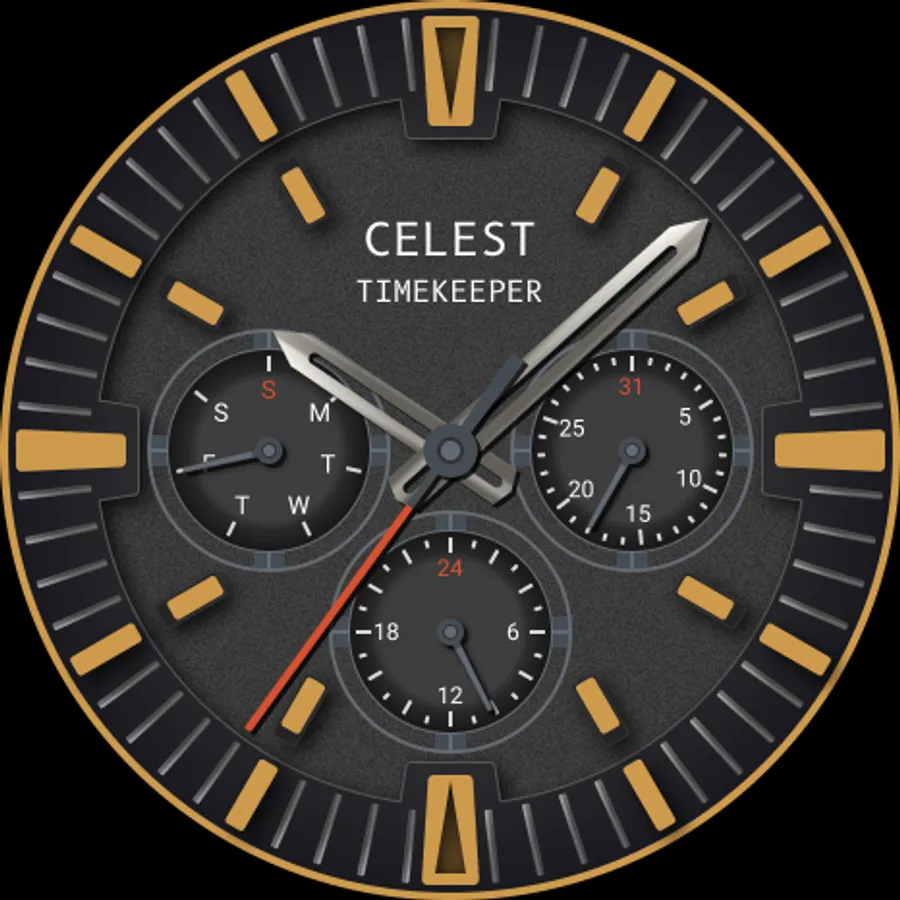 A classic analog watch face that embodies the essence of CELEST Watches. It features a unique combination of gold on dark grey, setting it apart from our other designs. However, don't worry if it's not your style, as we also provide seven other color variations to choose from. This watch face includes complications such as a weekday and day dial, as well as a 24-hour dial, adding functionality to its timeless aesthetic.