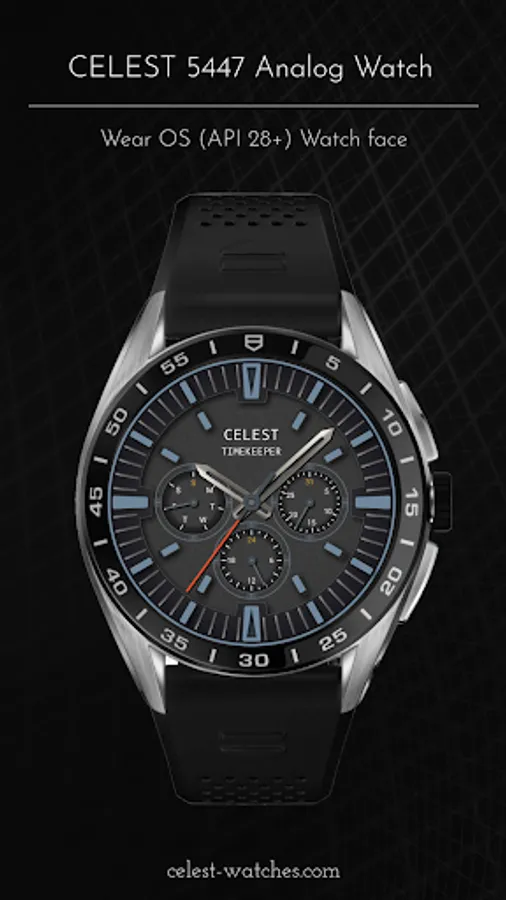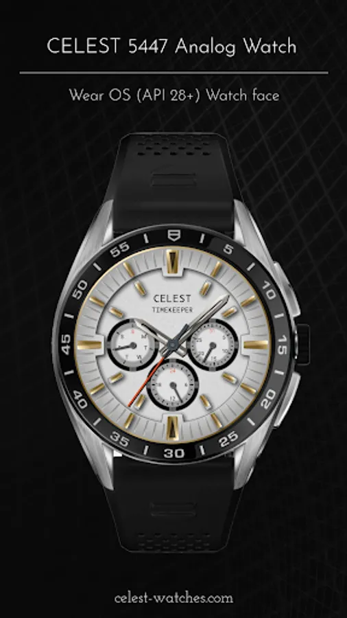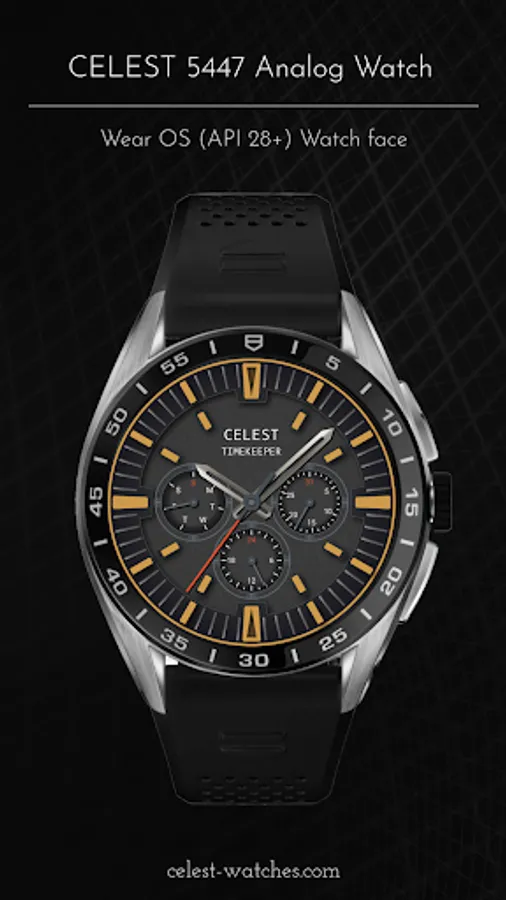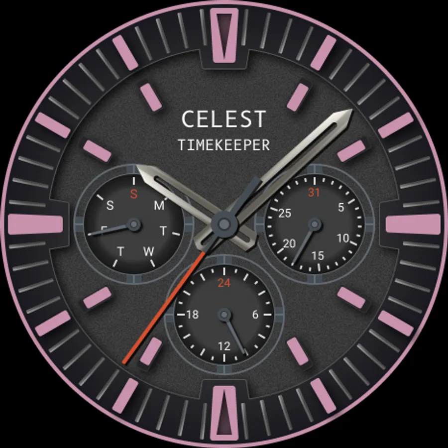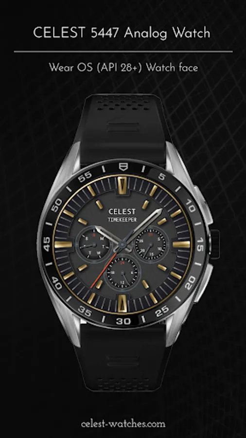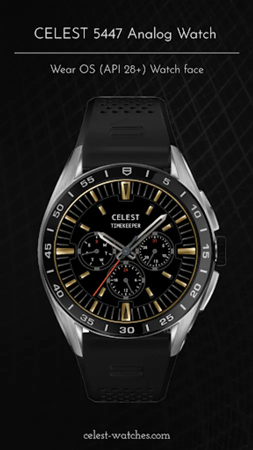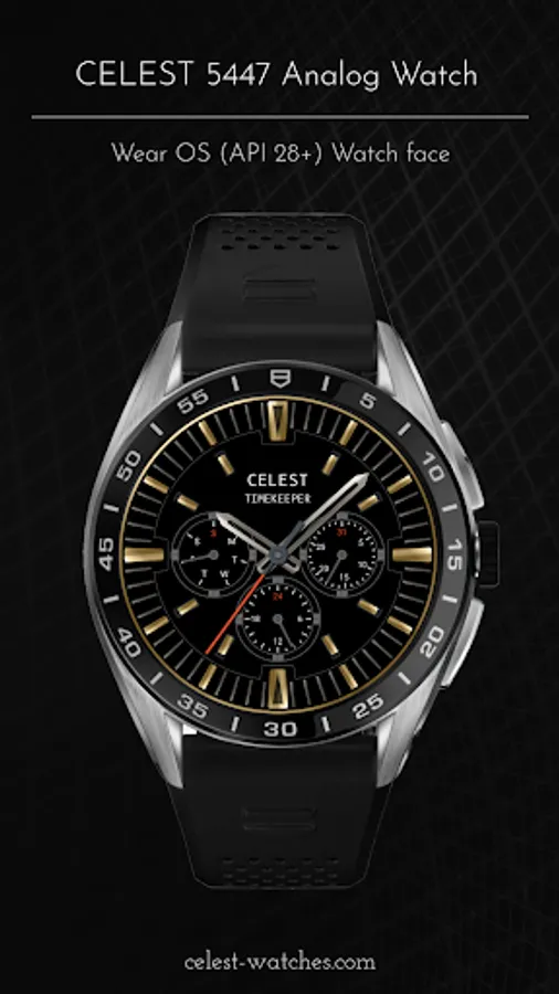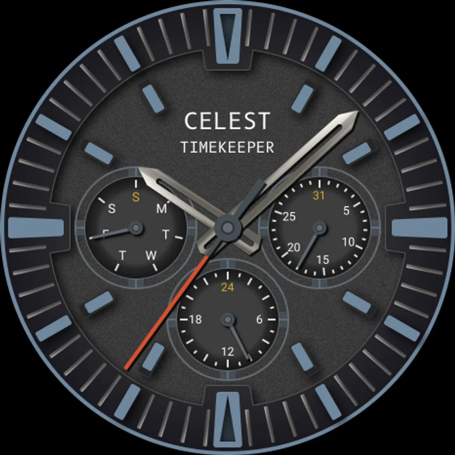 A classic analog watch face that embodies the essence of CELEST Watches. It features a unique combination of gold on dark grey, setting it apart from our other designs. However, don't worry if it's not your style, as we also provide seven other color variations to choose from. This watch face includes complications such as a weekday and day dial, as well as a 24-hour dial, adding functionality to its timeless aesthetic.