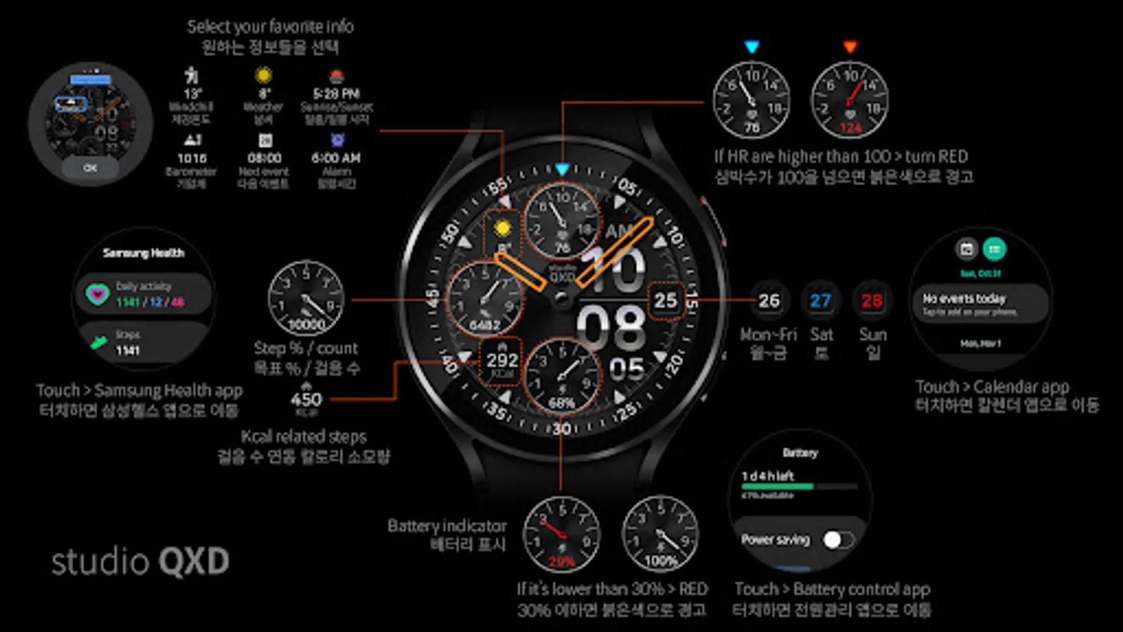 - Customizable information text and icon such as weather, next event, barometer, alarm, etc.