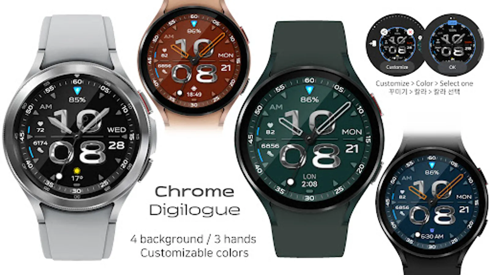 - Customizable 4 colors of background, and Chromic metal digit (time and minute) GYRO effect.