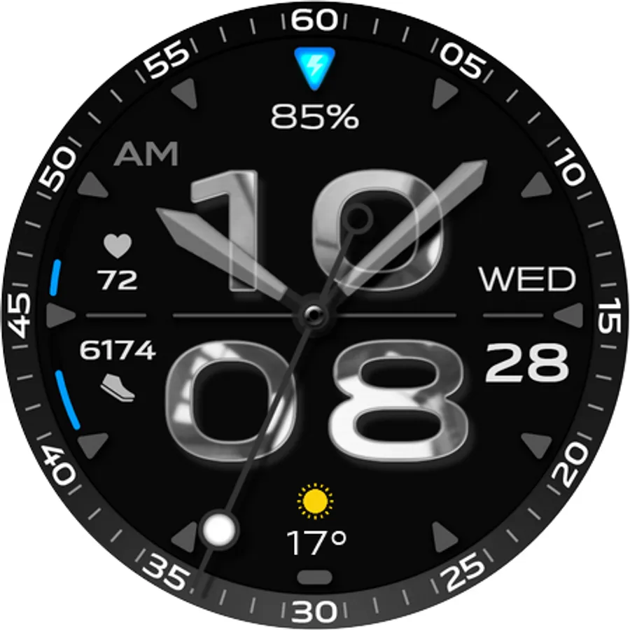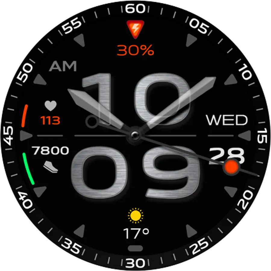 - Digital progress bars of Step counts, Heart rates, and Battery remain %.