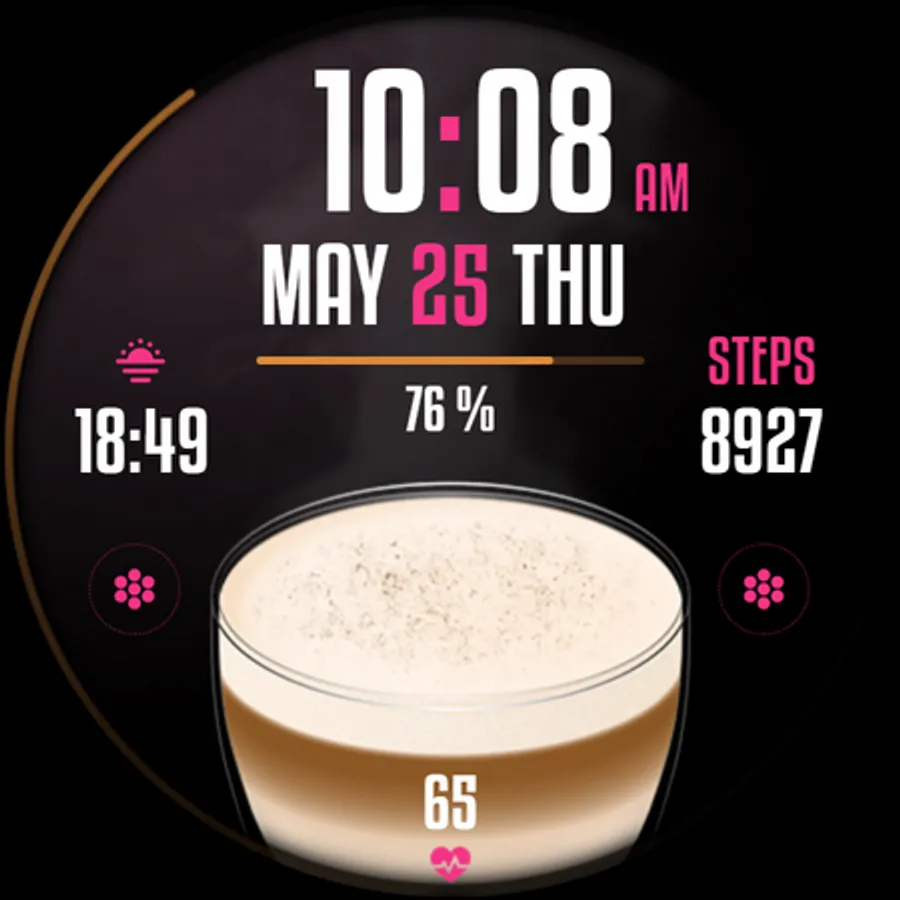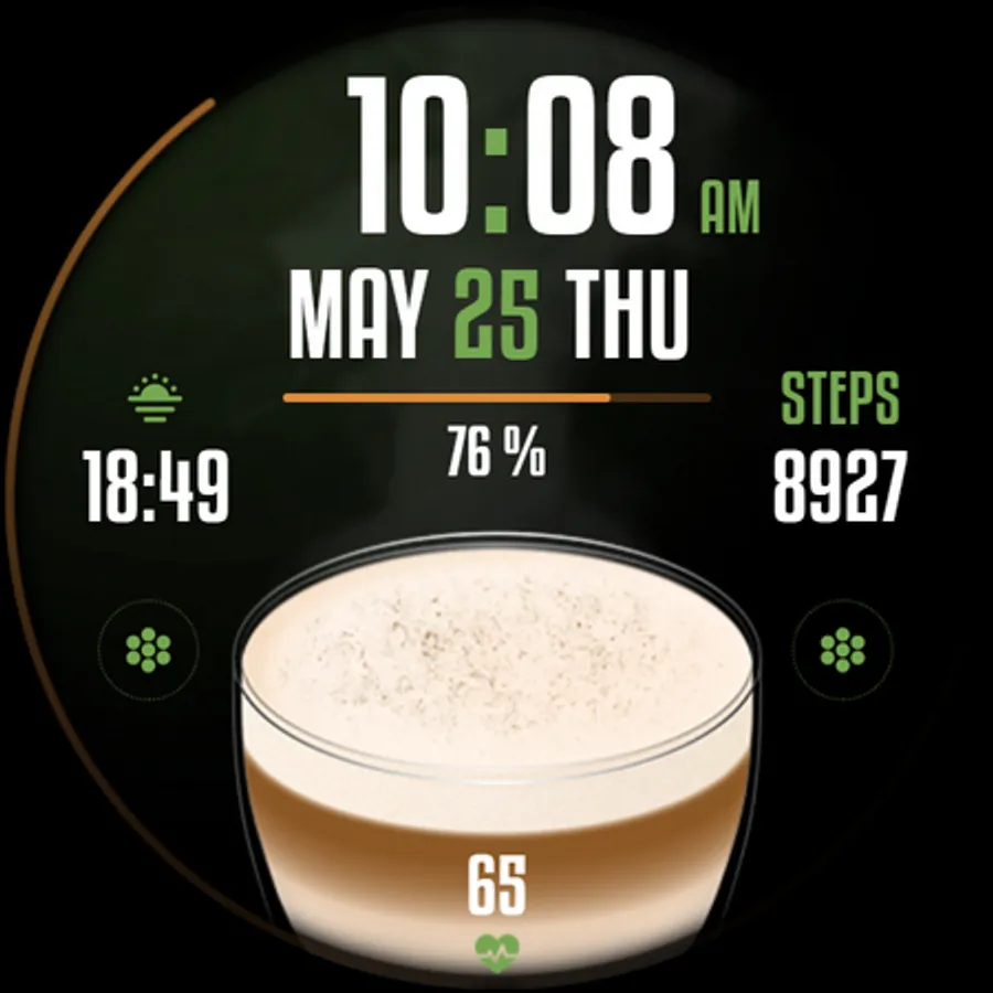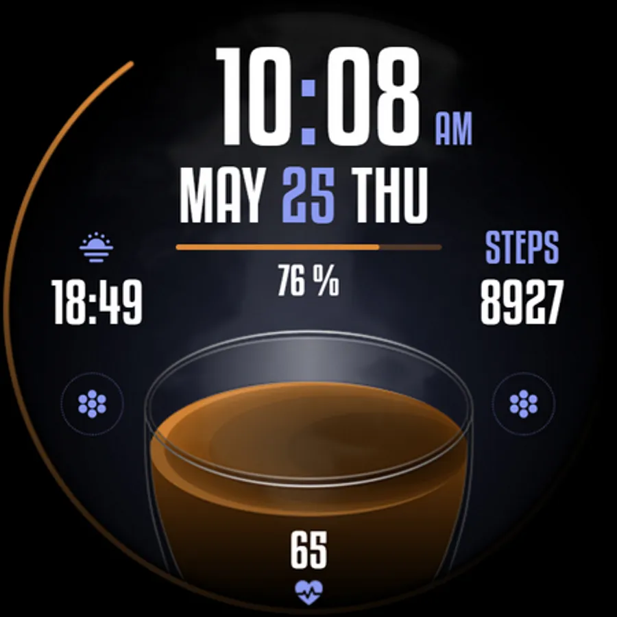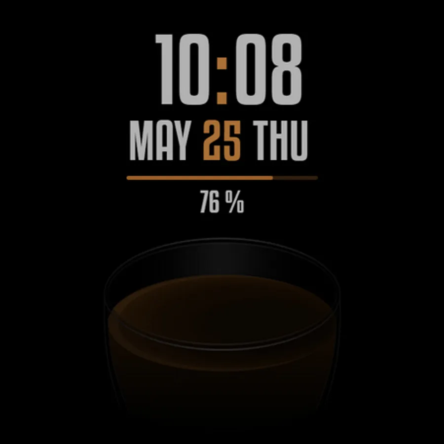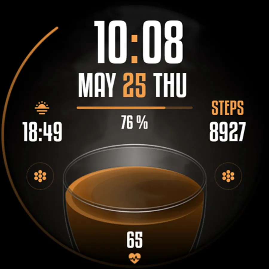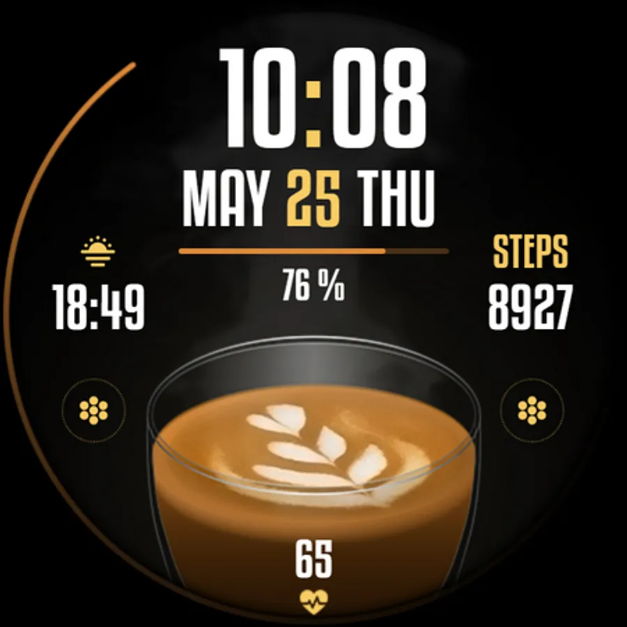 Coffee Time is a perfect watch face for coffee enthusiasts, featuring several coffee types and a lovely steaming animation.