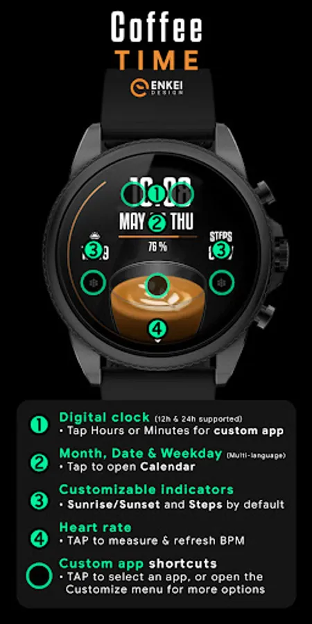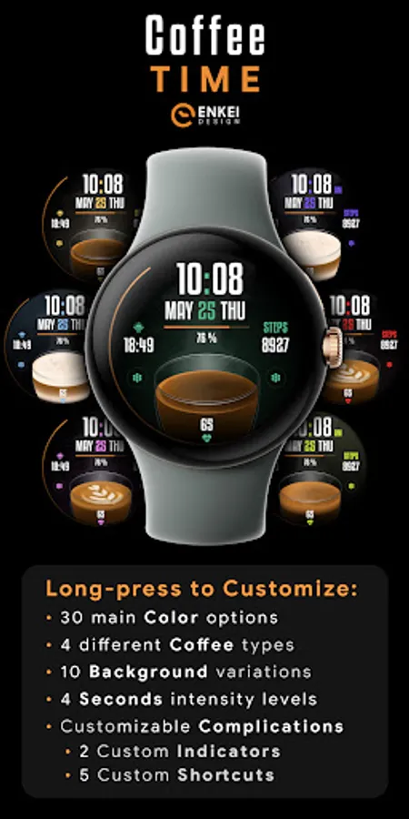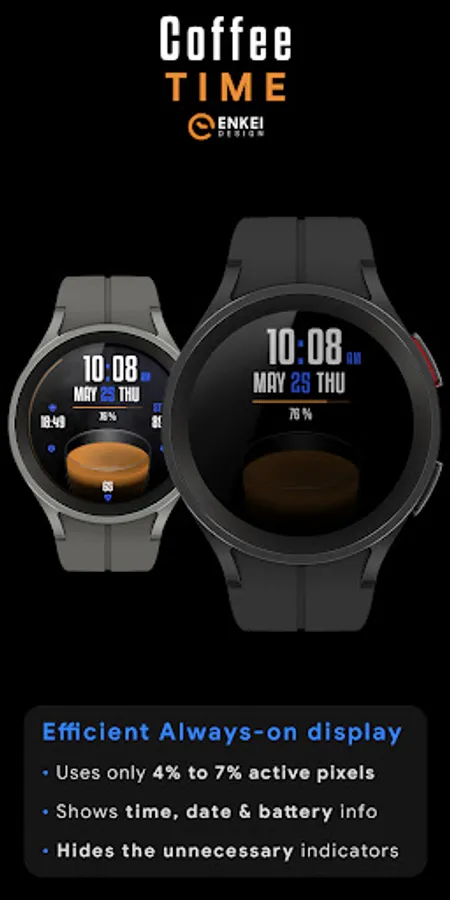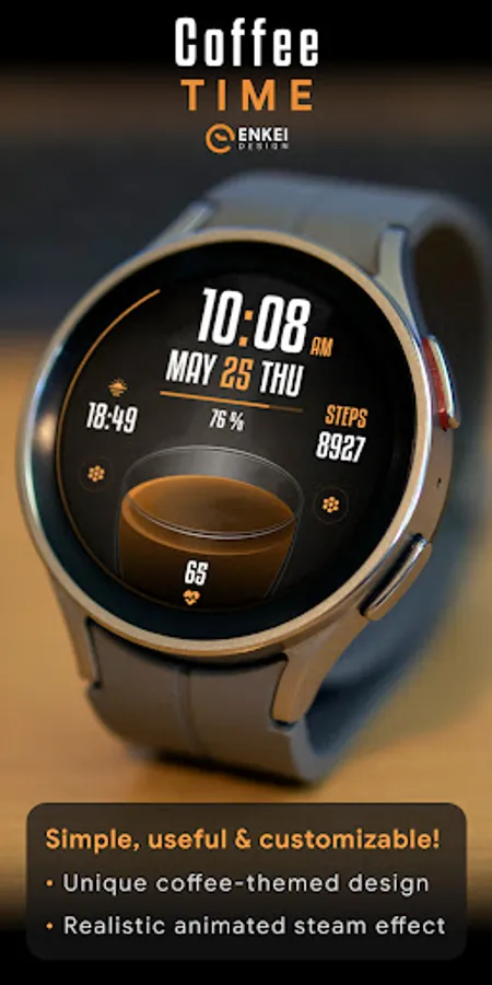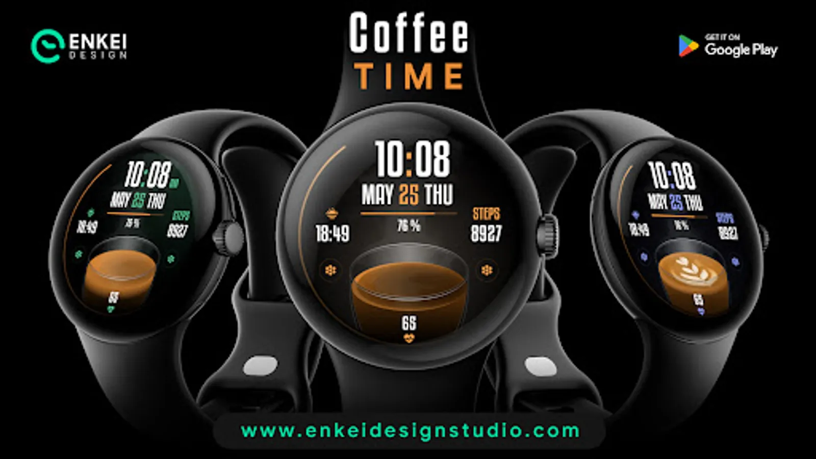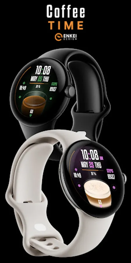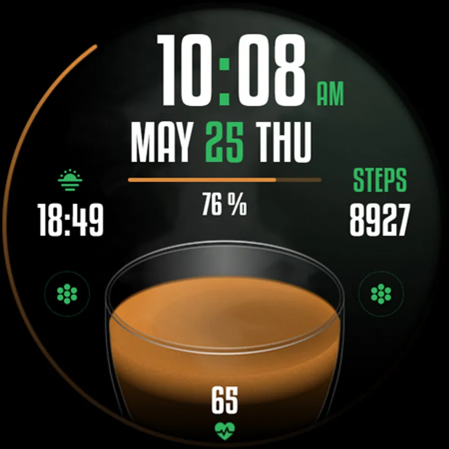 Coffee Time is a perfect watch face for coffee enthusiasts, featuring several coffee types and a lovely steaming animation.