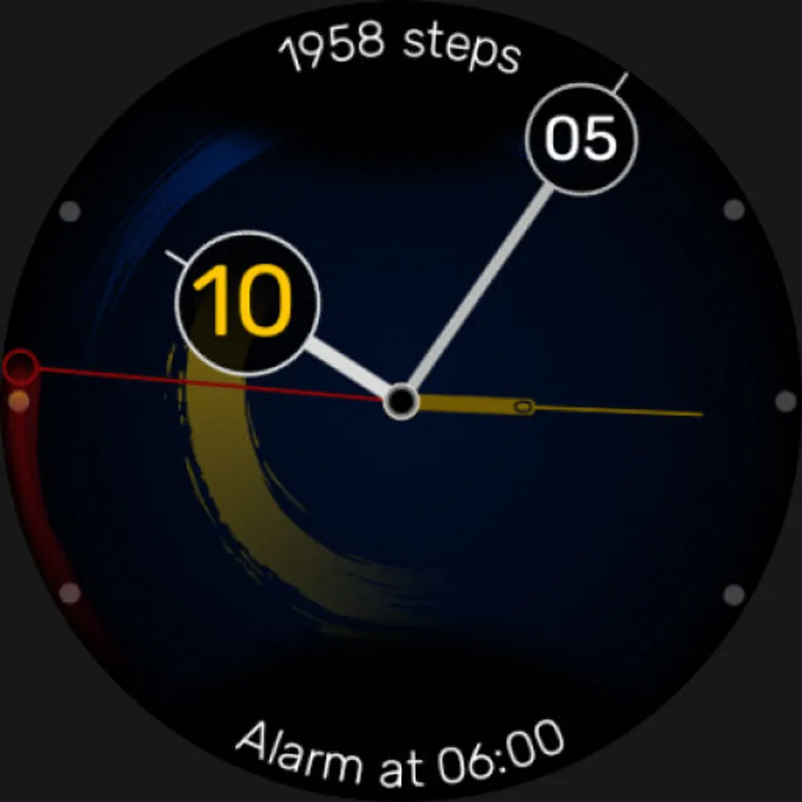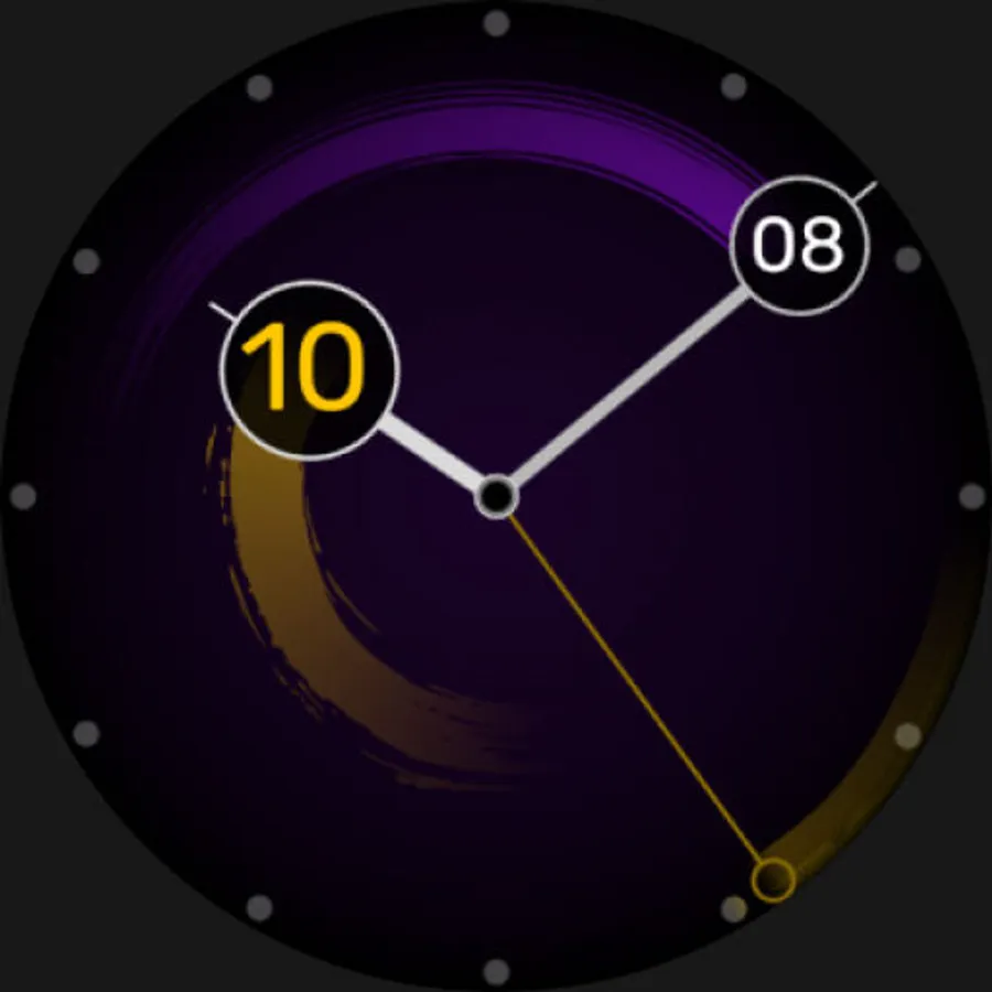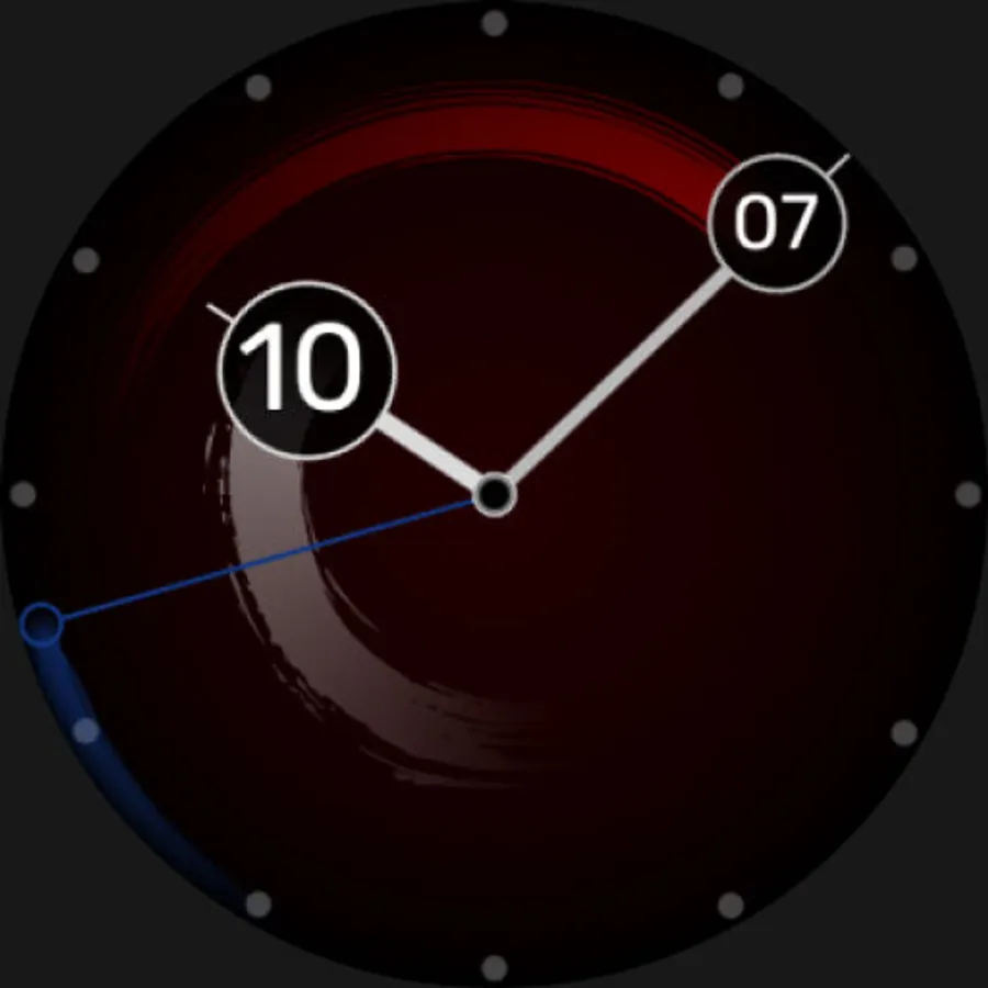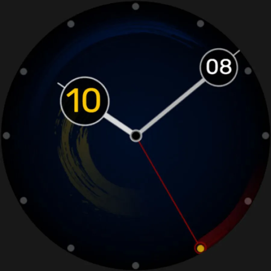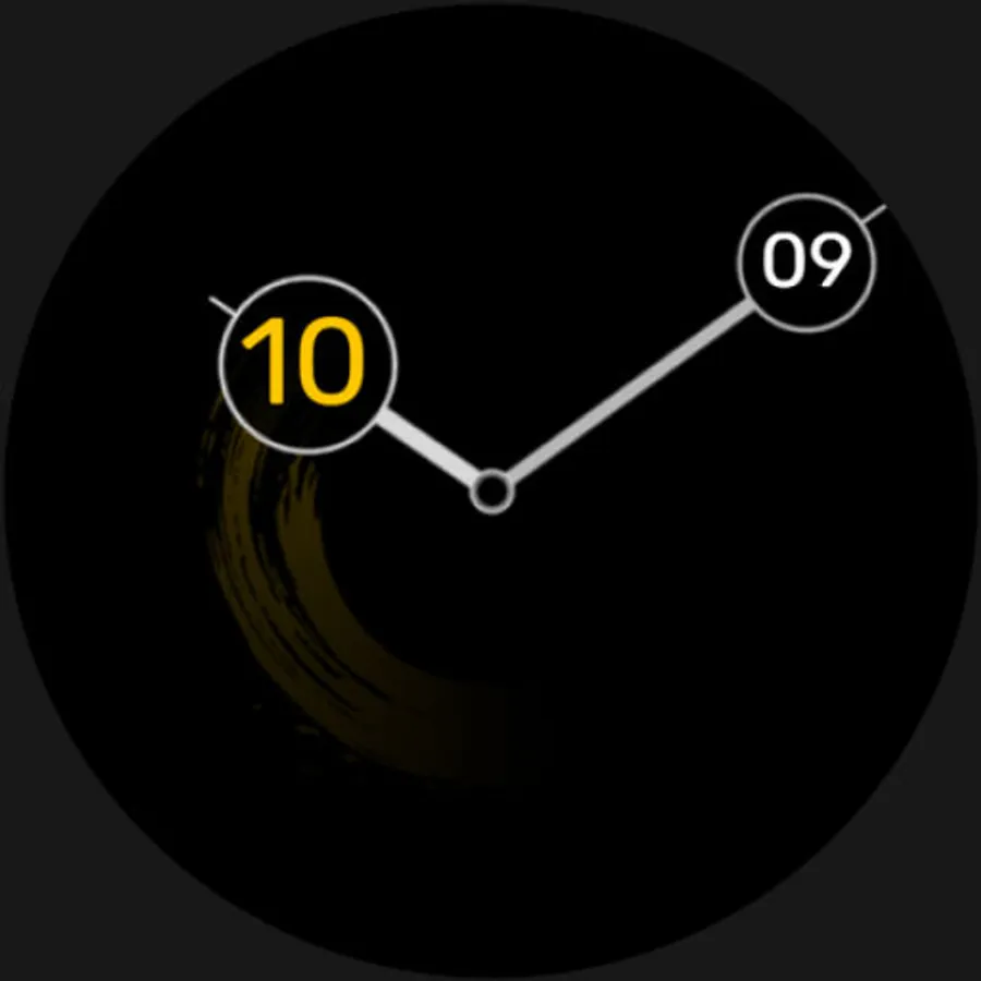 Analog watch face where each hand has its own color trail that depends on the current color theme.