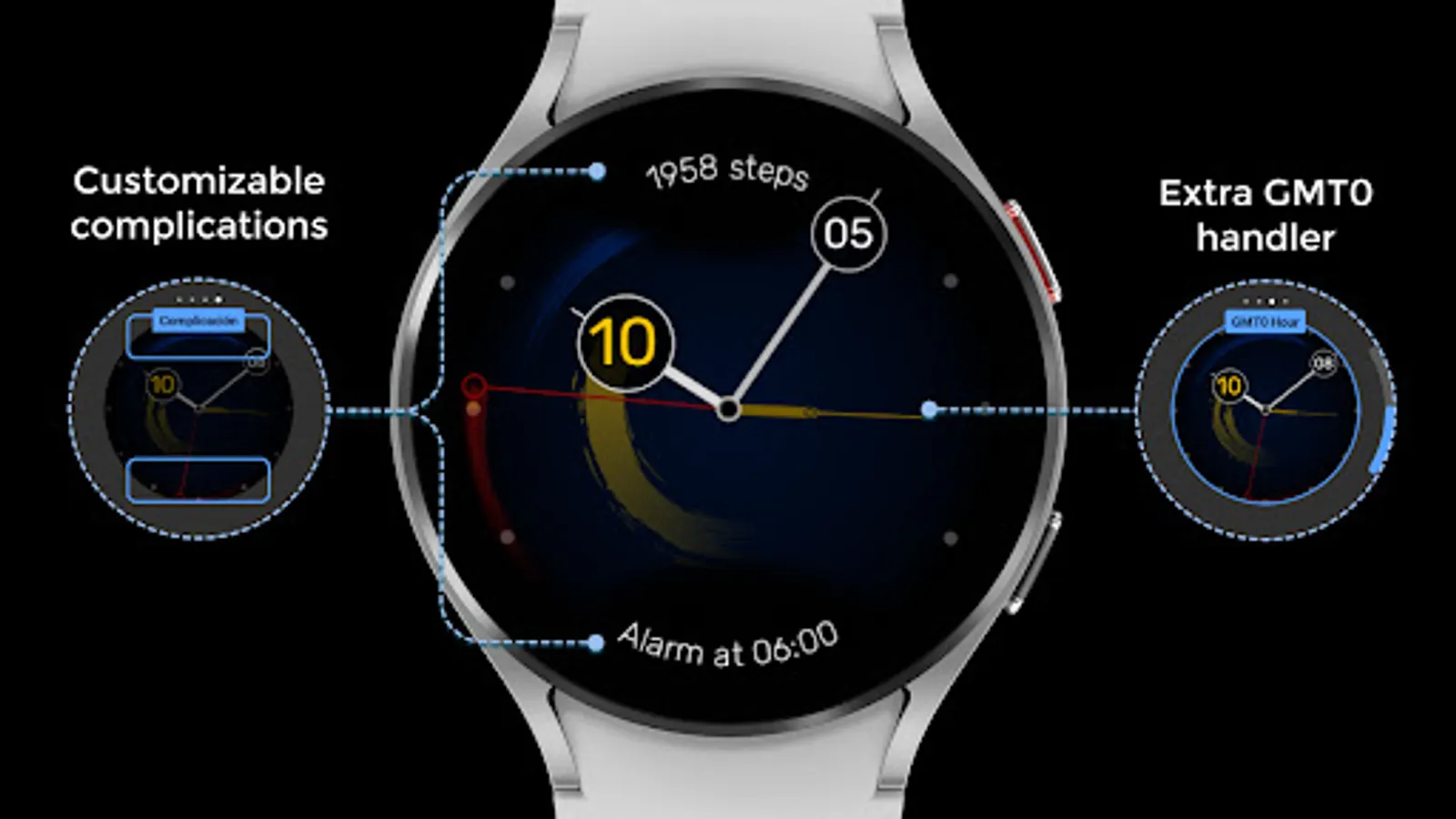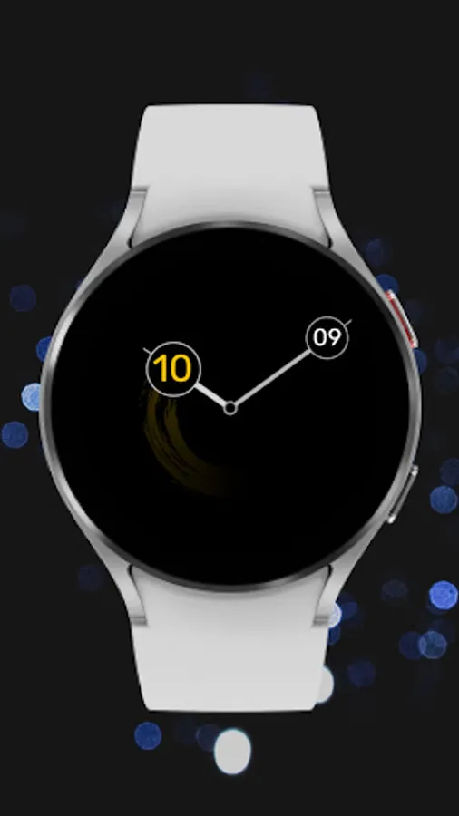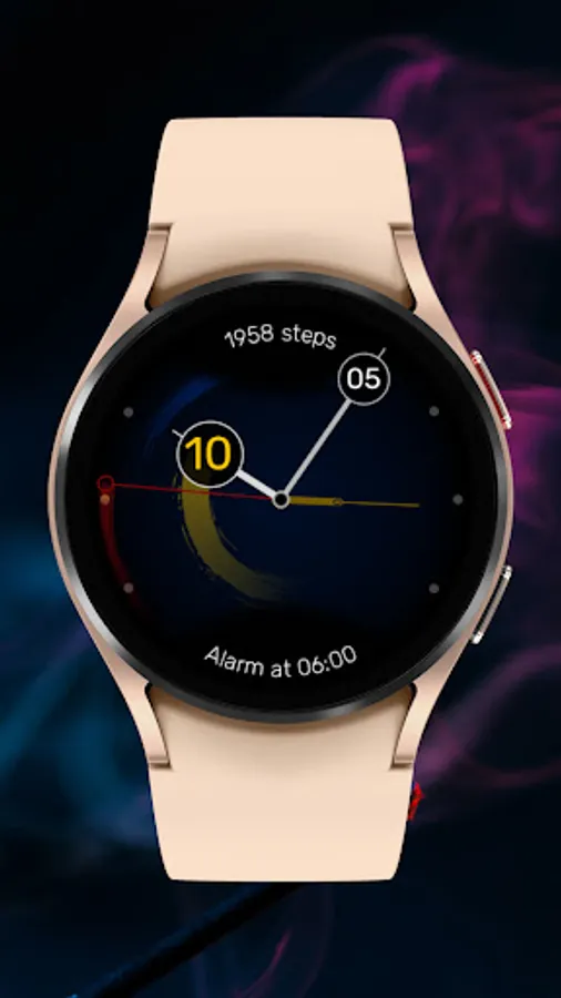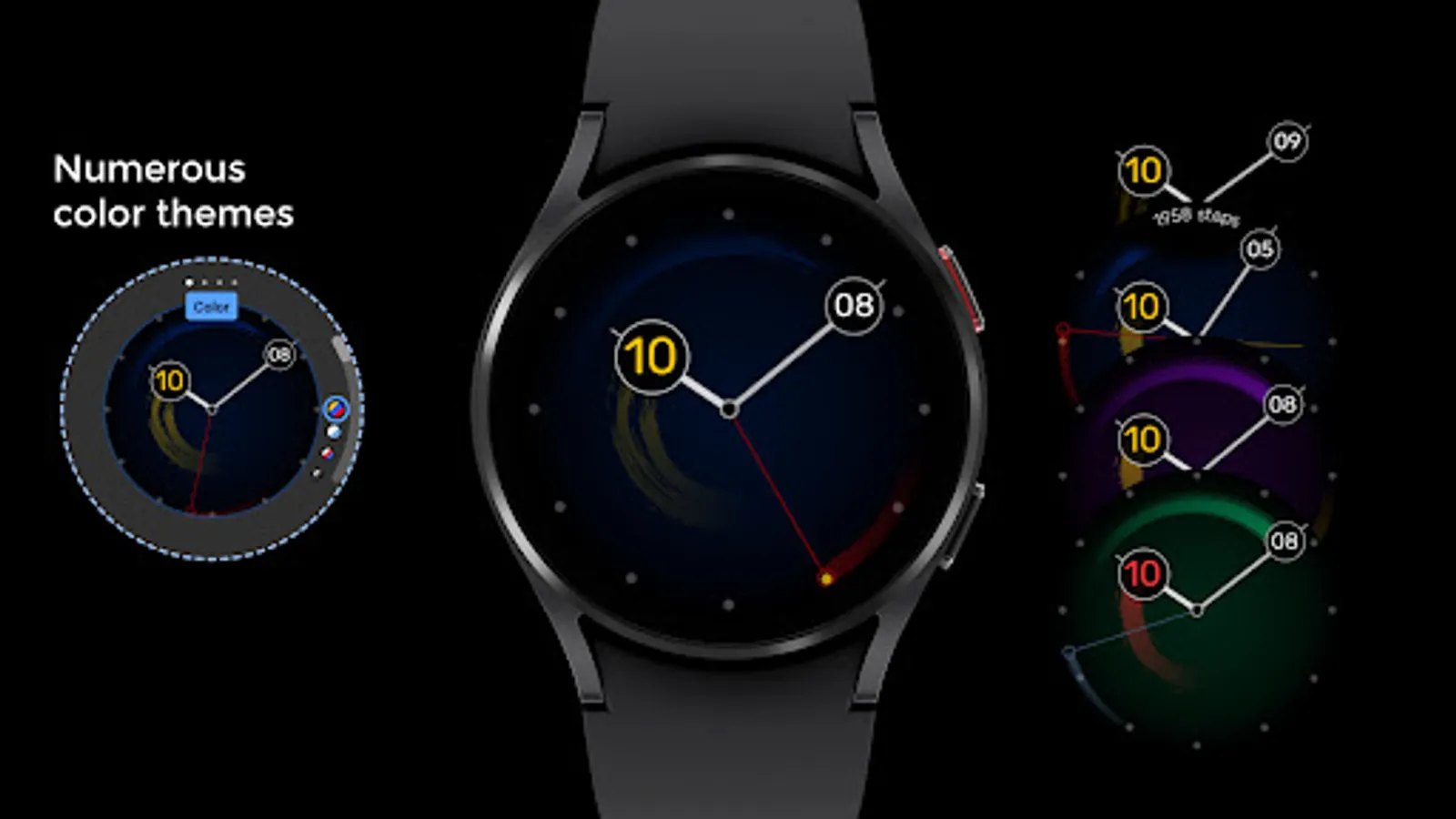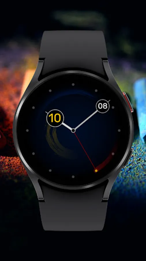 Analog watch face where each hand has its own color trail that depends on the current color theme.