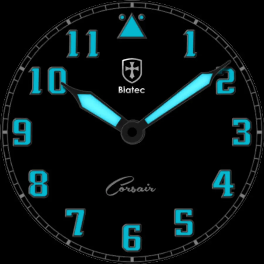 This watch belongs to the pilot style Biatec Corsair Collection. Polished hands are filled with the finest Super-LumiNova® and a fine quality leather strap with contrast stitching and a stainless-steel buckle.