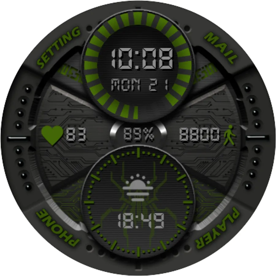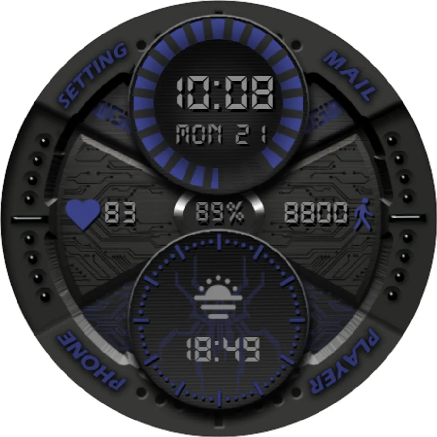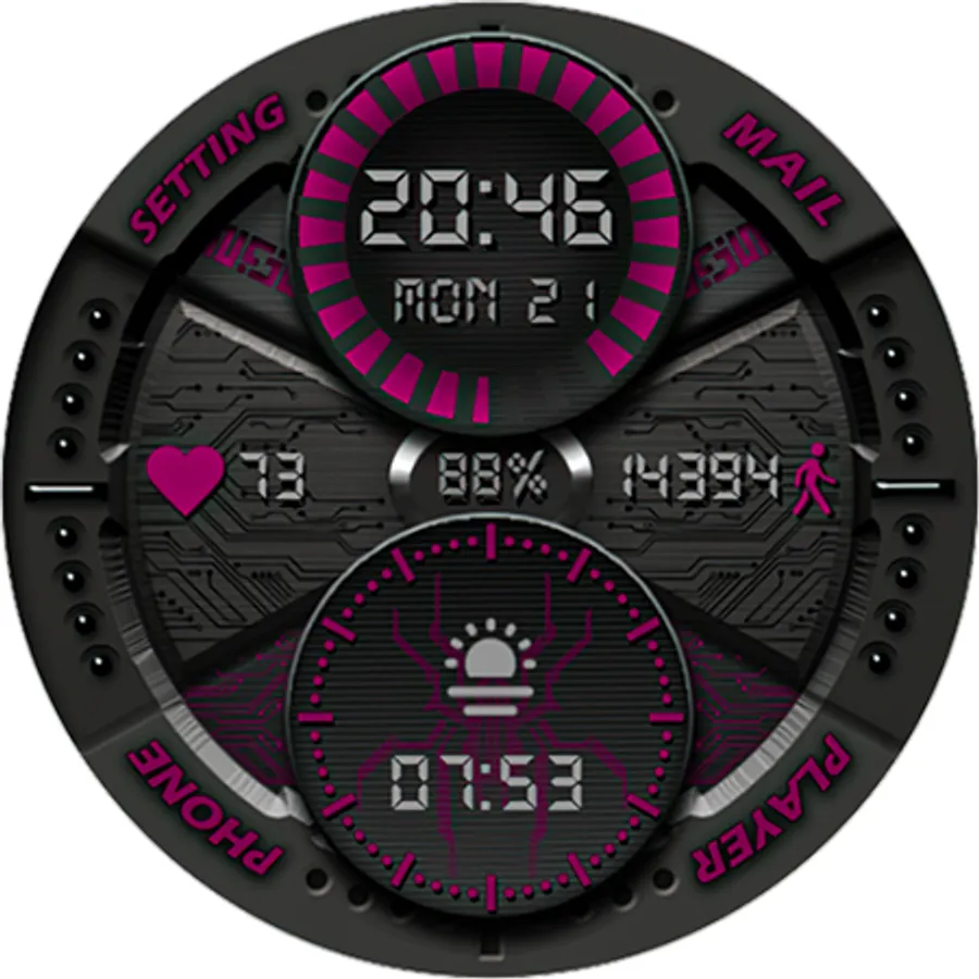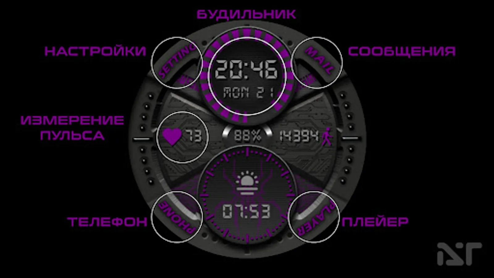 -Тап зоны на главном экране:(Телефон, Сообщения, Плейер, Настройки, Измерение пульса, Будильник- смотрите изображение)