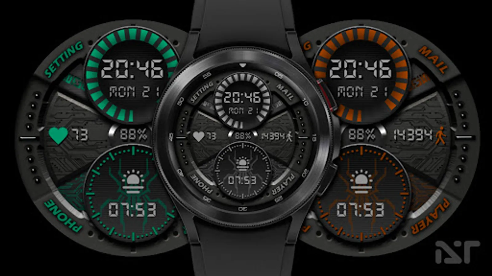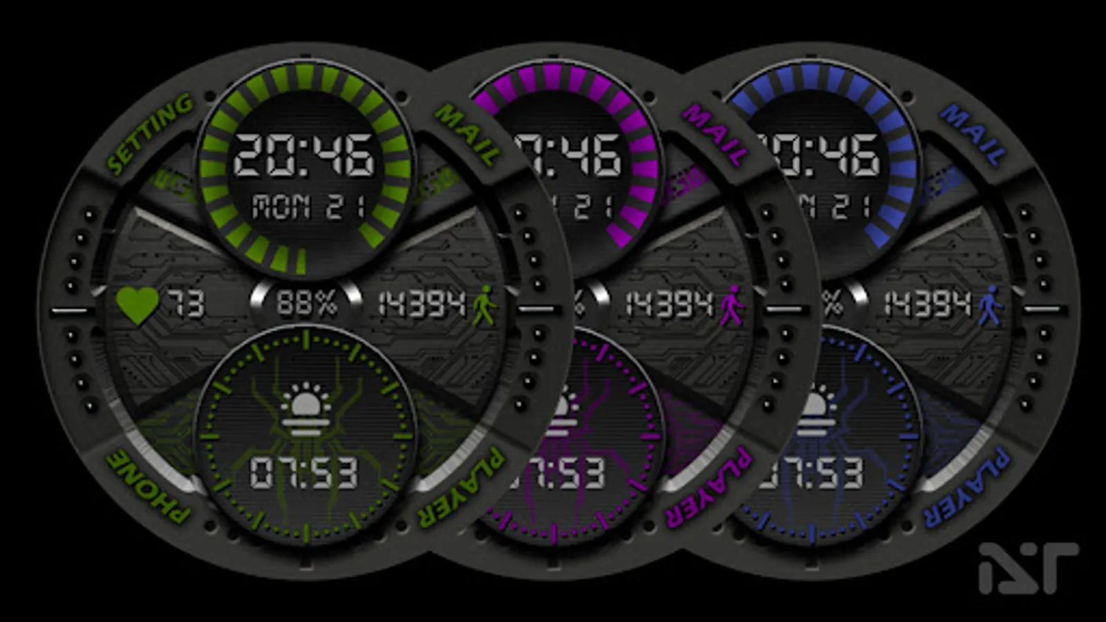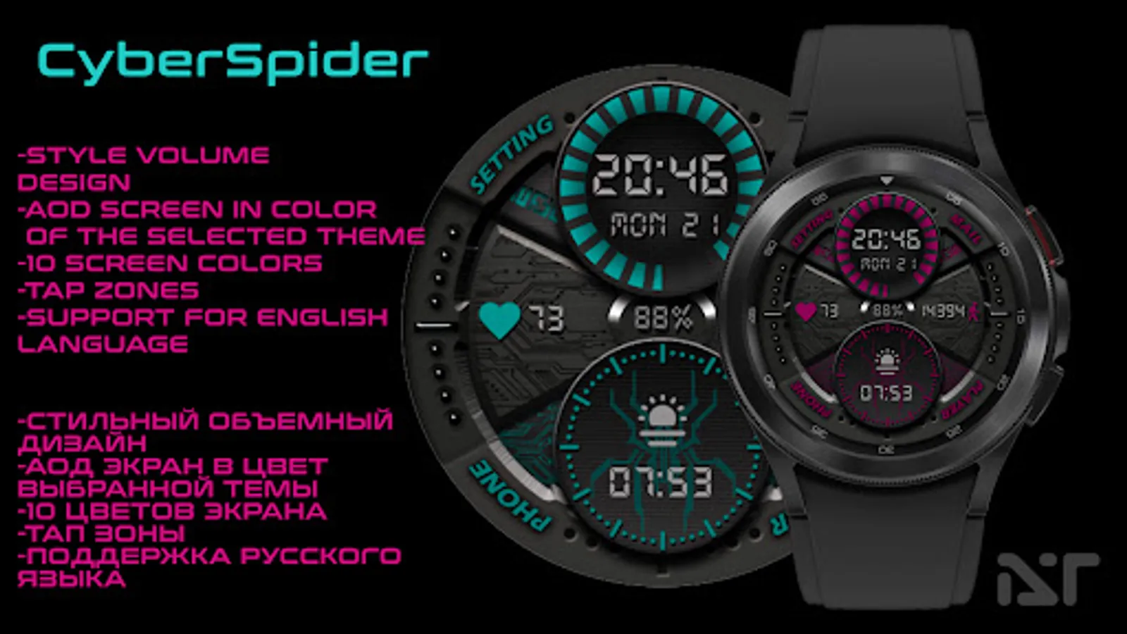 -Тап зоны на главном экране:(Телефон, Сообщения, Плейер, Настройки, Измерение пульса, Будильник- смотрите изображение)
