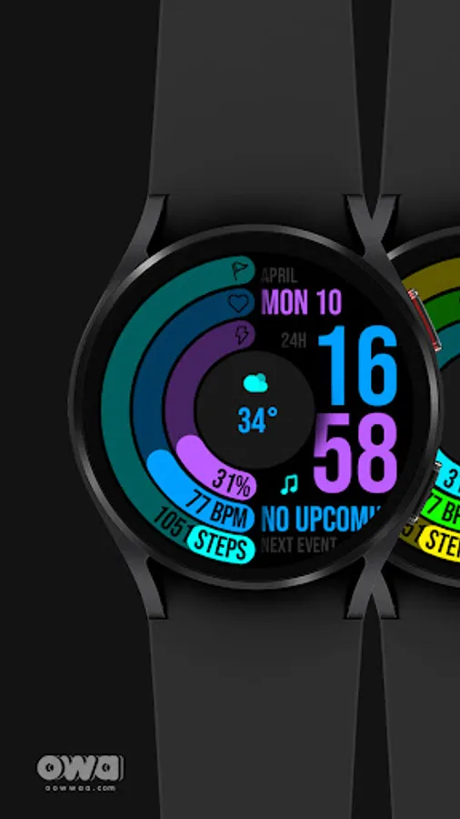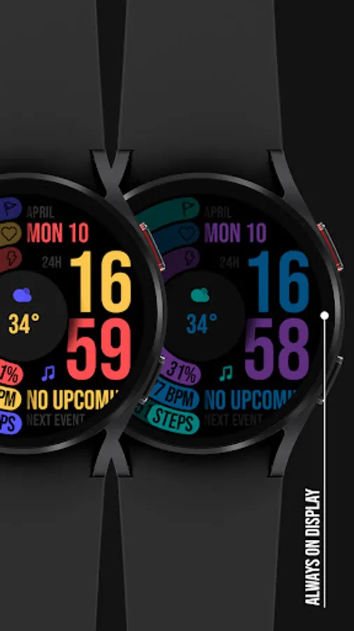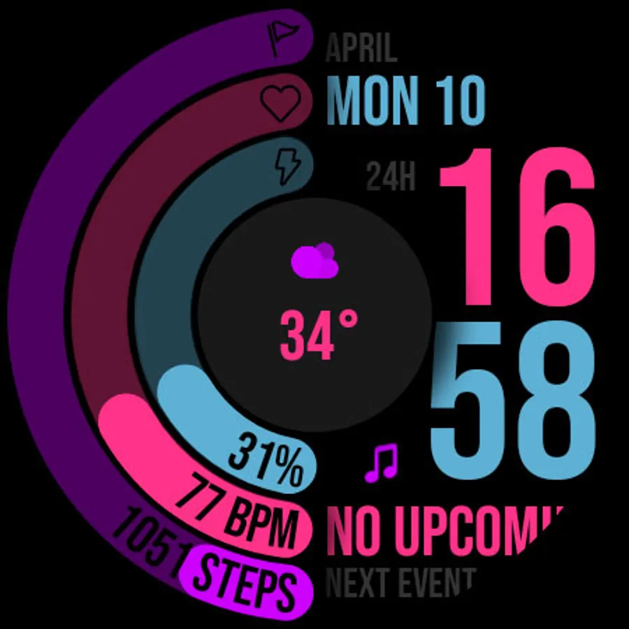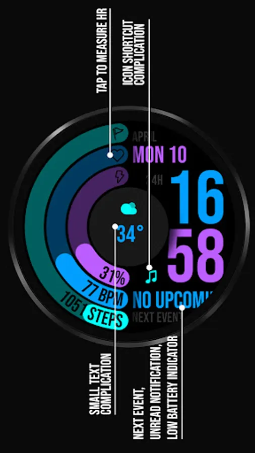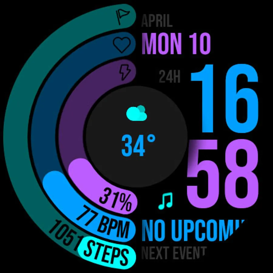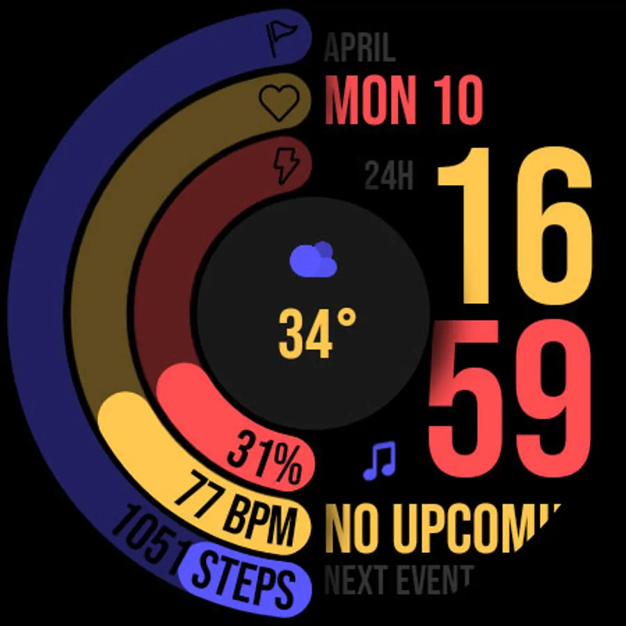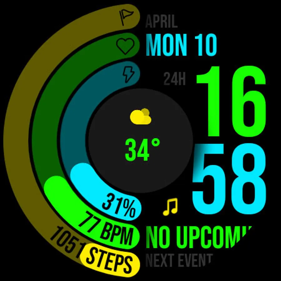 Dynamic information display. notification count, Next event and low battery indication display work based on priority.