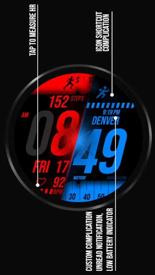 Dynamic information display. The notification count, custom complication, and low battery indication display are based on priority.