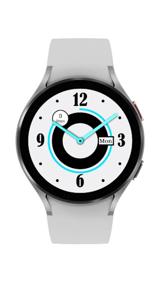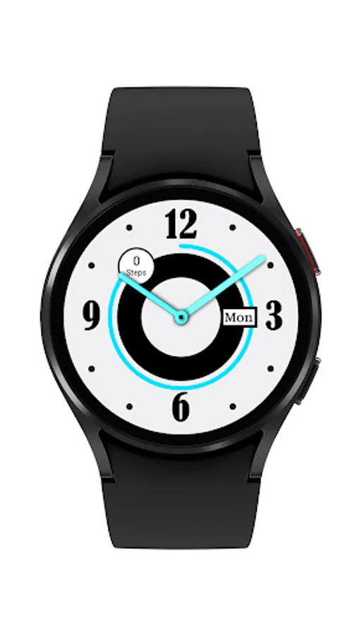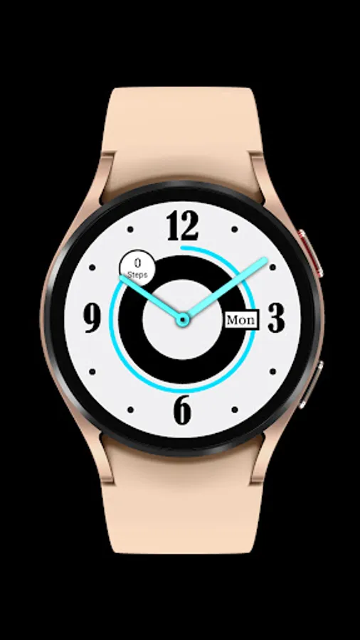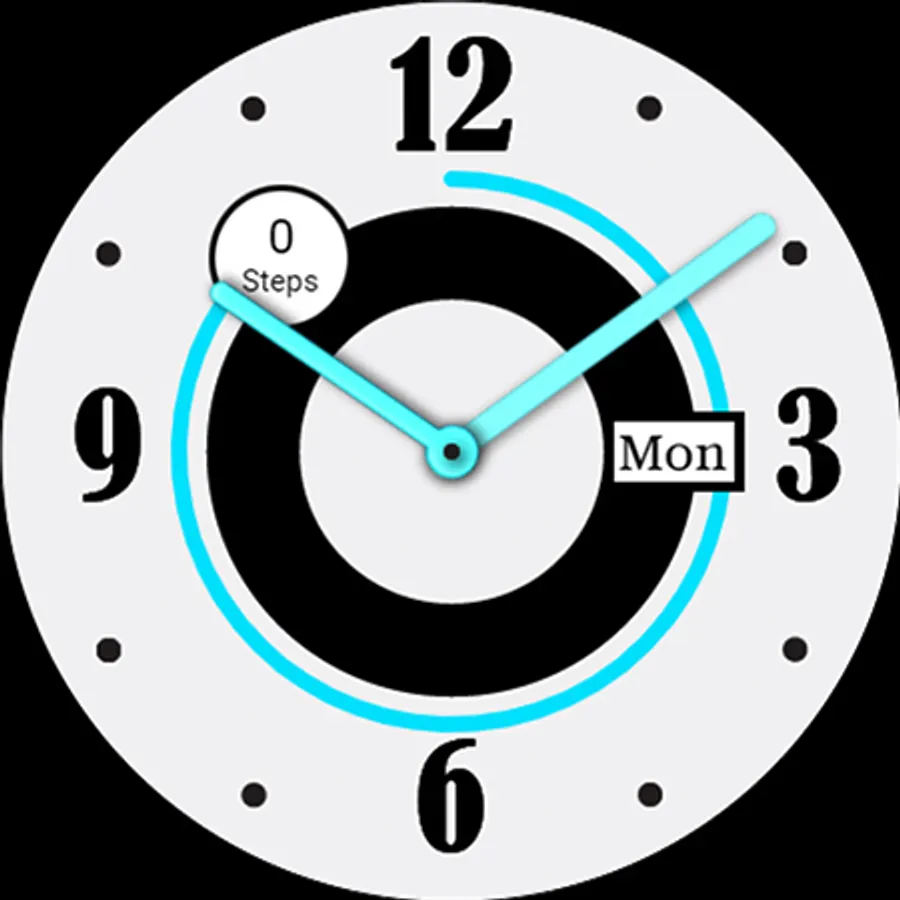 This is a simple watch face with one customizable text complication you can use to see steps count or other information. Battery percentage remaining is represented as a circular gauge in electric blue. the day of the week changes. Hours and Minutes are shown via analog watch hands.