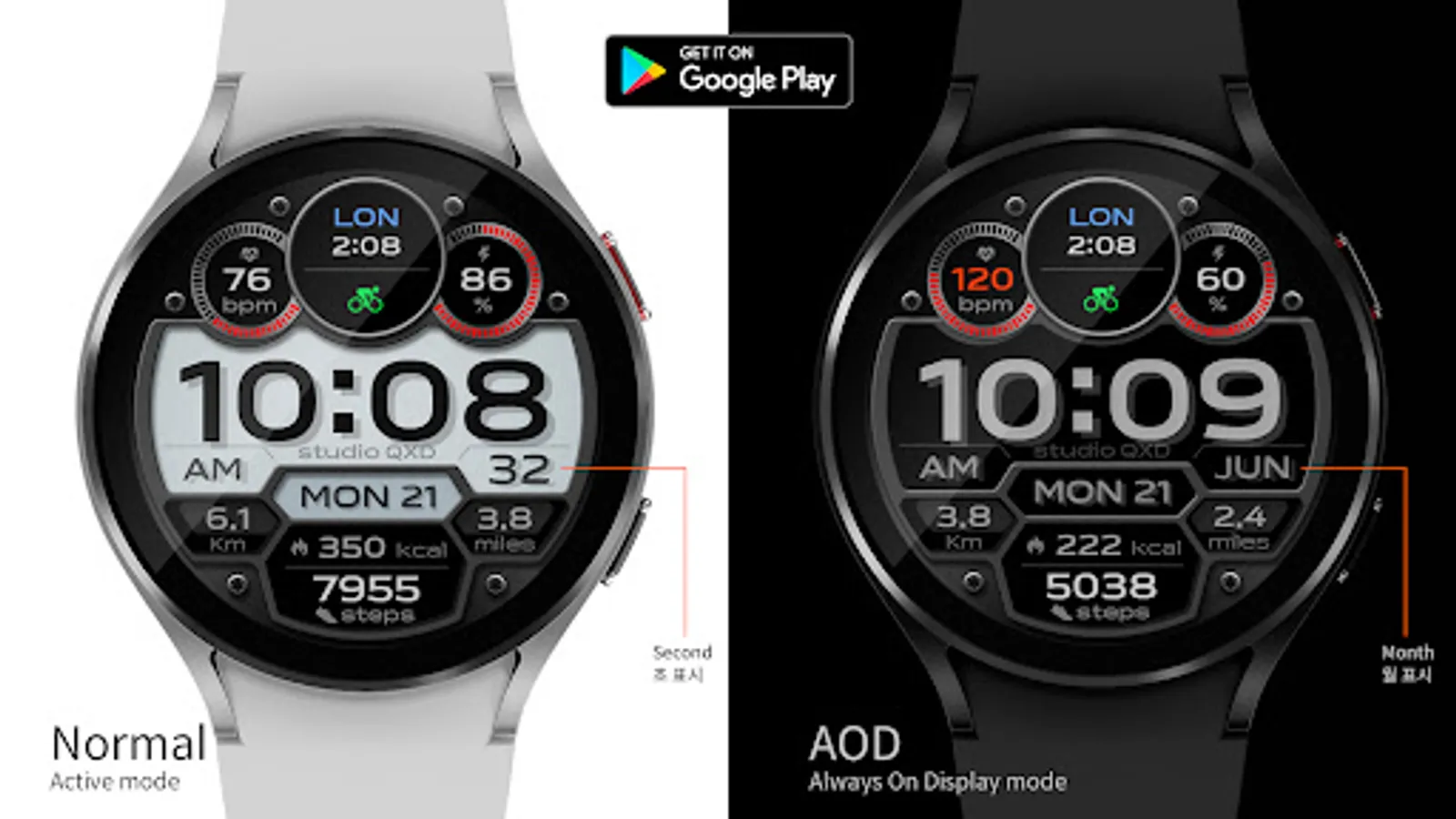 - Step counts, Kcal burning, and Distance (Km/mile) display